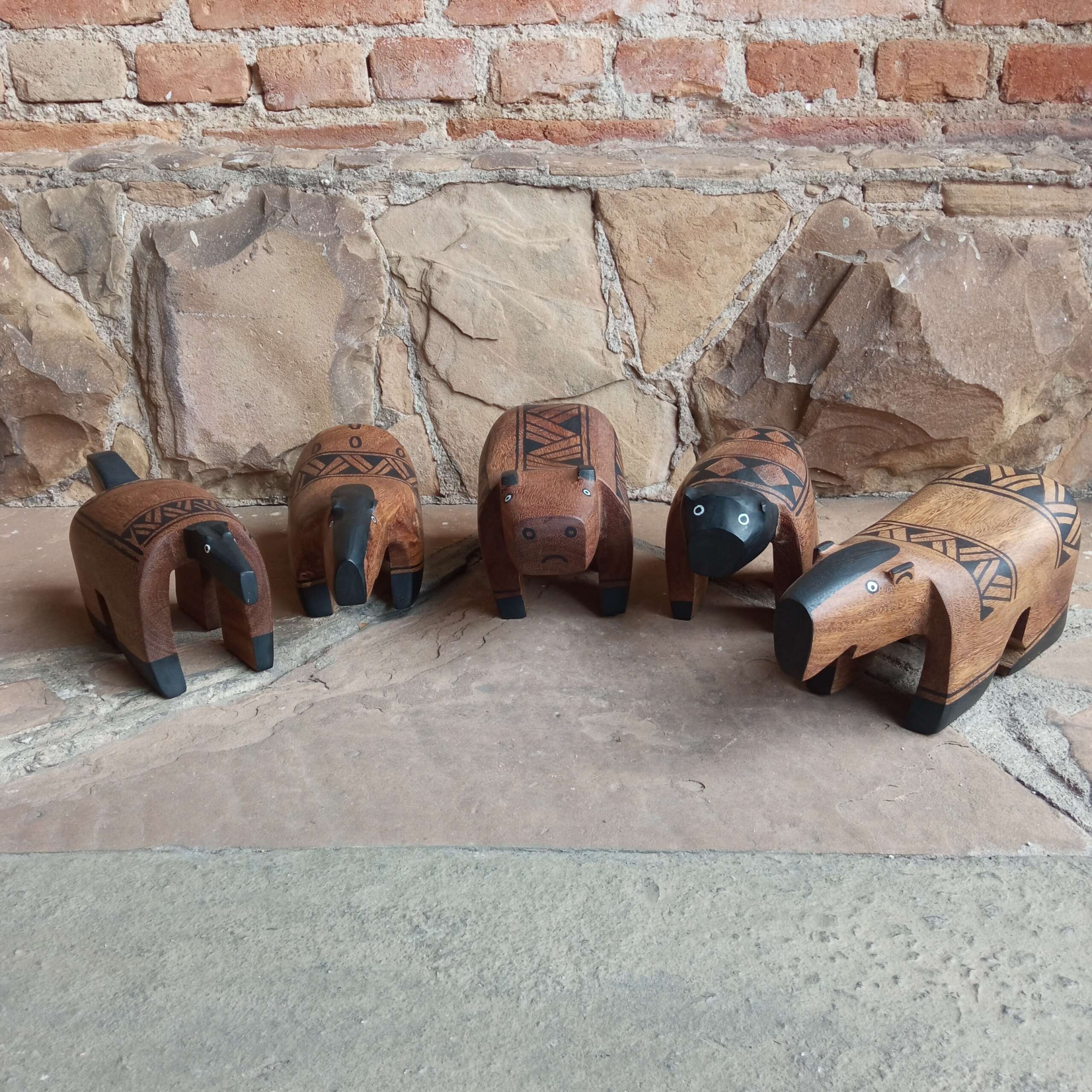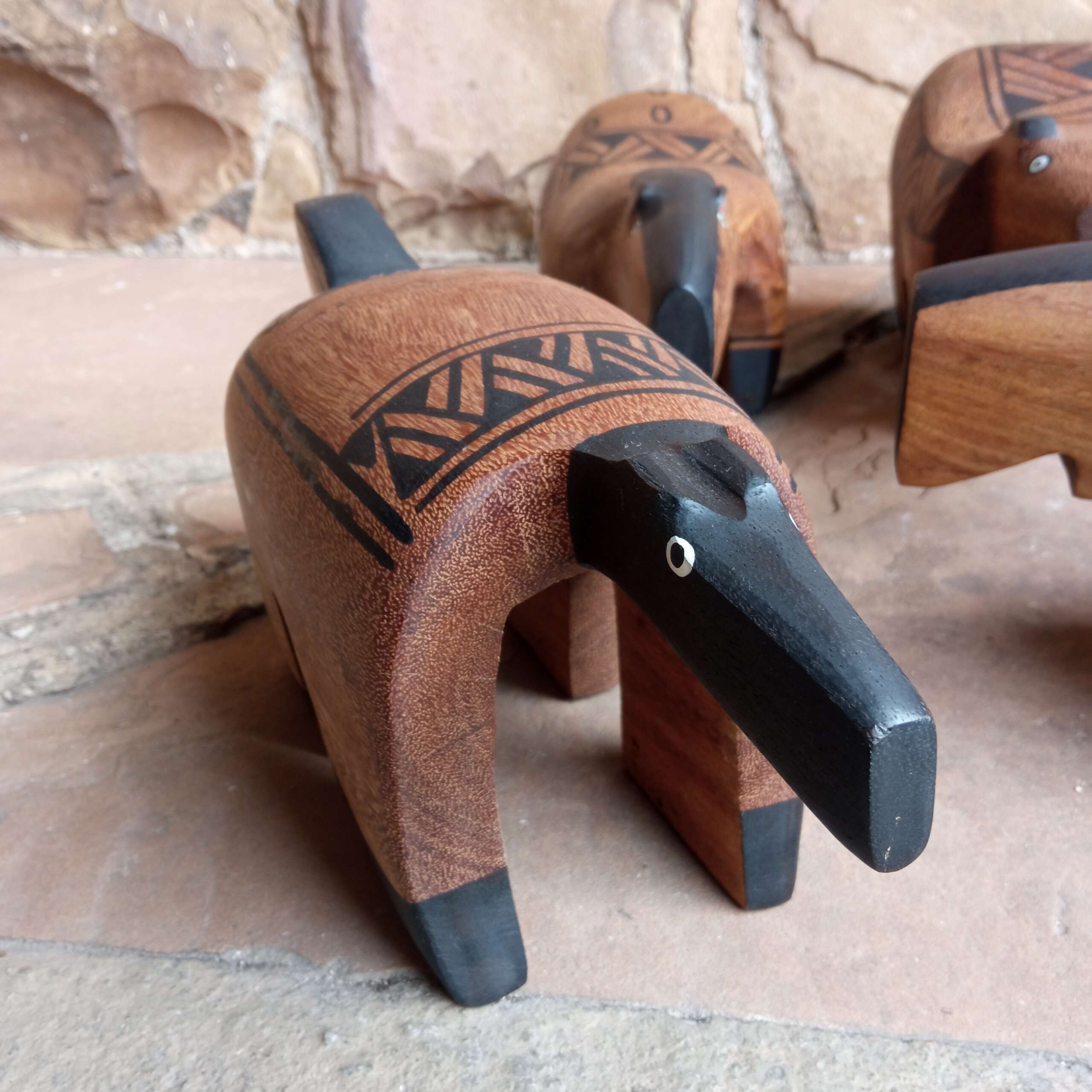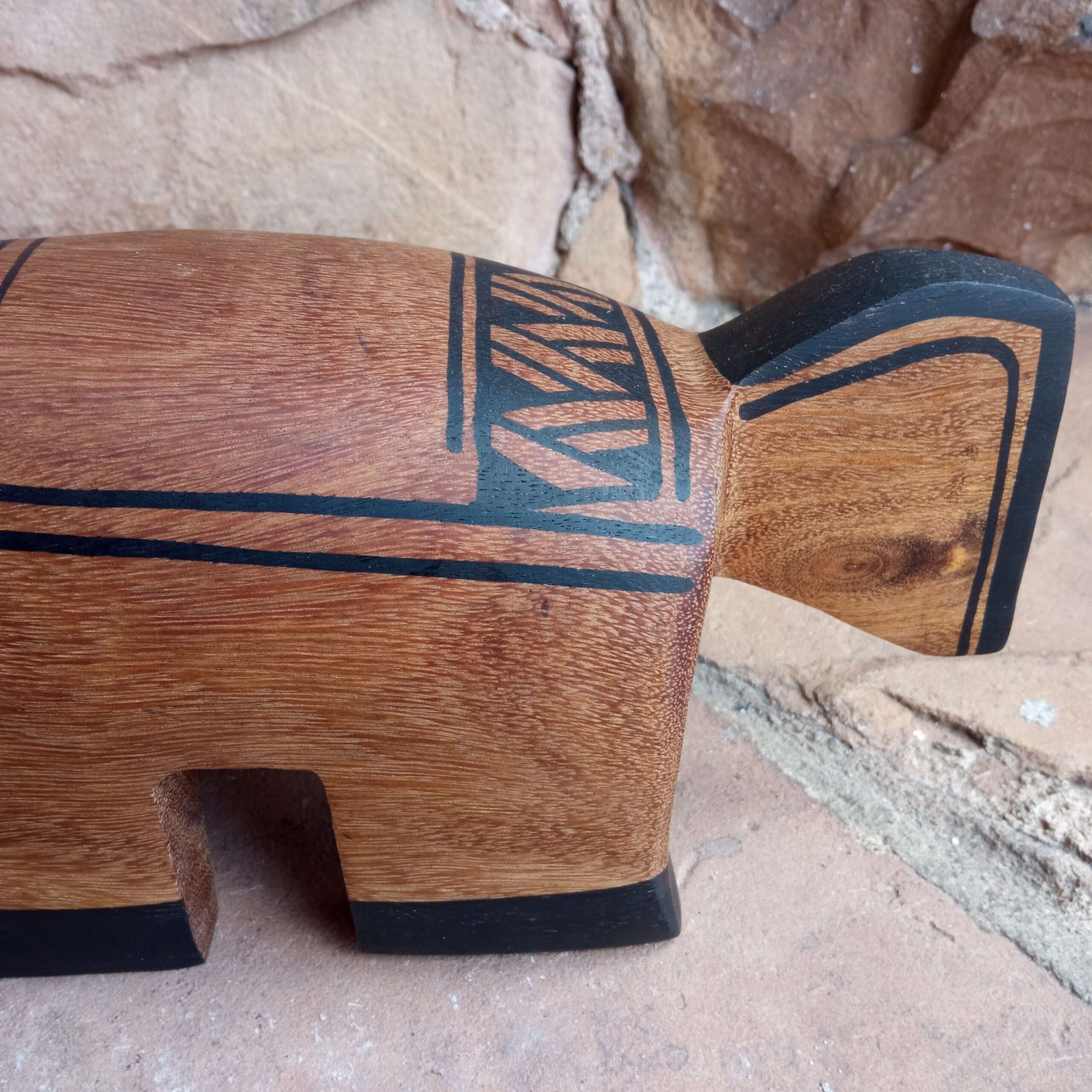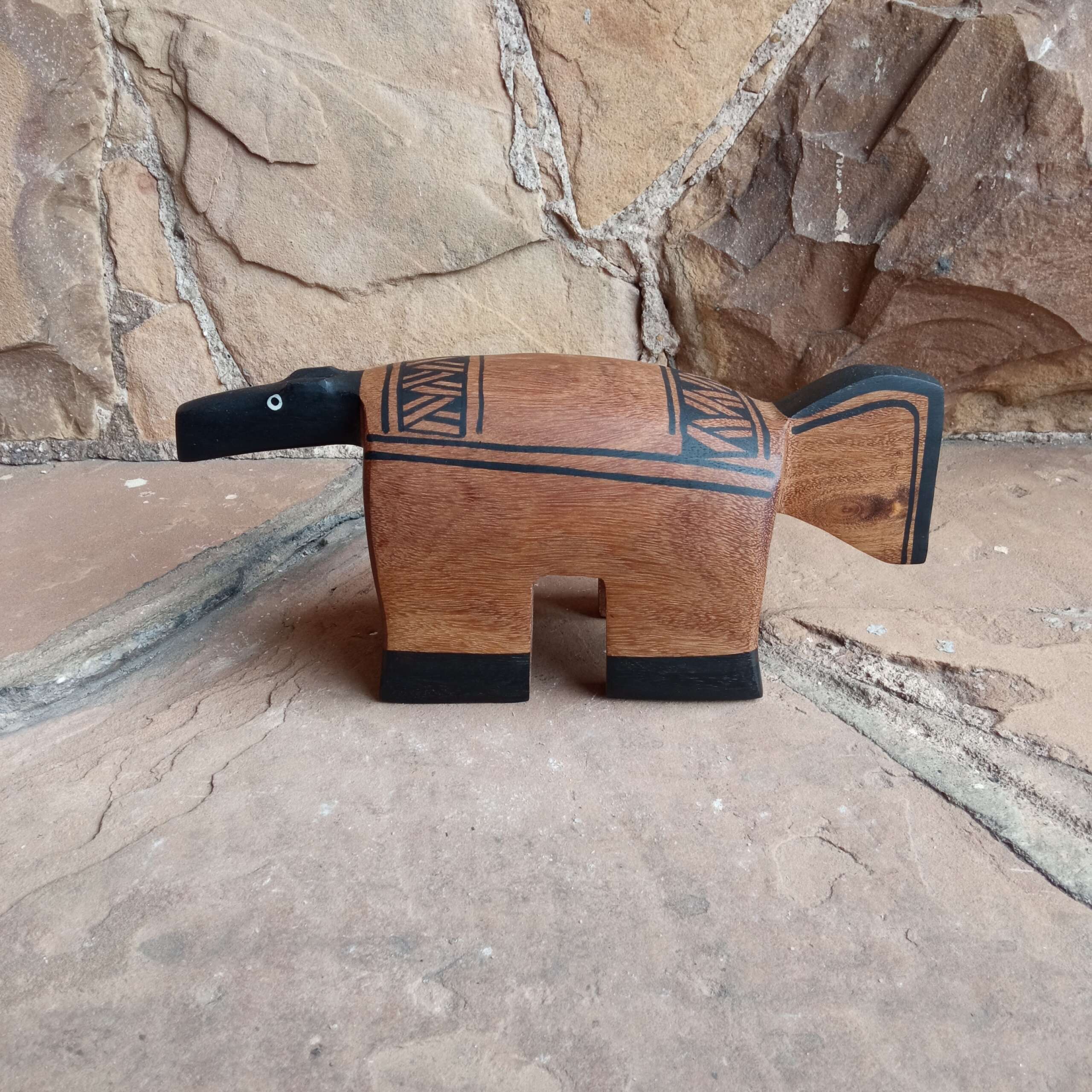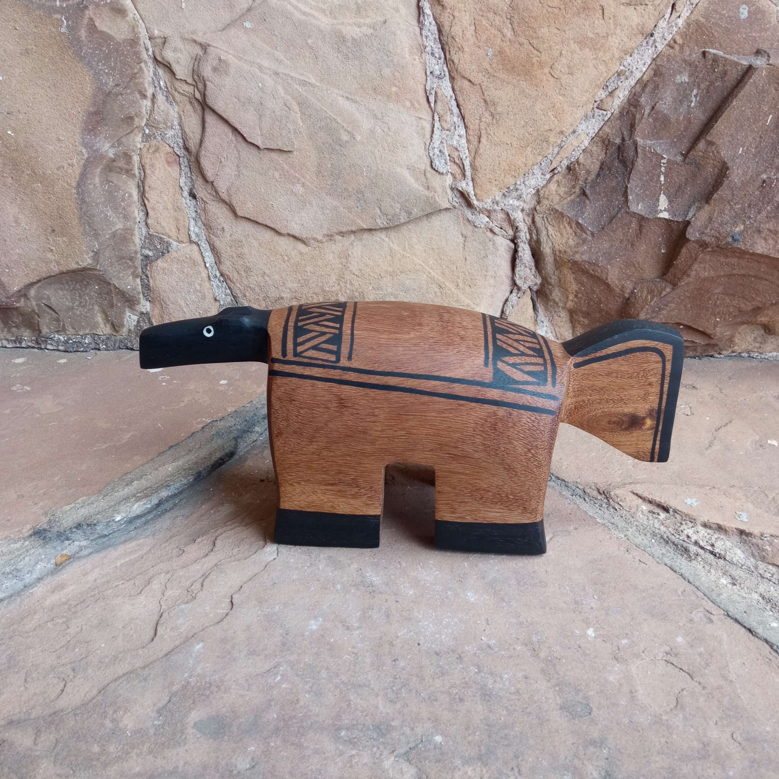 Banco zoomorfo entalhado em madeira em forma de tamanduá, Povo Waurá, Alto Xingu. Grafismos feitos pela tintura de carvão e urucum.