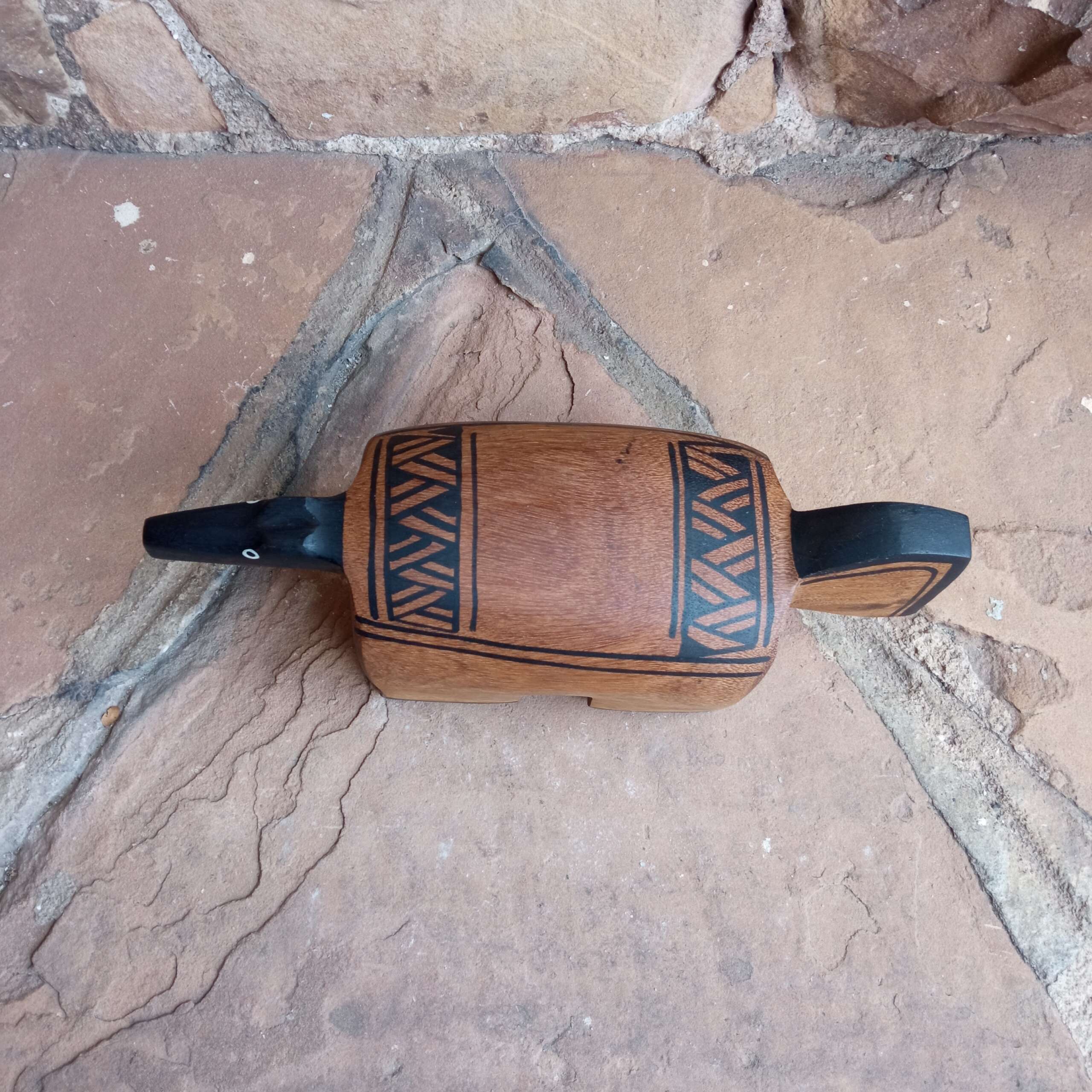 Banco do Povo Waurá, entalhado em forma de bicho com grafismos.