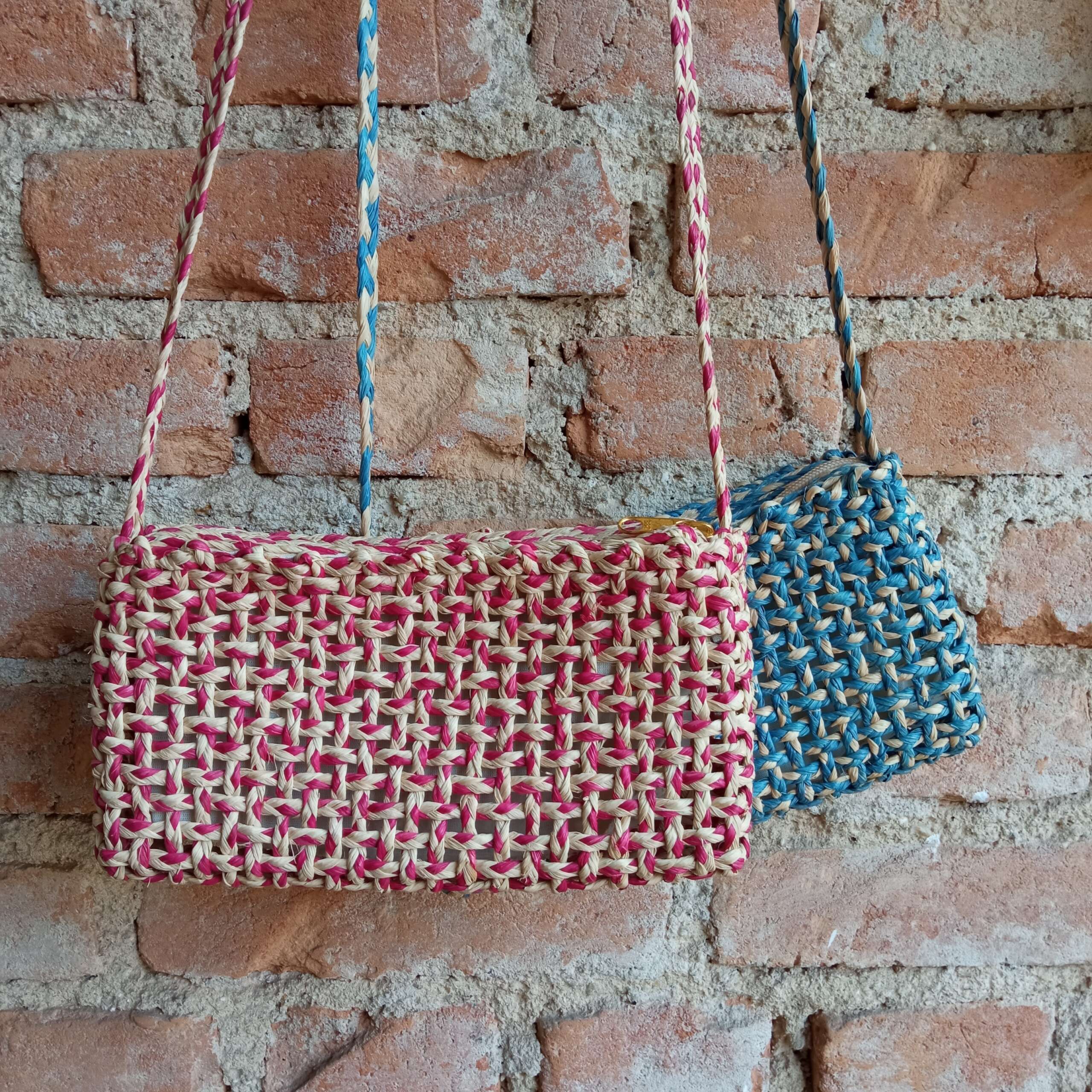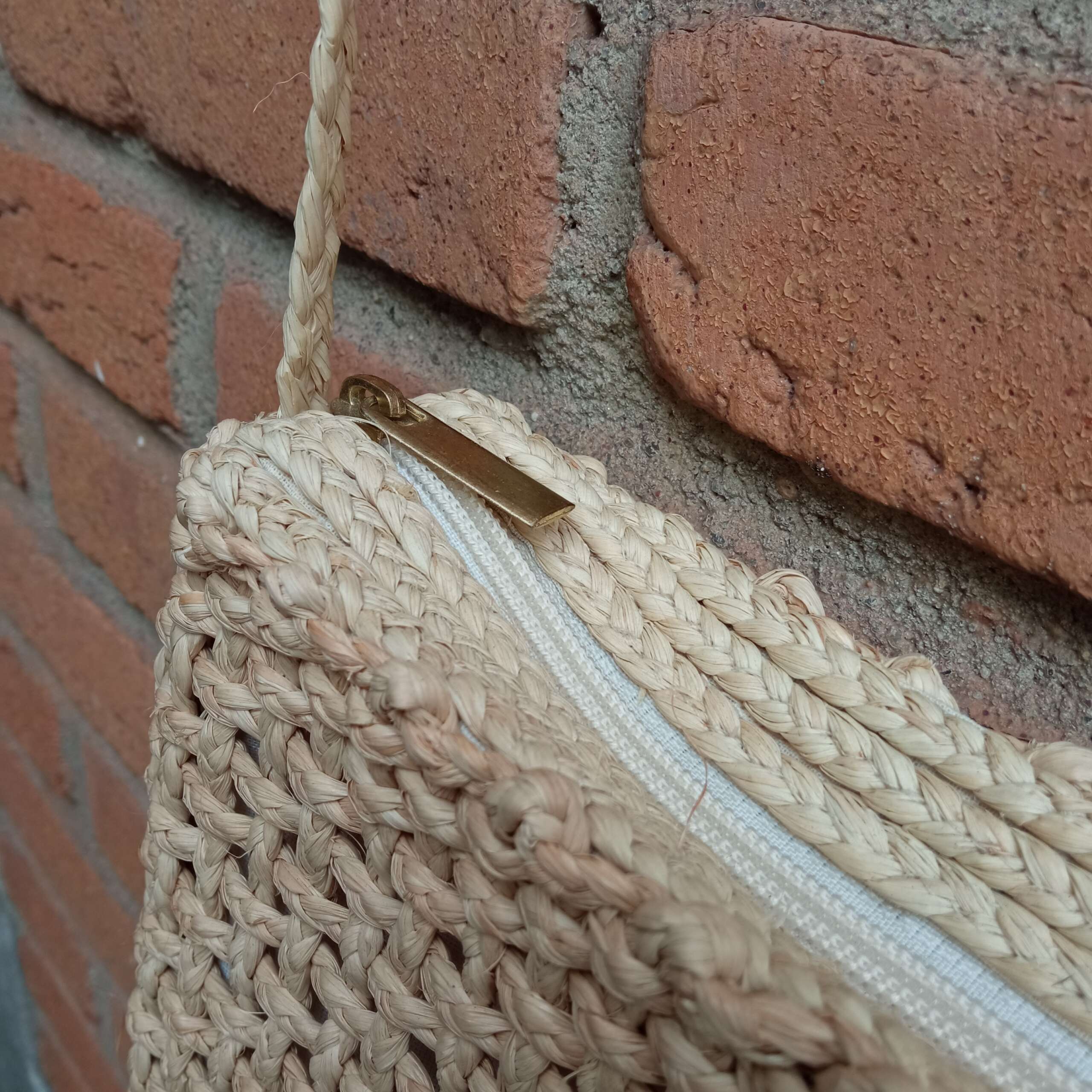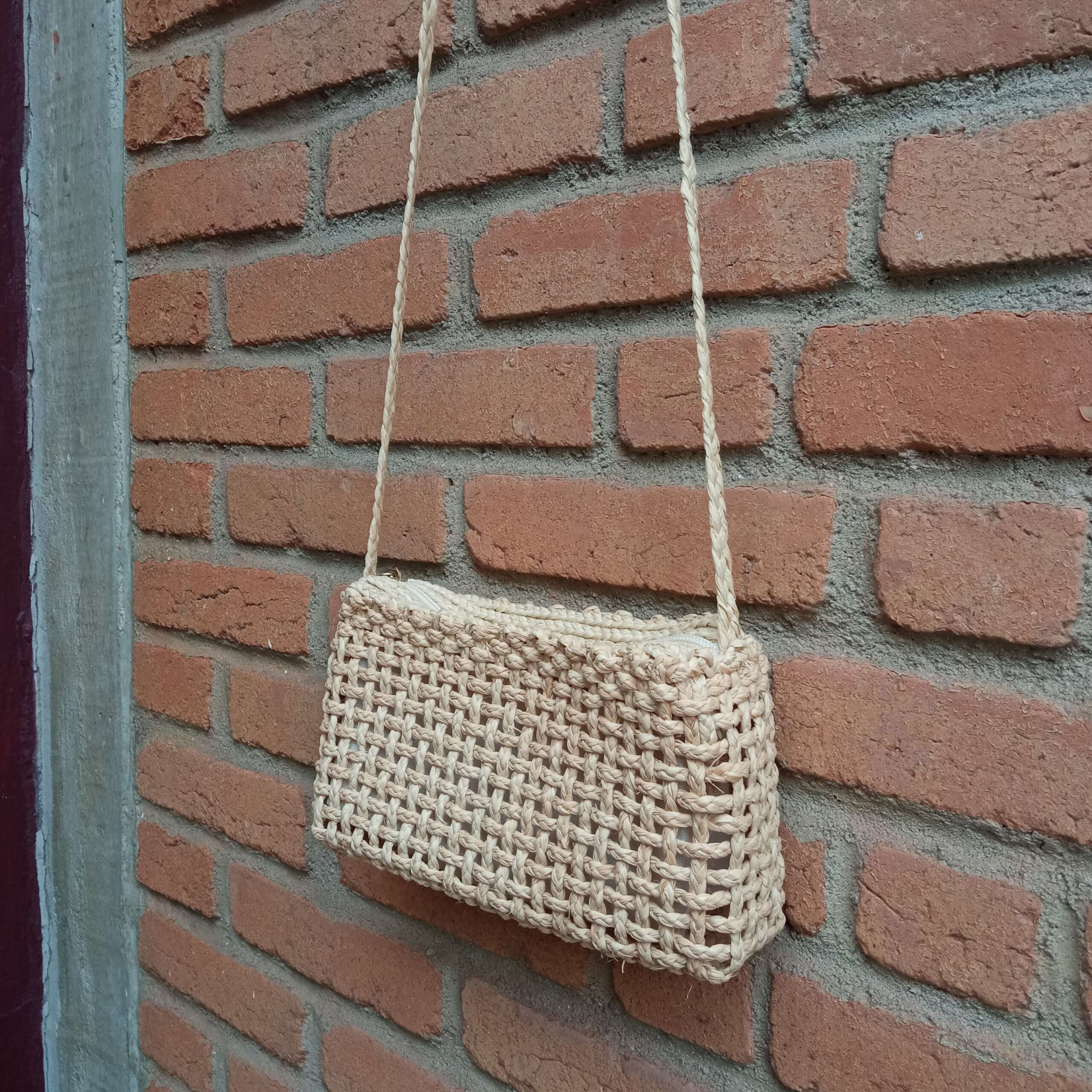 Bolsa forrada com zíper feita da fibra de buriti, em macramê.