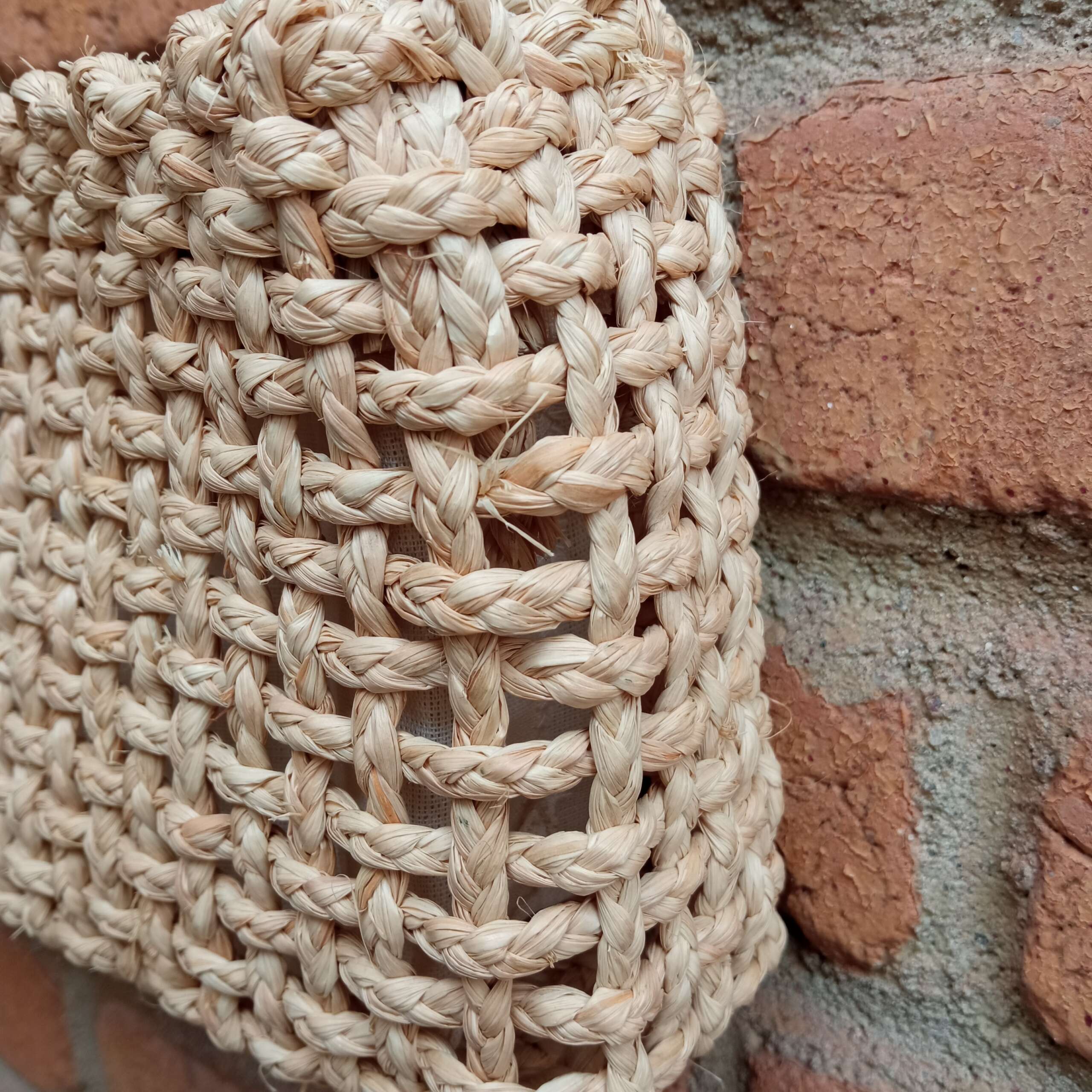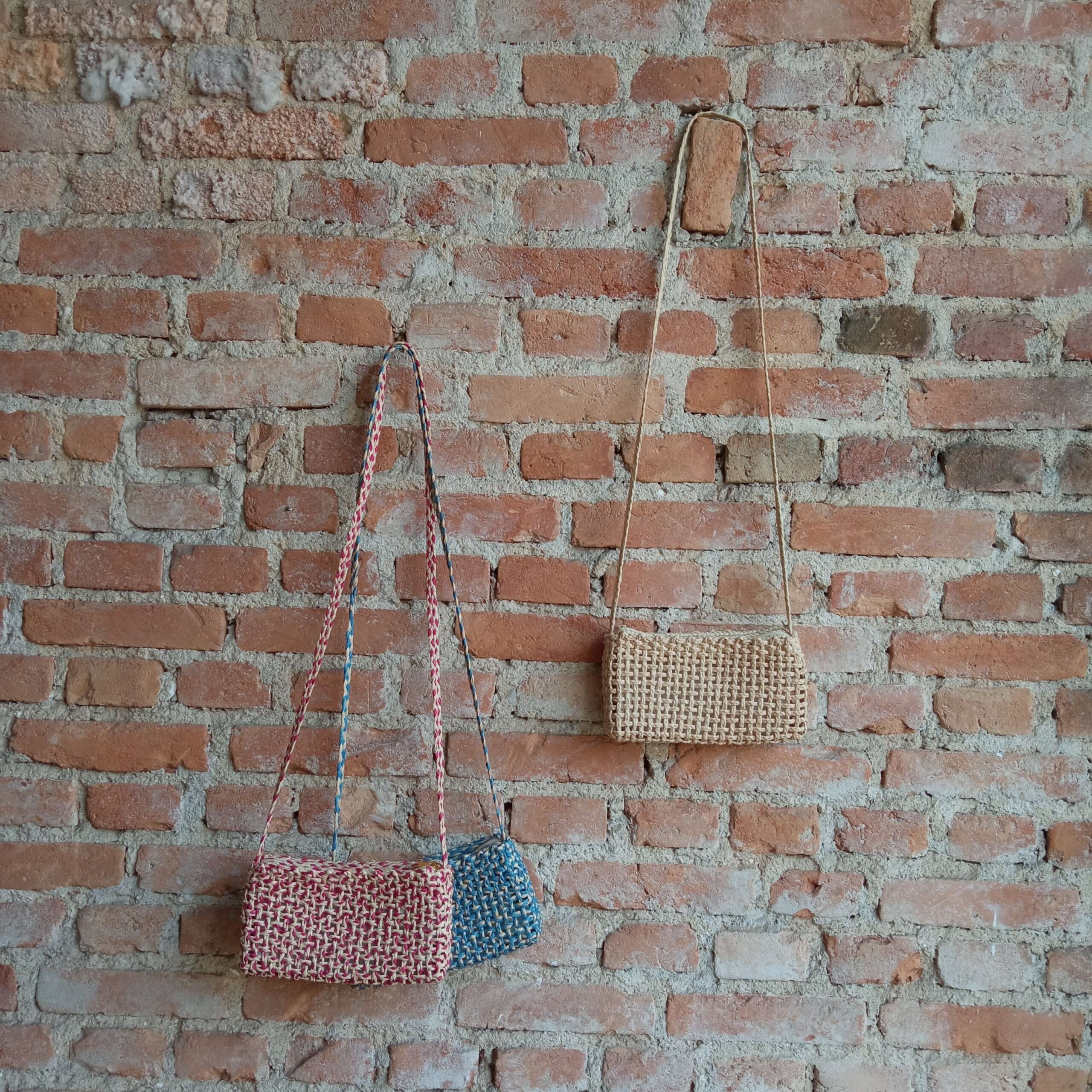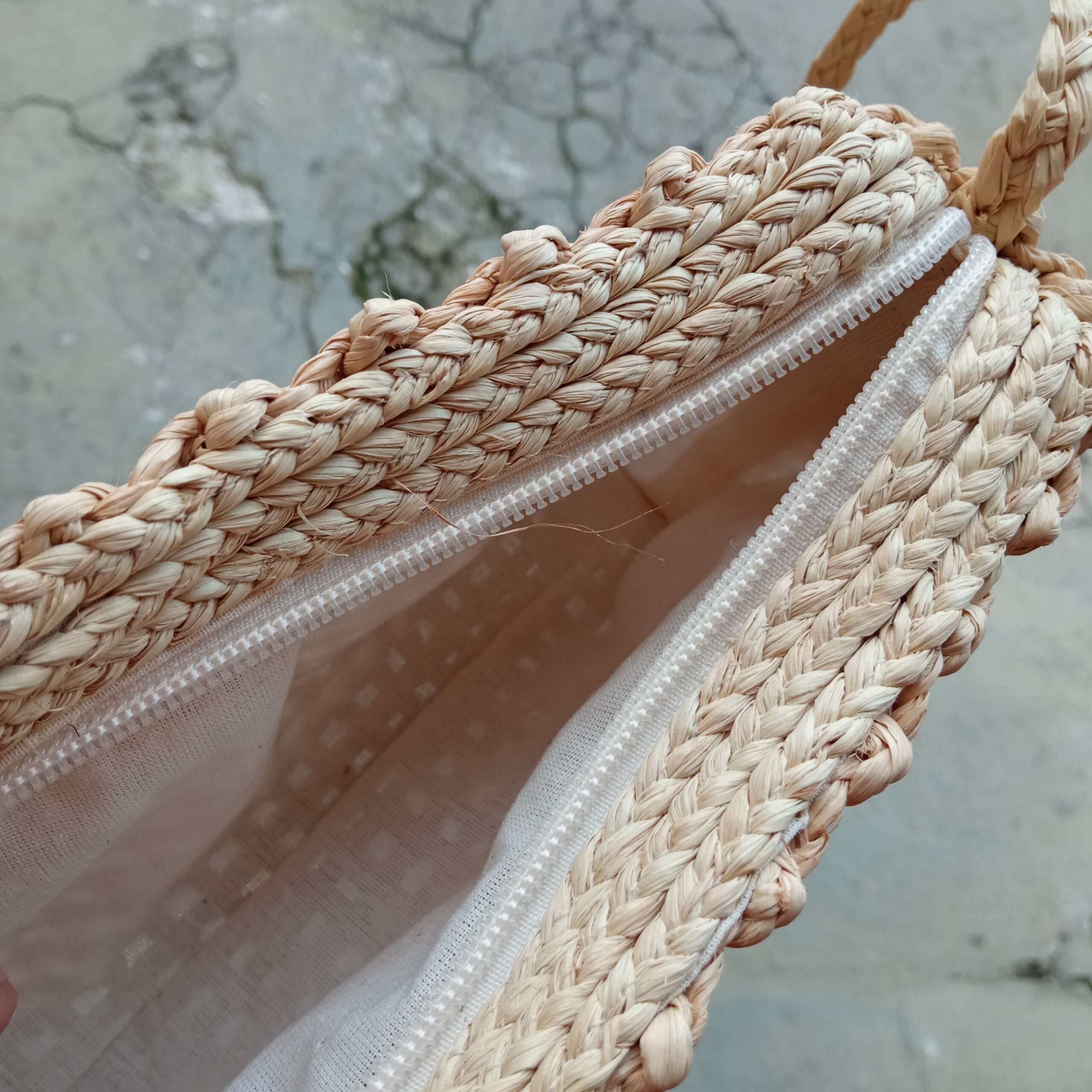 Bolsa forrada com zíper feita da fibra de buriti, em macramê.