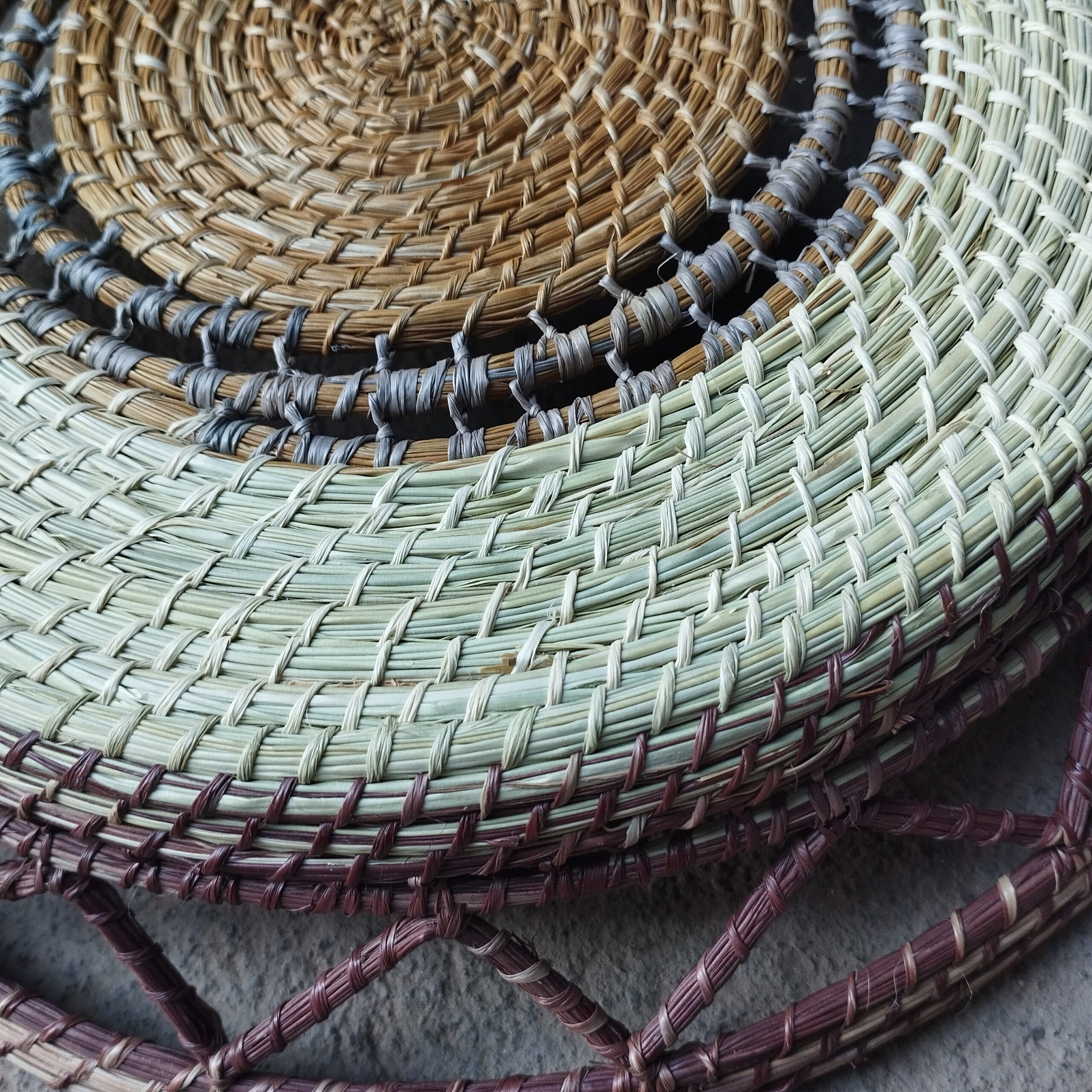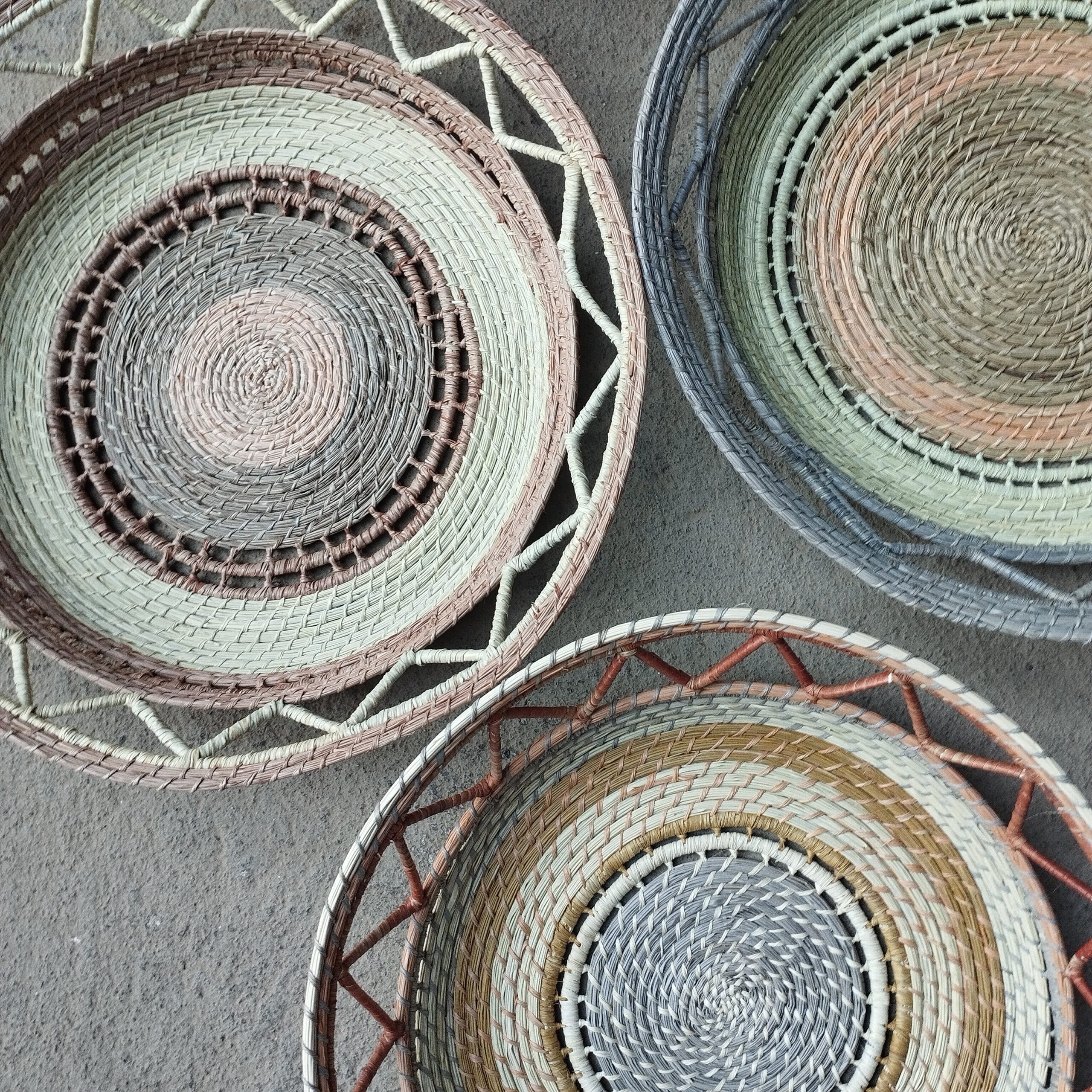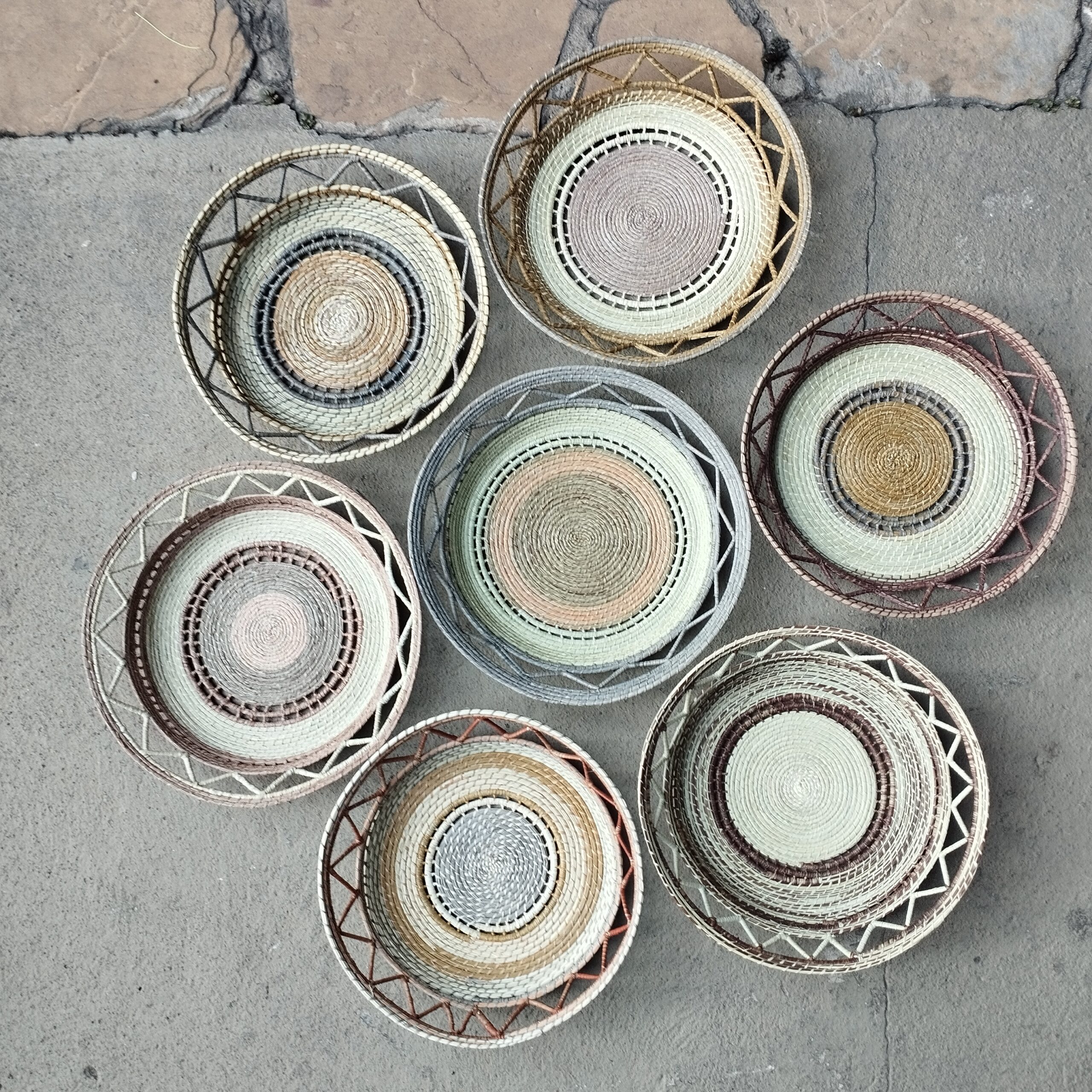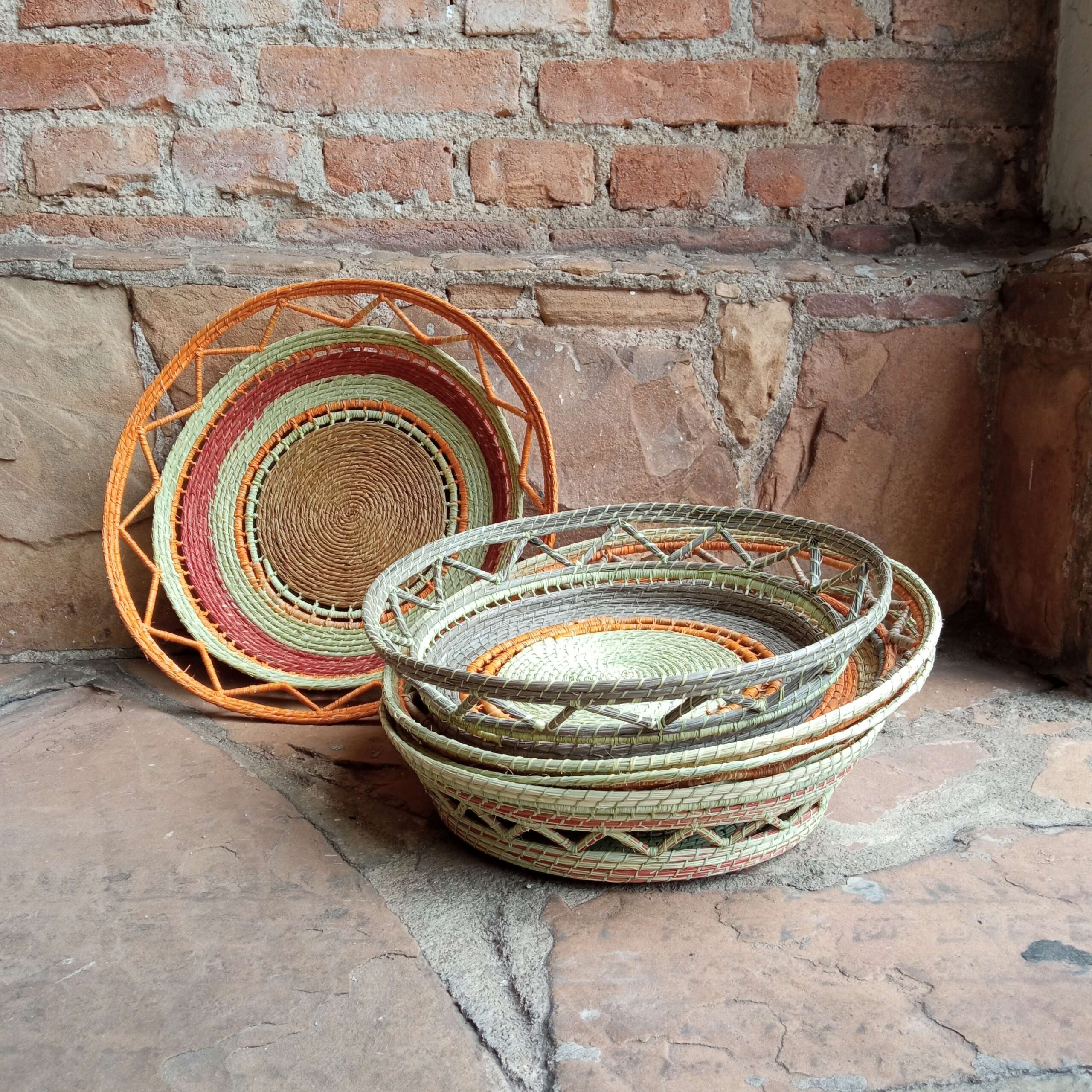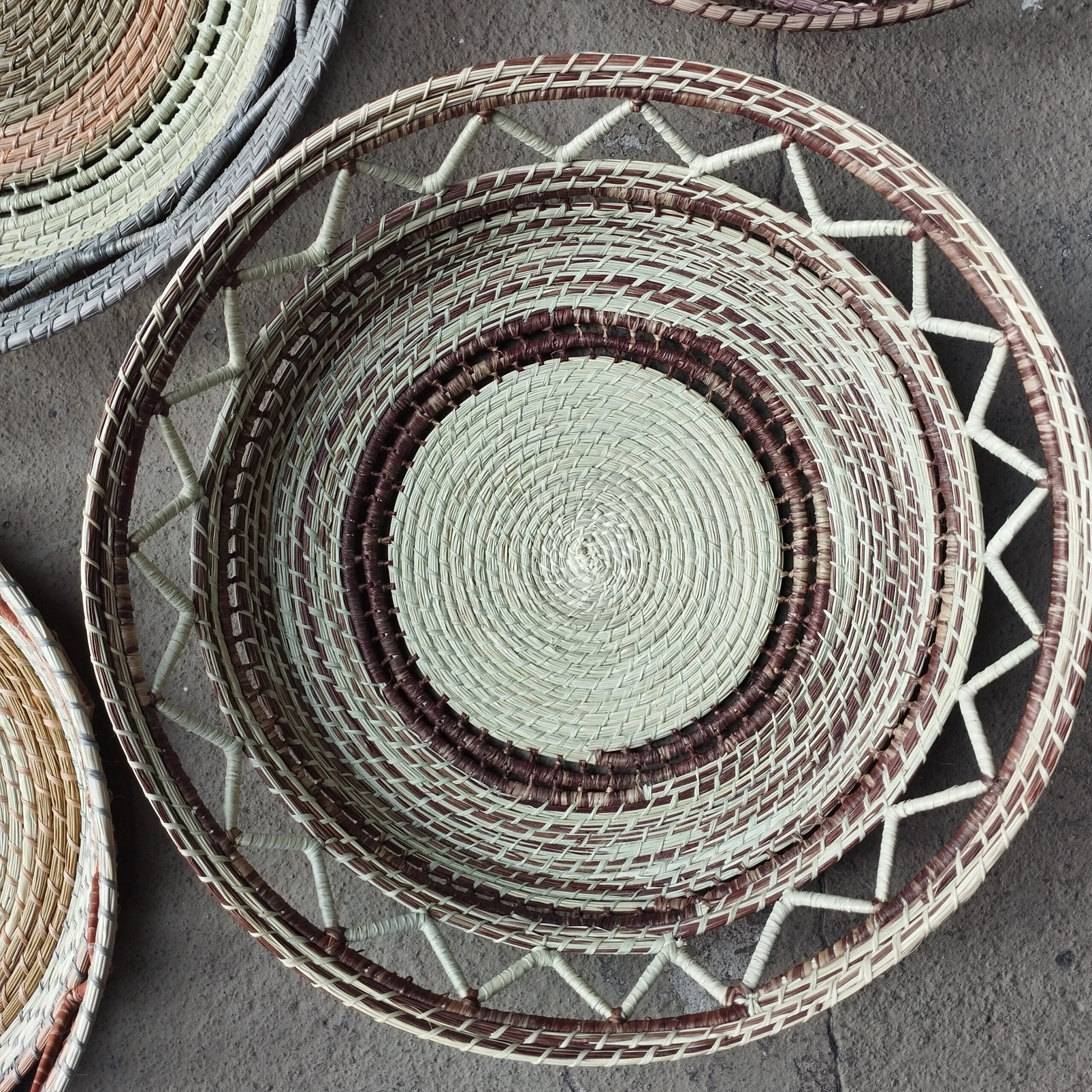 Cesta tipo fruteira trançada em palha de ouricuri ou licuri e tingimento natural.