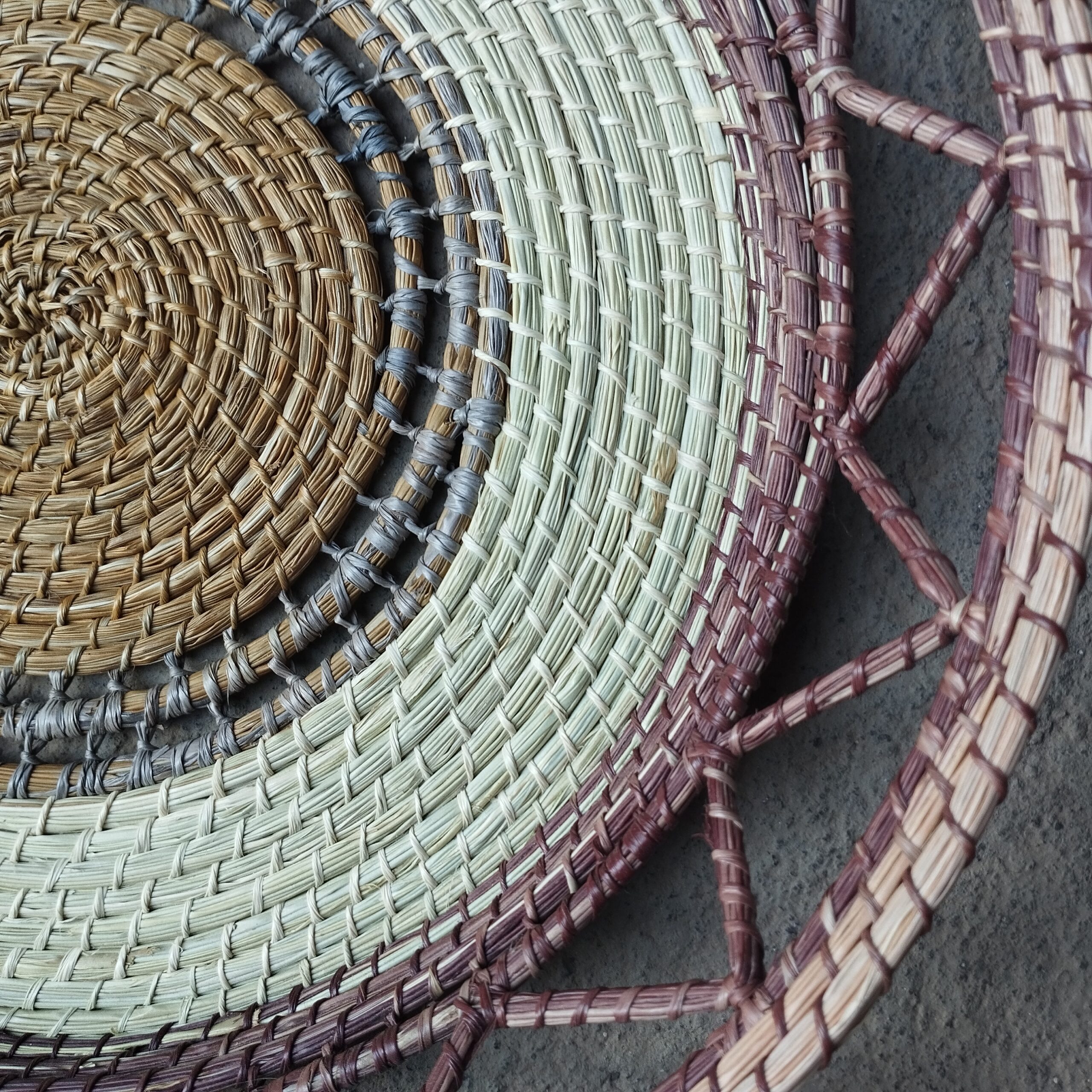Cesta trançada em palha de ouricuri e tingida naturalmente pela fervura da palha com folhas e raízes.