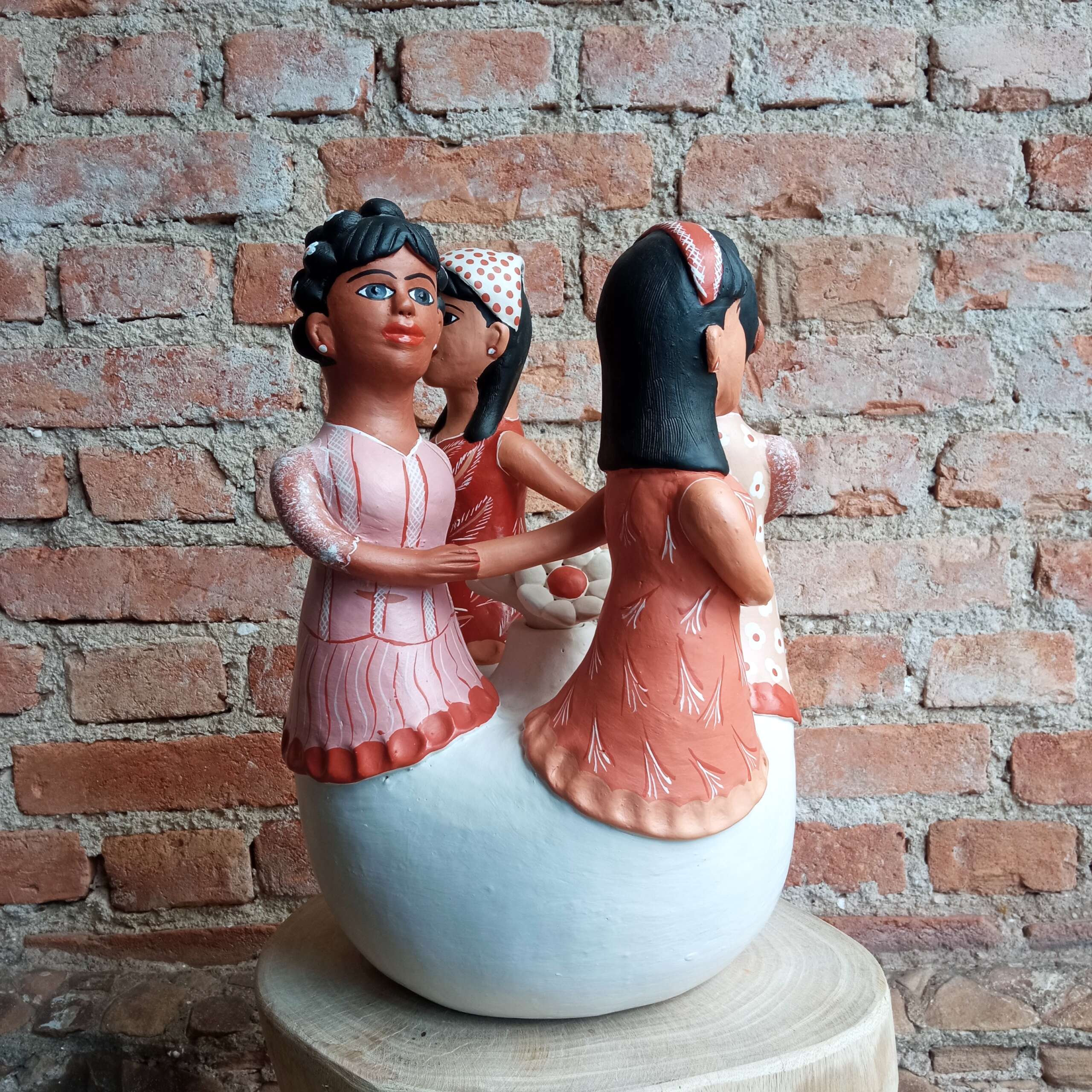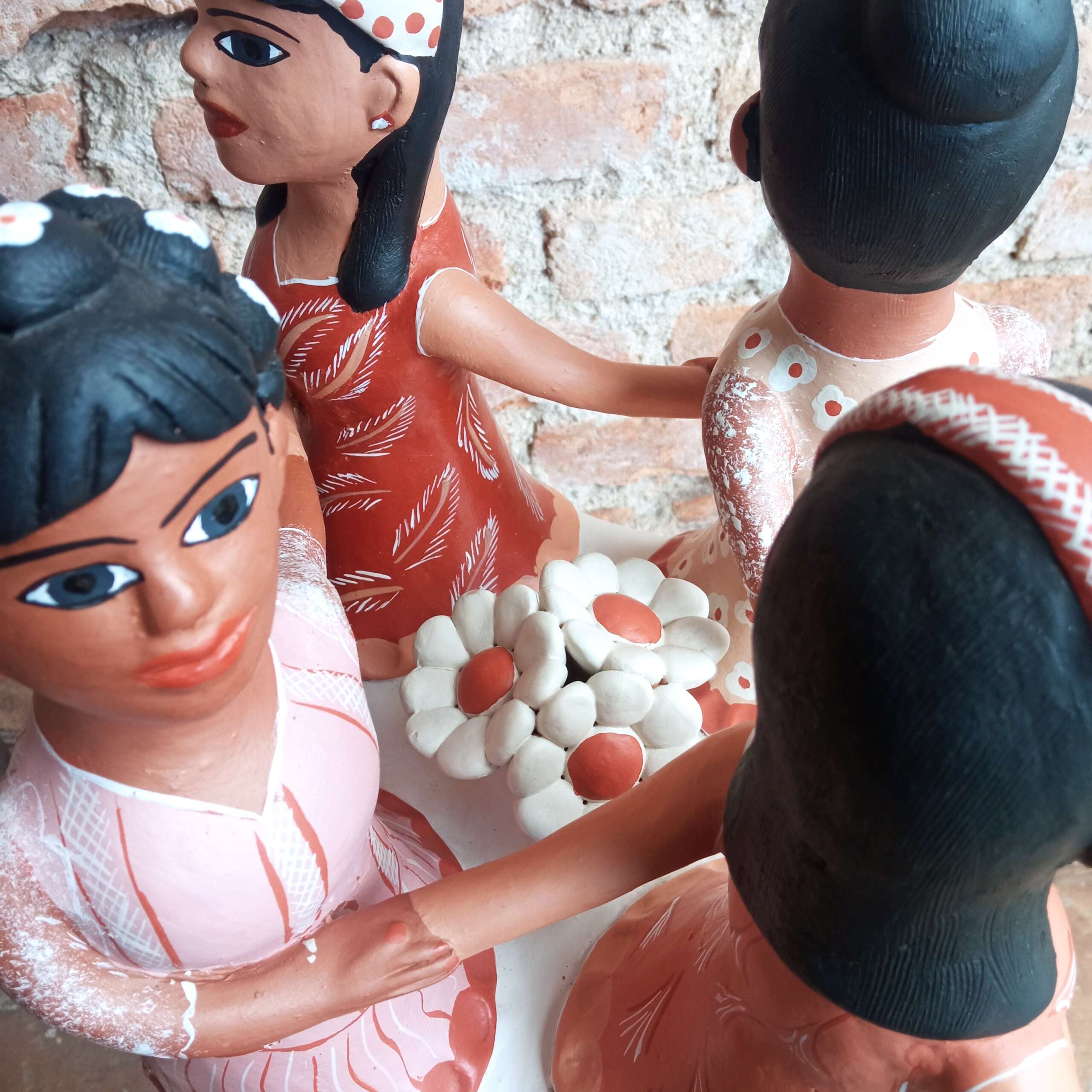 Escultura de ciranda de quatro mulheres, tradicional do Vale do Jequitinhonha, modelada em barro e pintada com o próprio barro. Confeccionada por mulheres em grande parte, sempre trazem traços e a postura da artista. Artista Conceição de Campo Alegre.