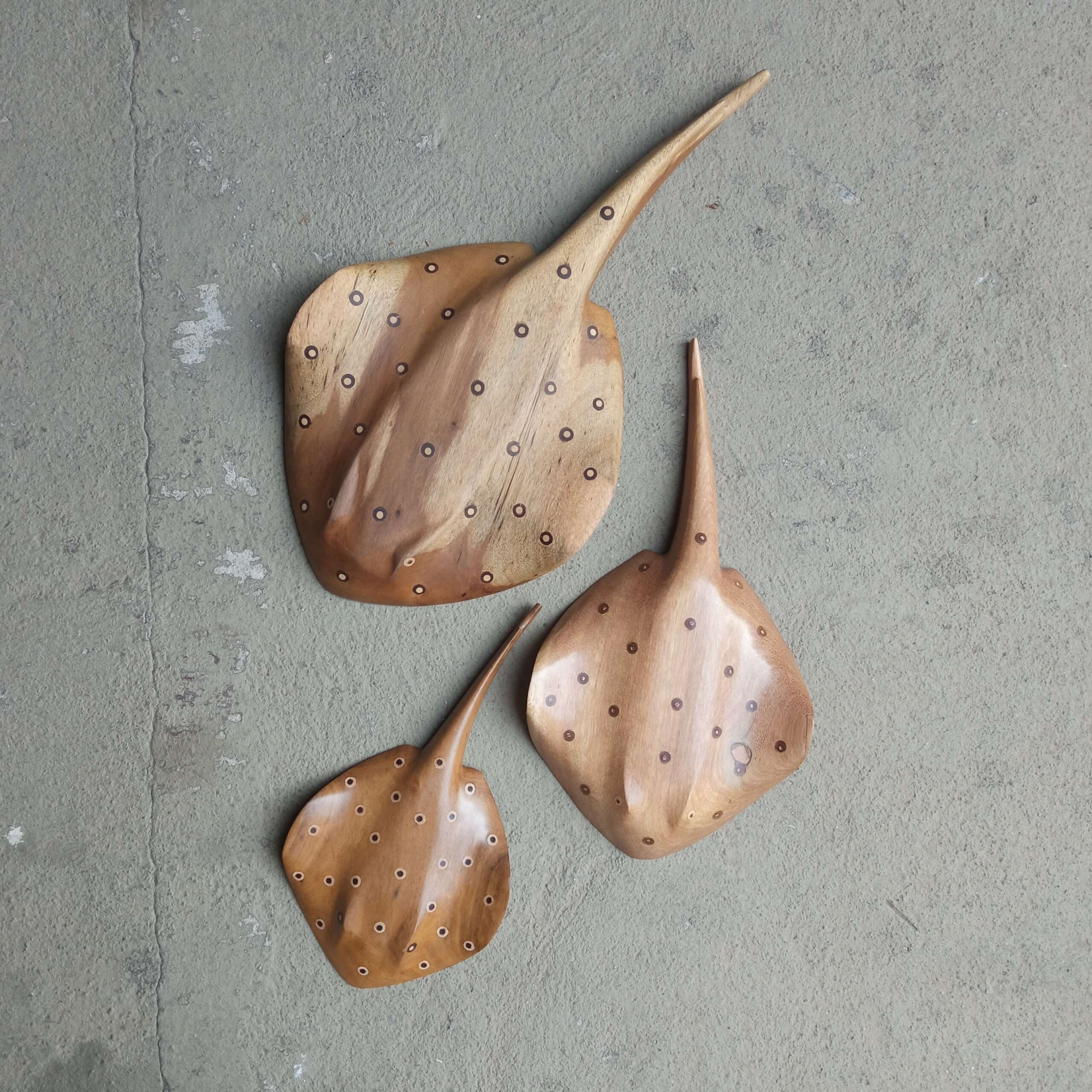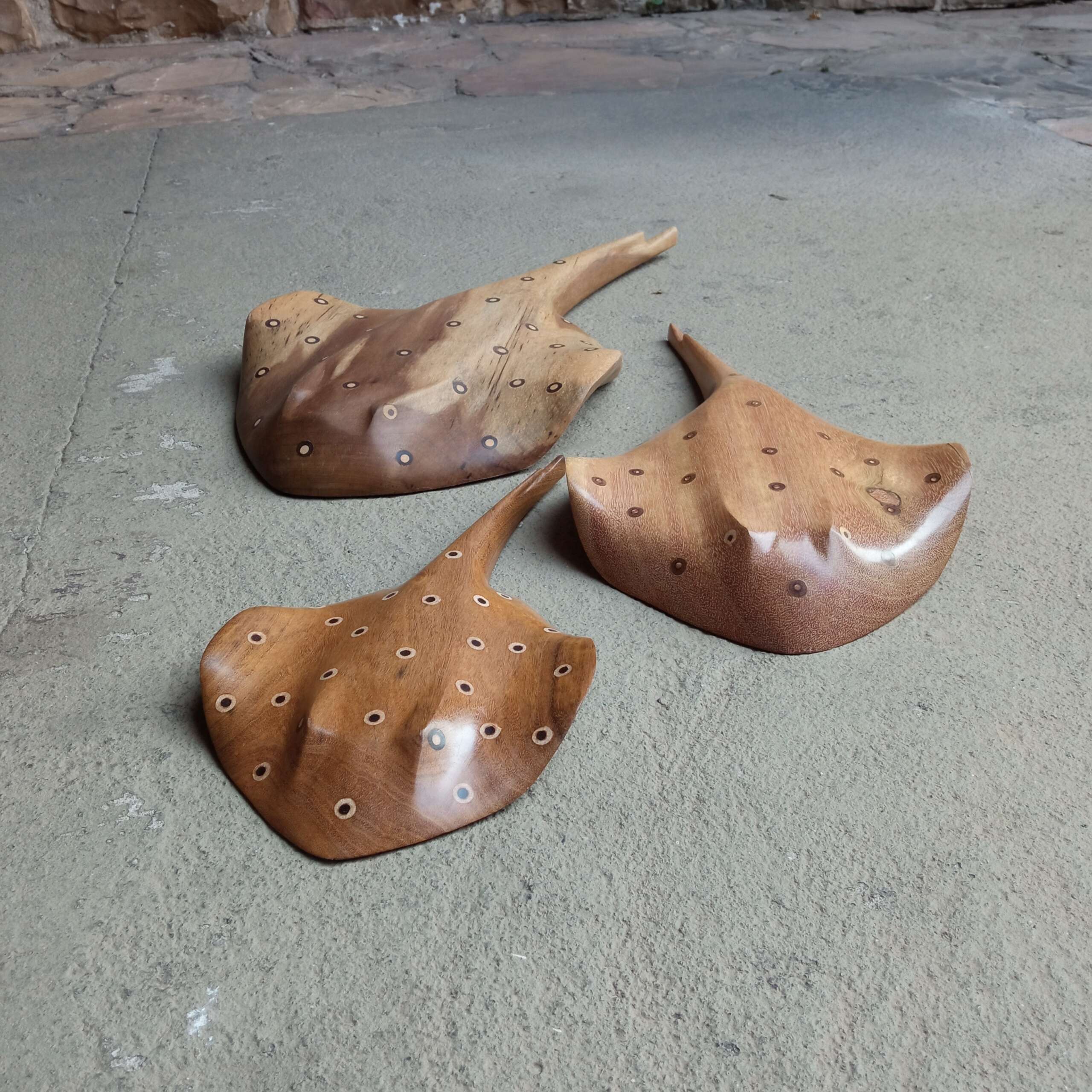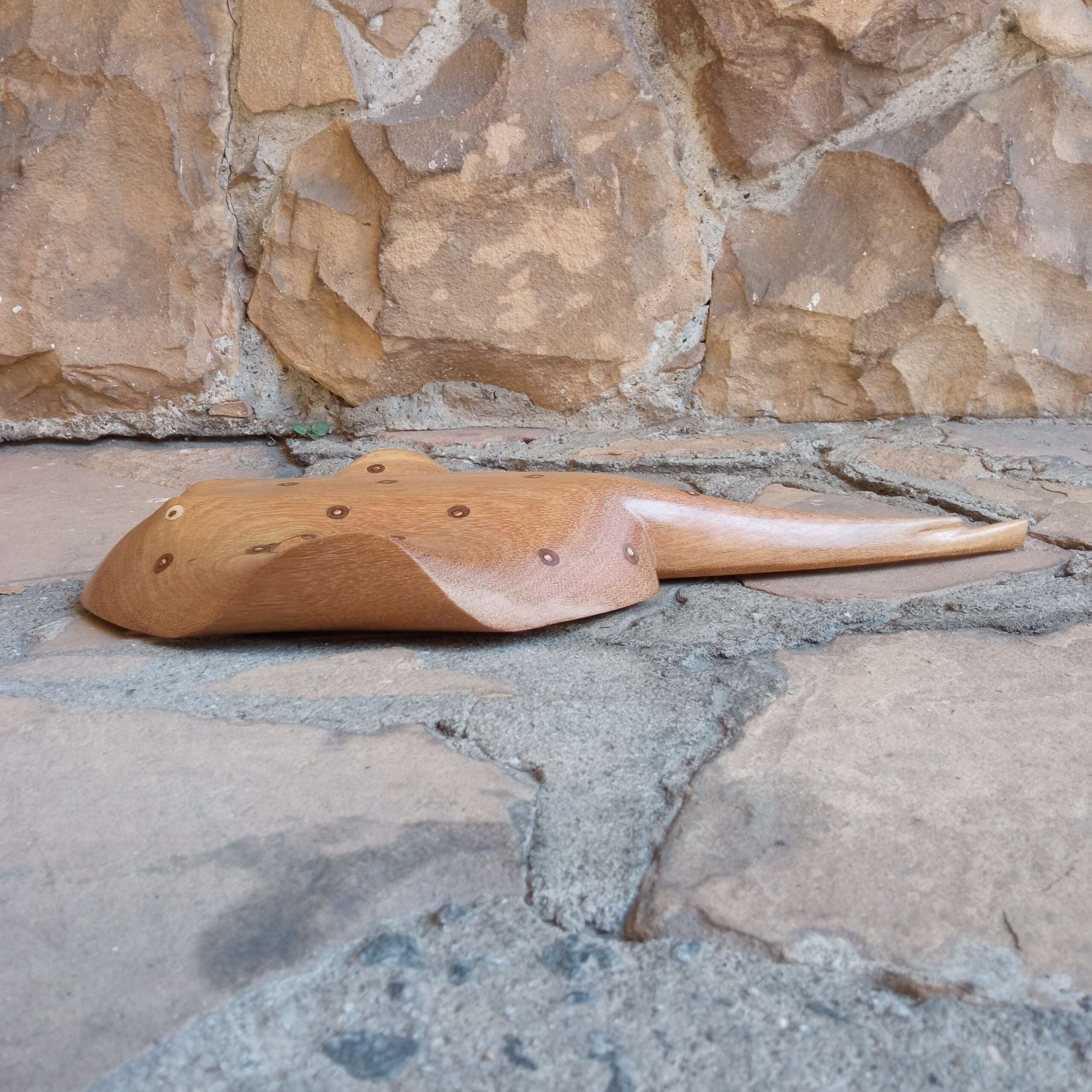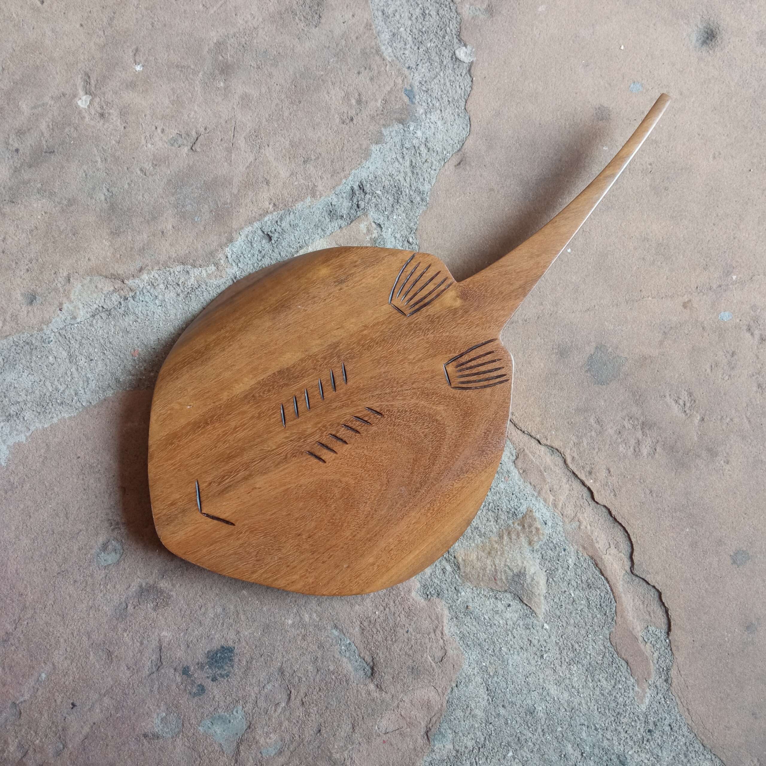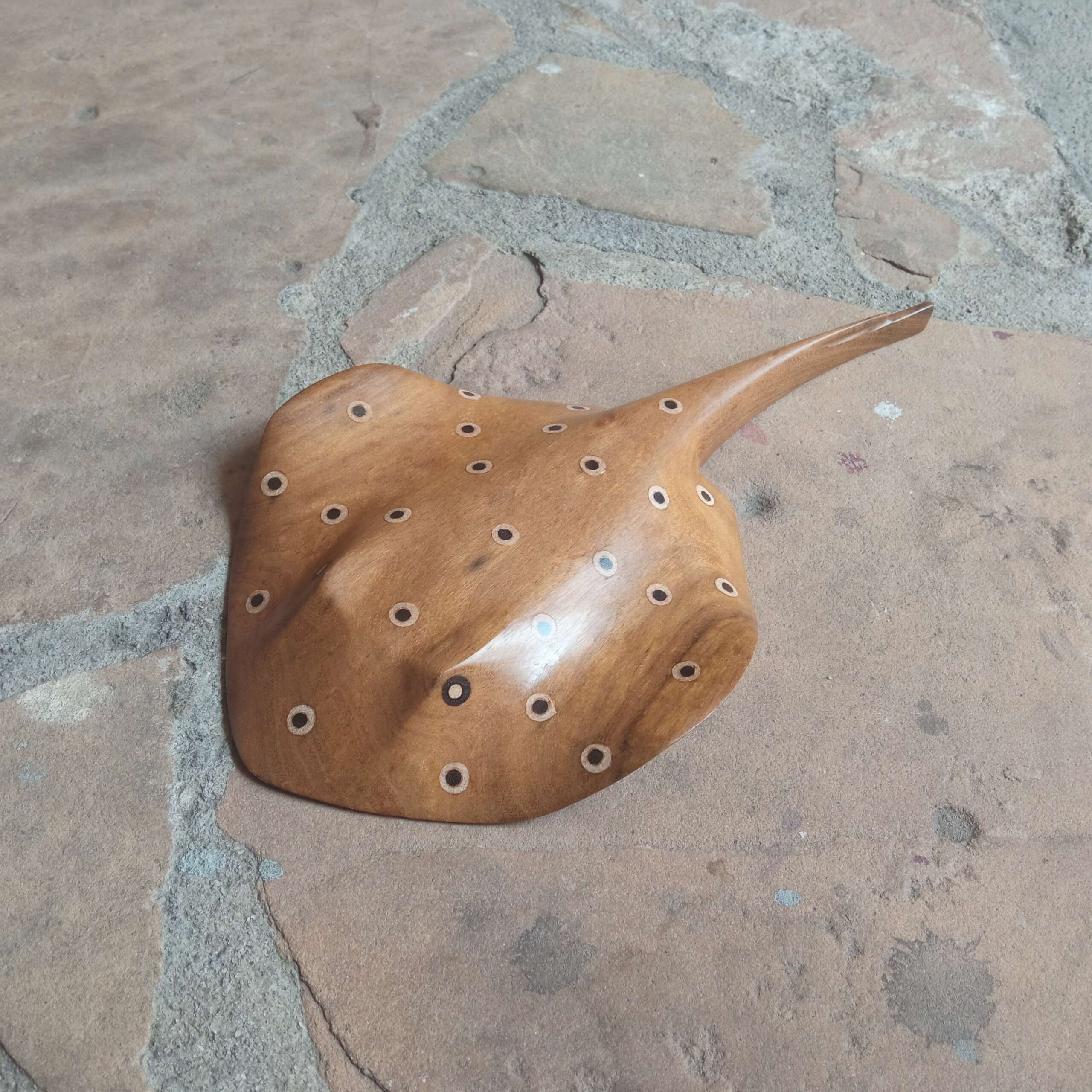 Entalhe em forma de arraia marchetada feito em madeira amazônica itaúba (marrom), produzido pelo Povo Baré.