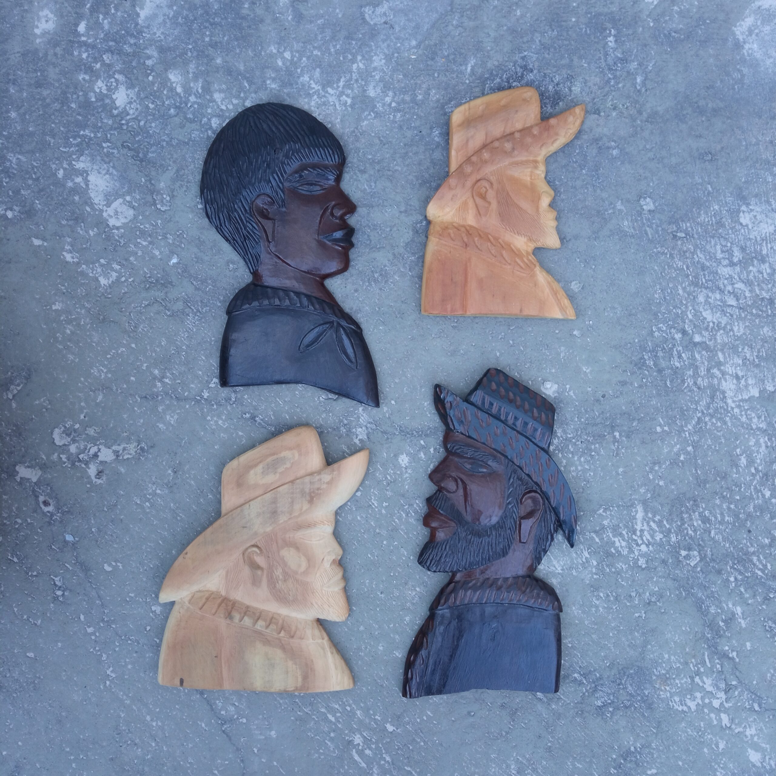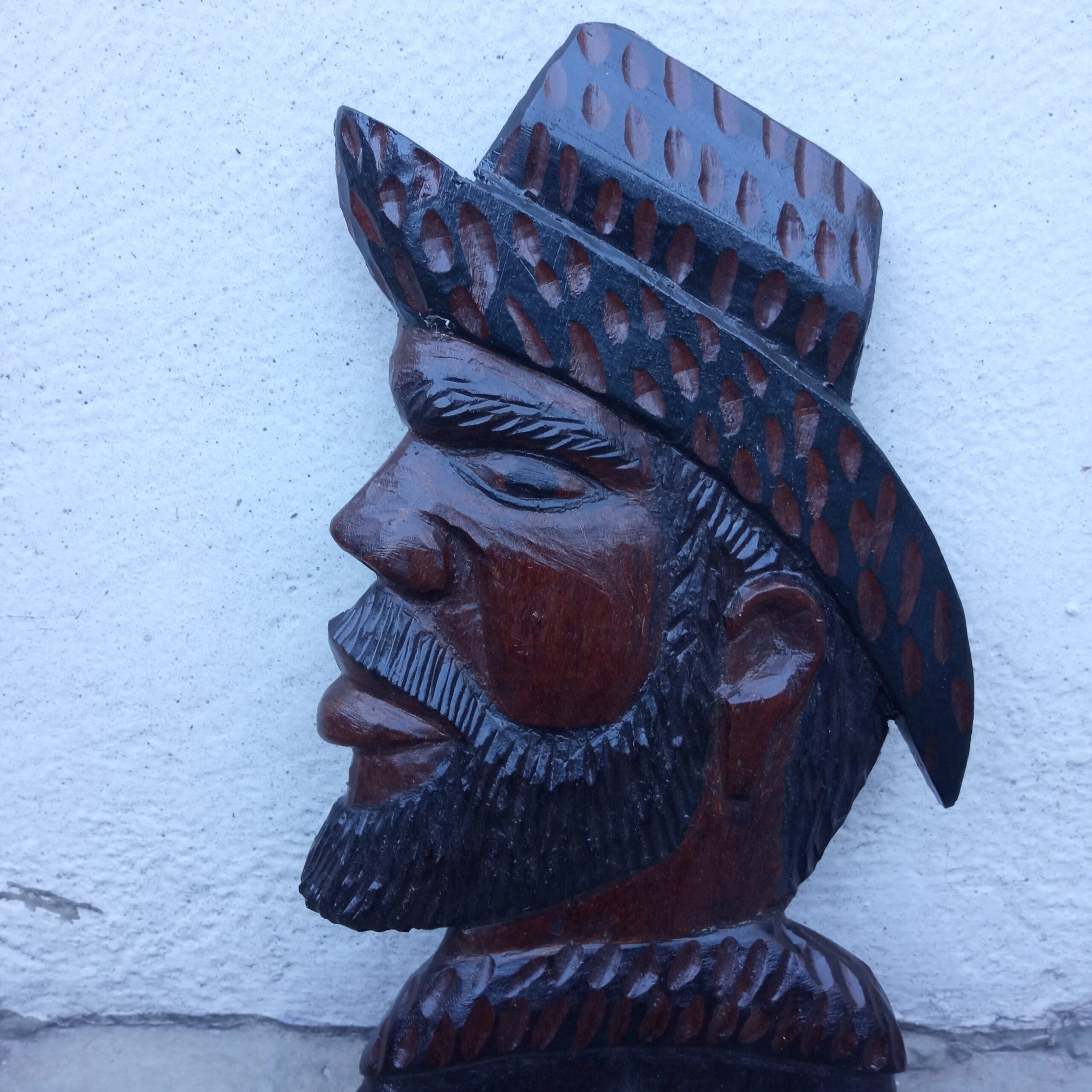 Busto entalhado em madeira de demolição, tamanho P. Seu Zé . Origem: Pernambuco – São Paulo.