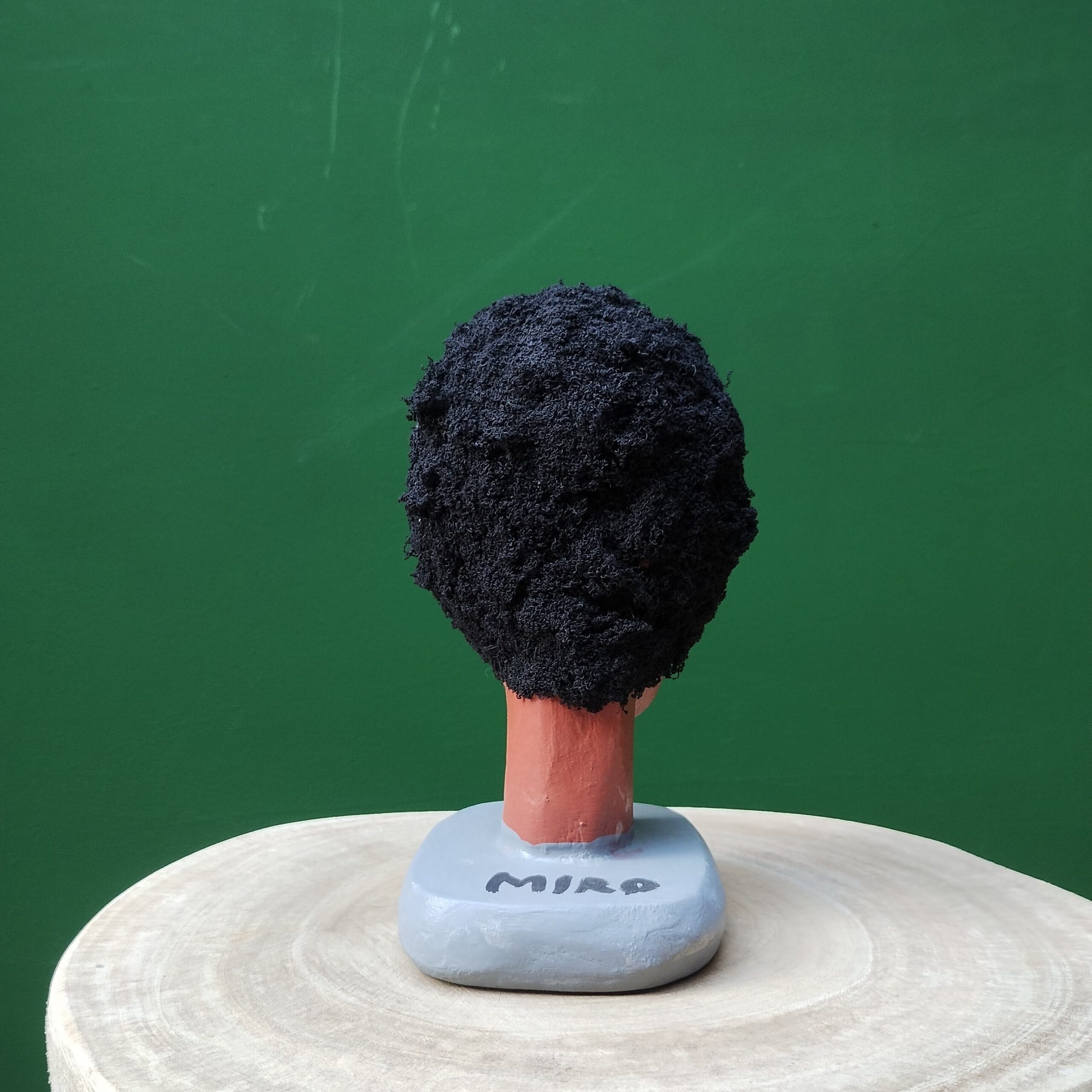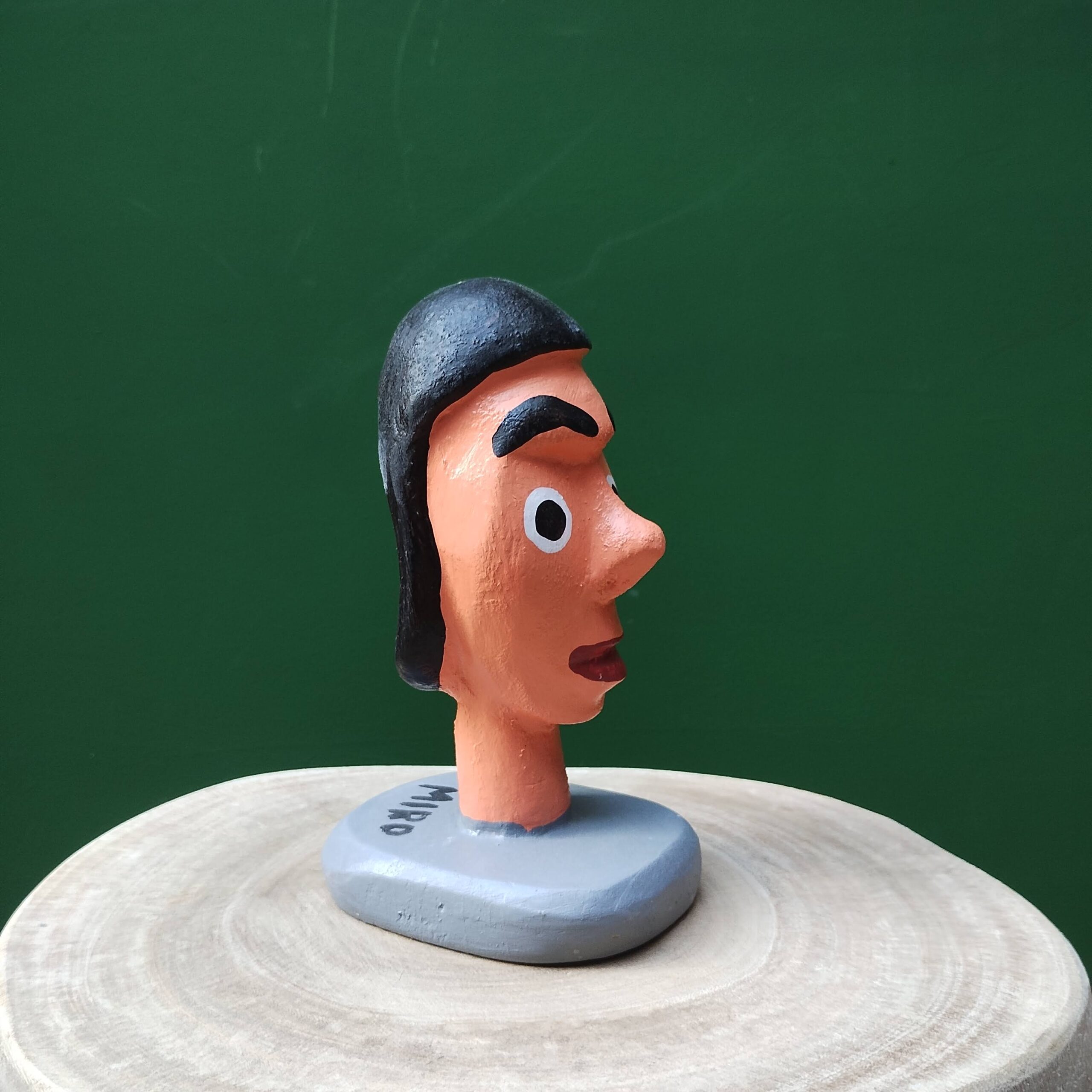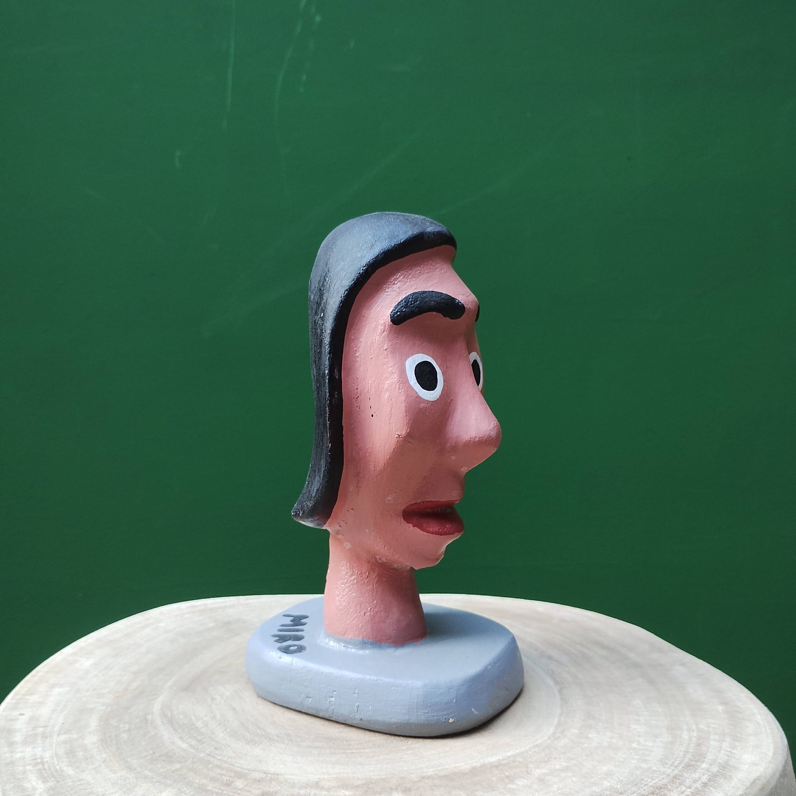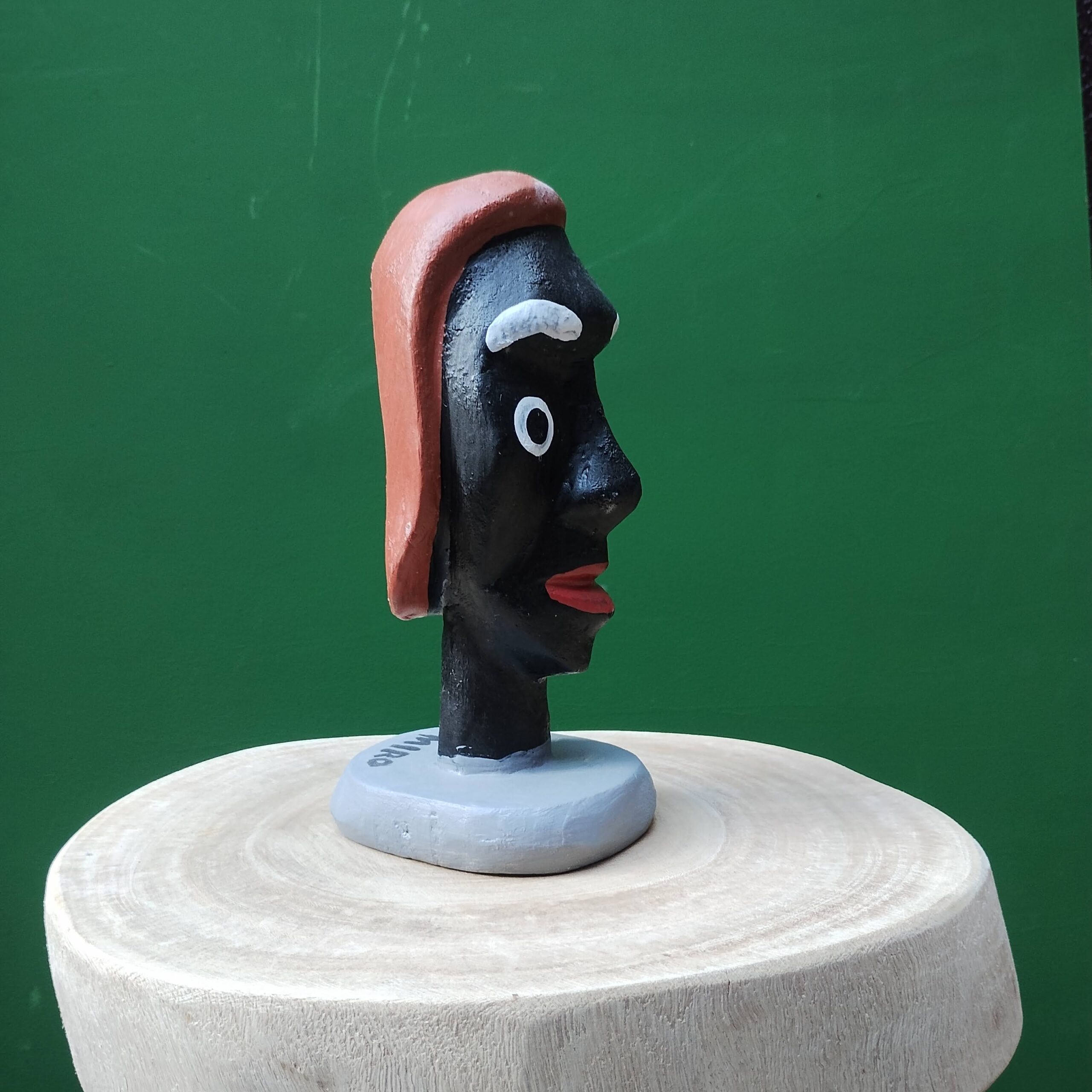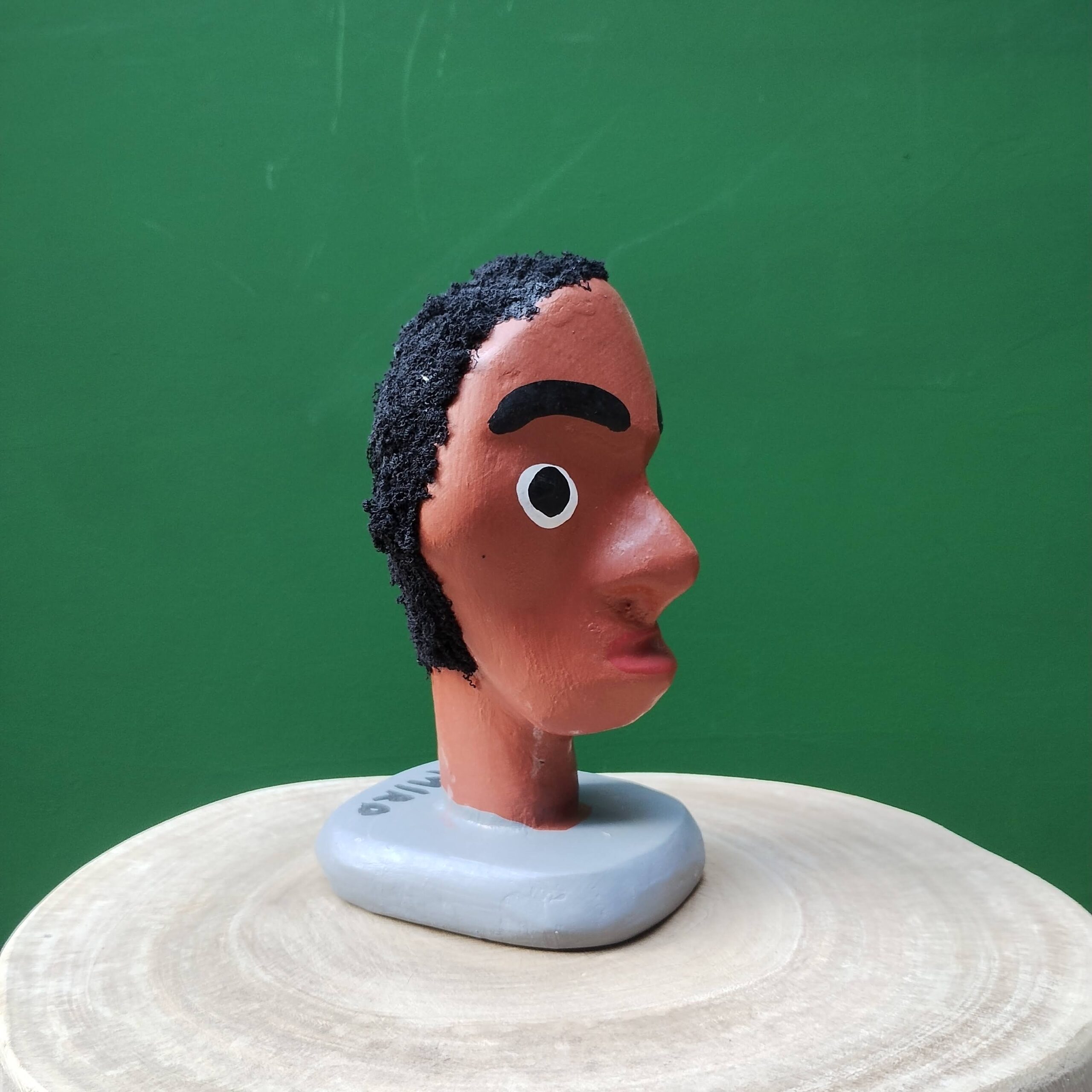 Entalhe em formato de cabeça, madeira mulungu, feito pelas mãos de Mestre Miro, artesão autodidata que entalha e cria bonecos desde a infância, influenciado pelo saudoso mamulengueiro Mestre Sólon.