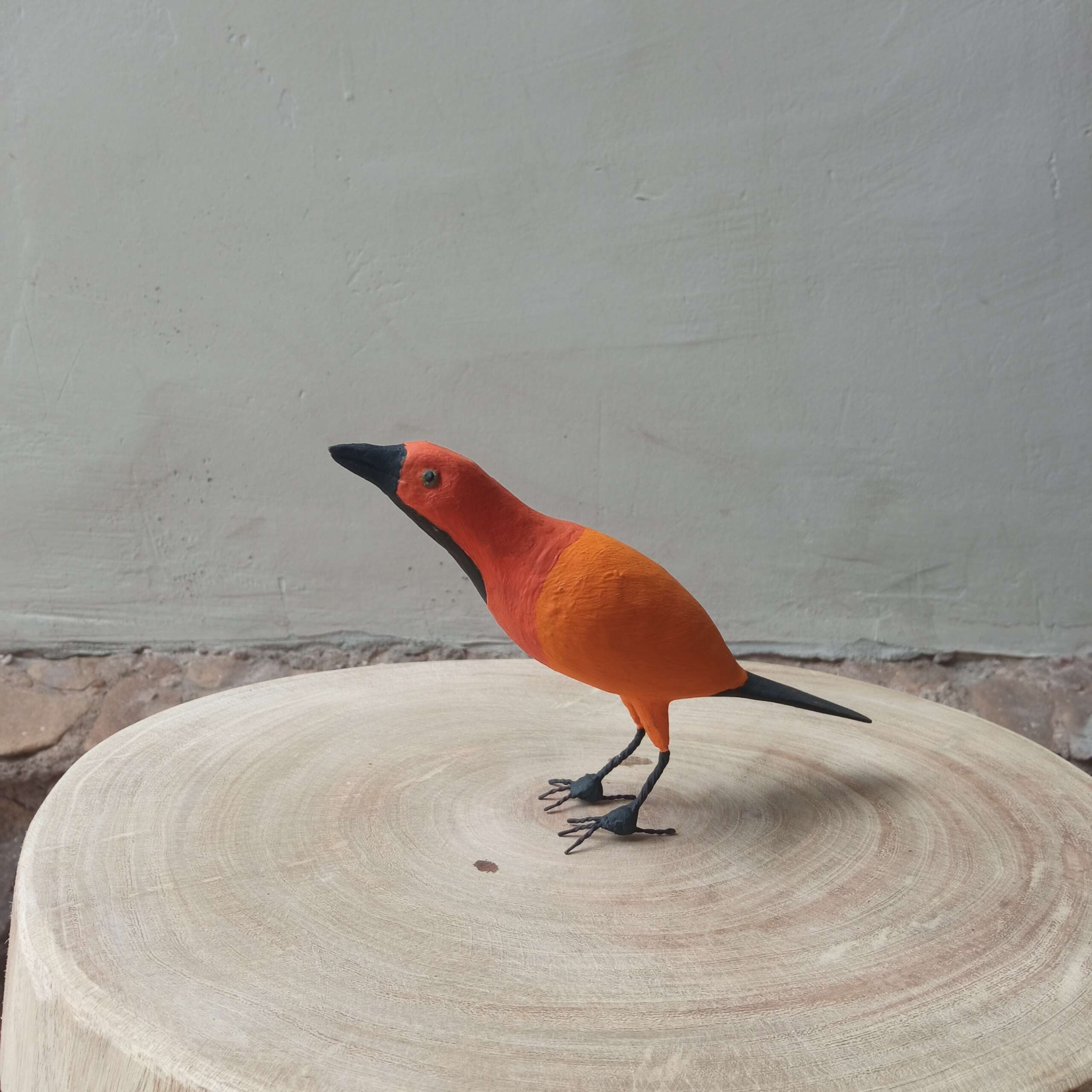 Pássaro entalhado em madeira de demolição, feito pelas mãos de Seu Zé.