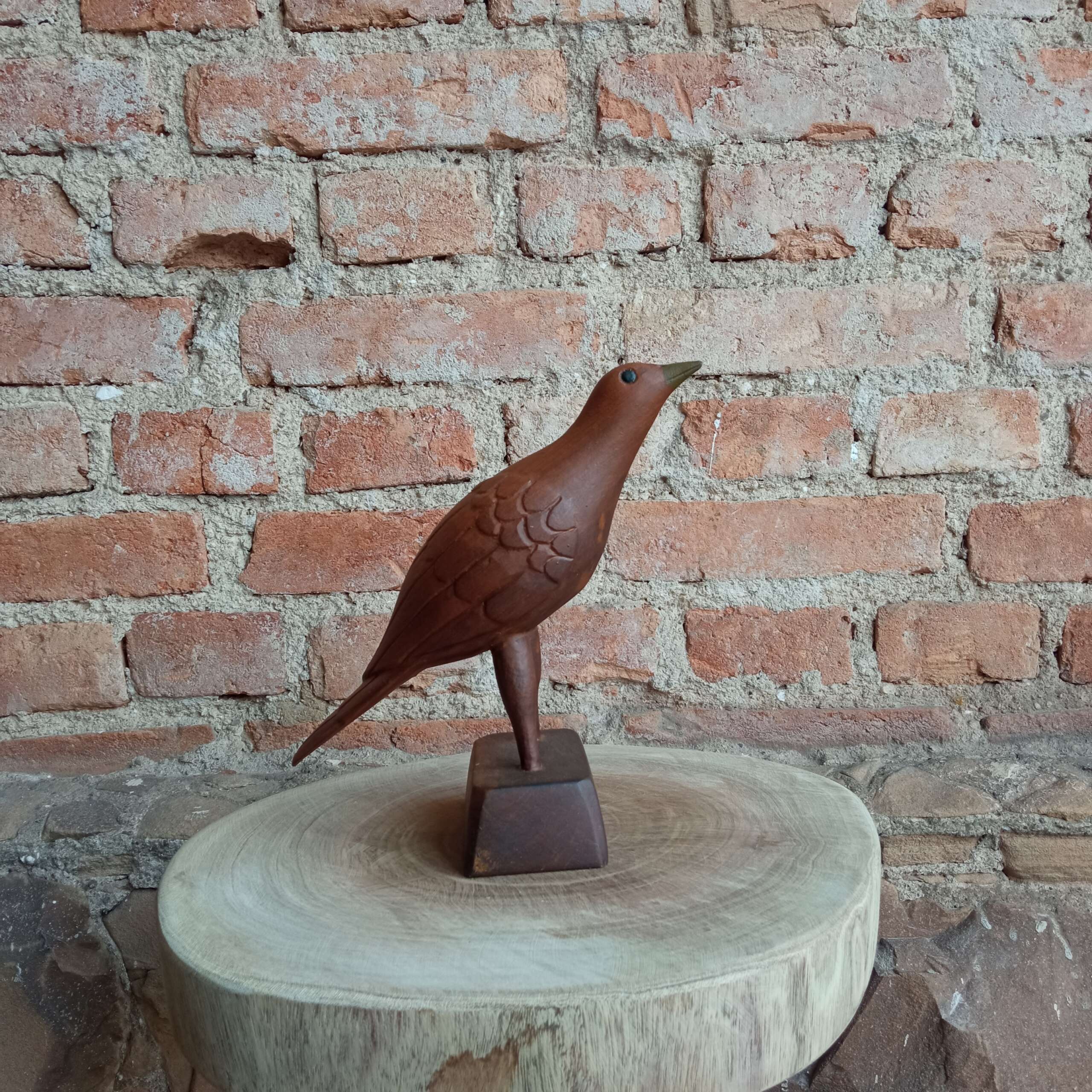 Pássaro entalhado em madeira de demolição, feito pelas mãos de Seu Zé.