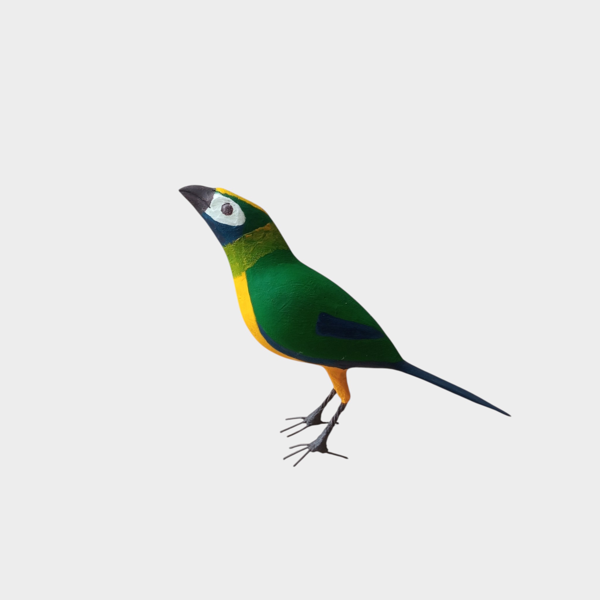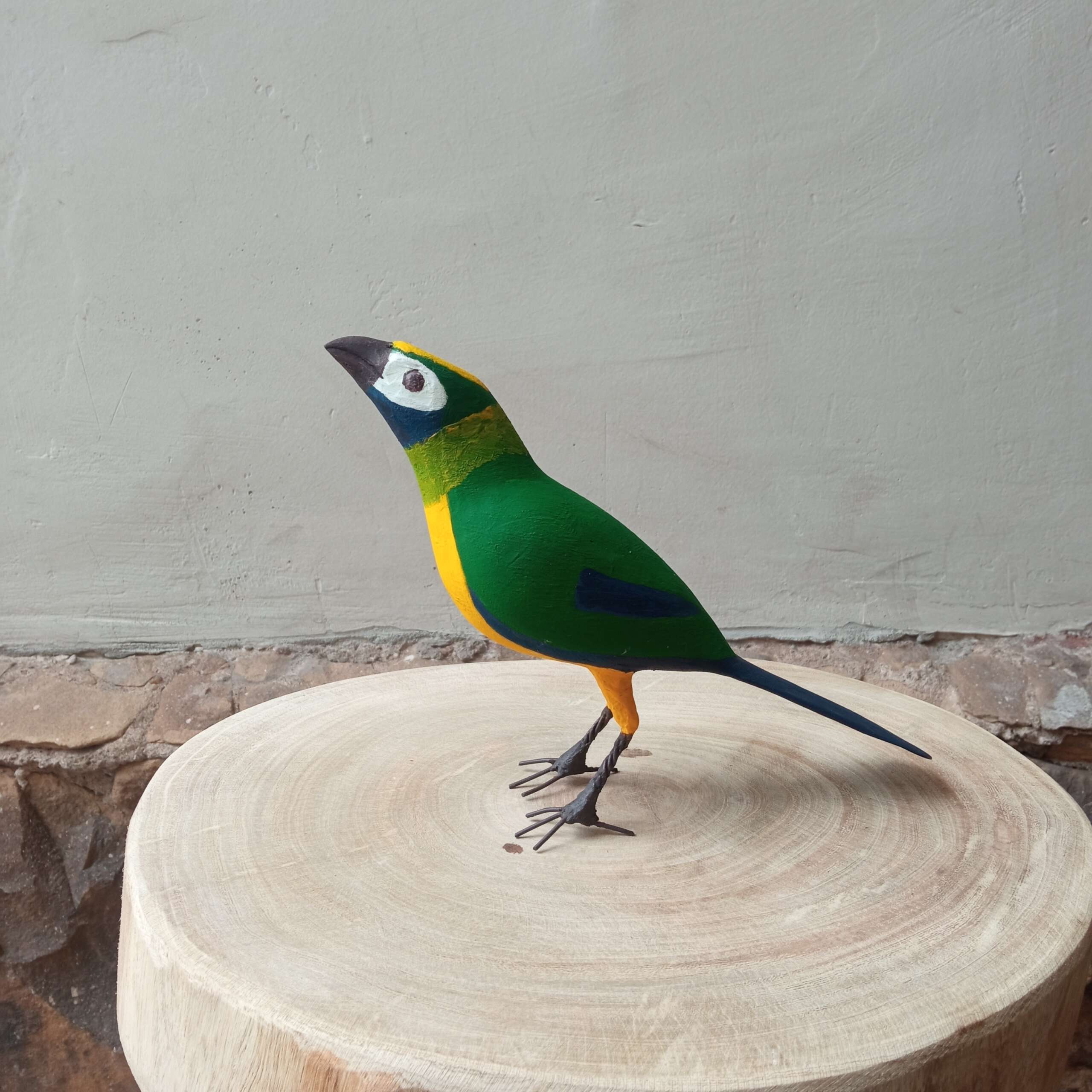 Pássaro entalhado em madeira de demolição, feito pelas mãos de Seu Zé.
