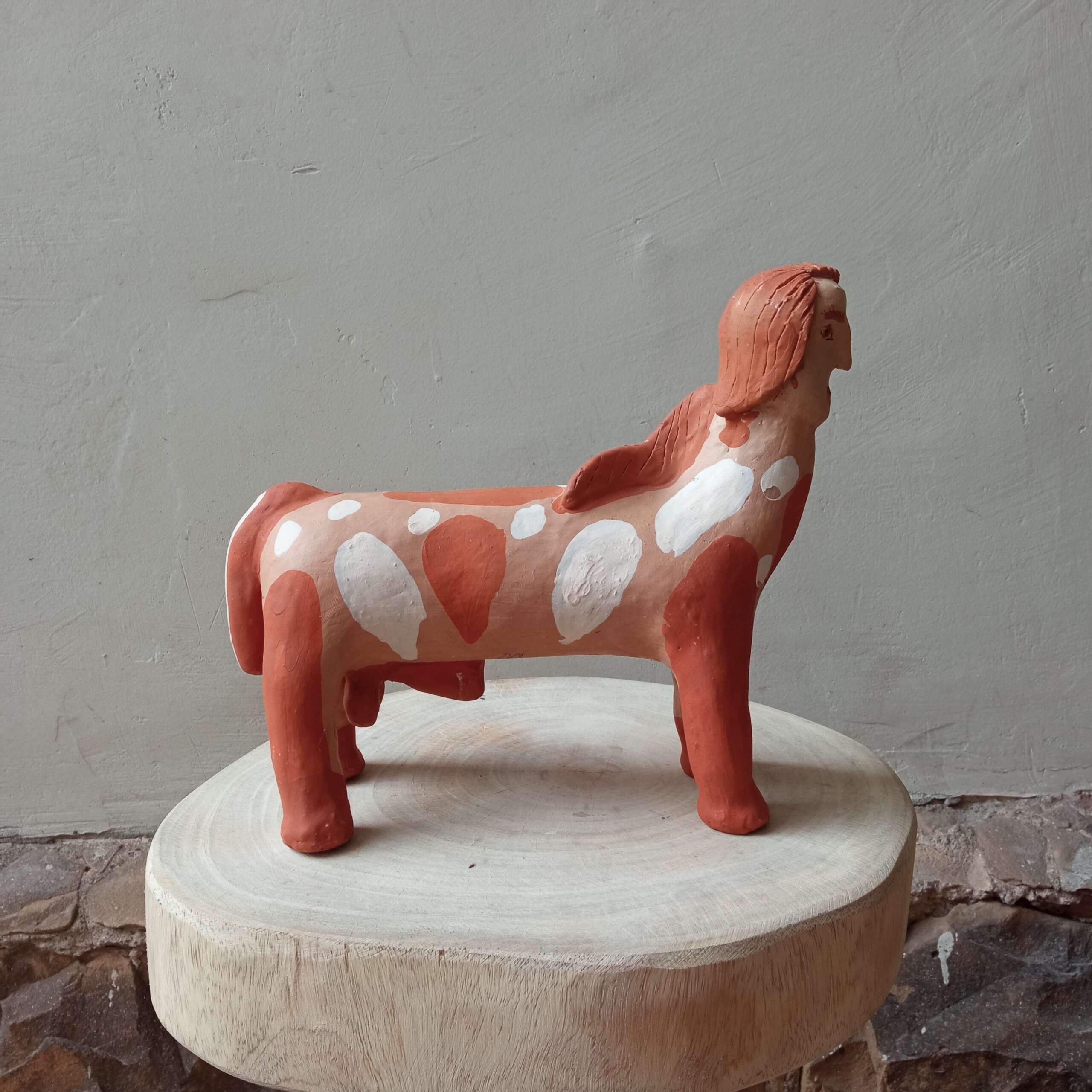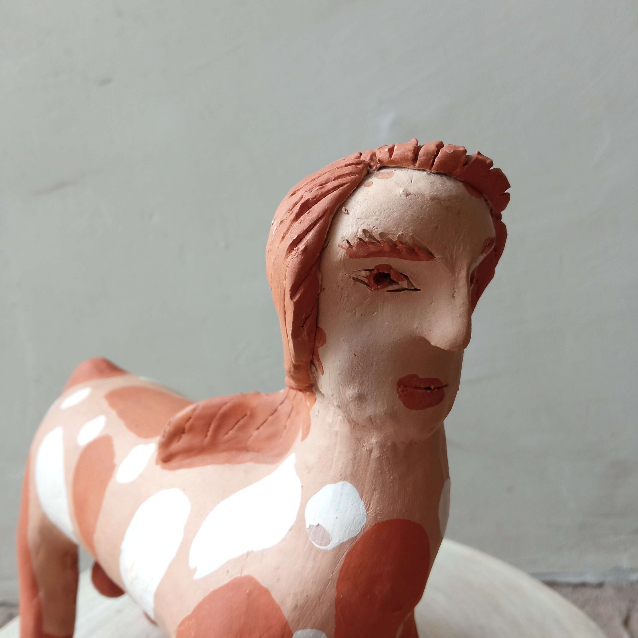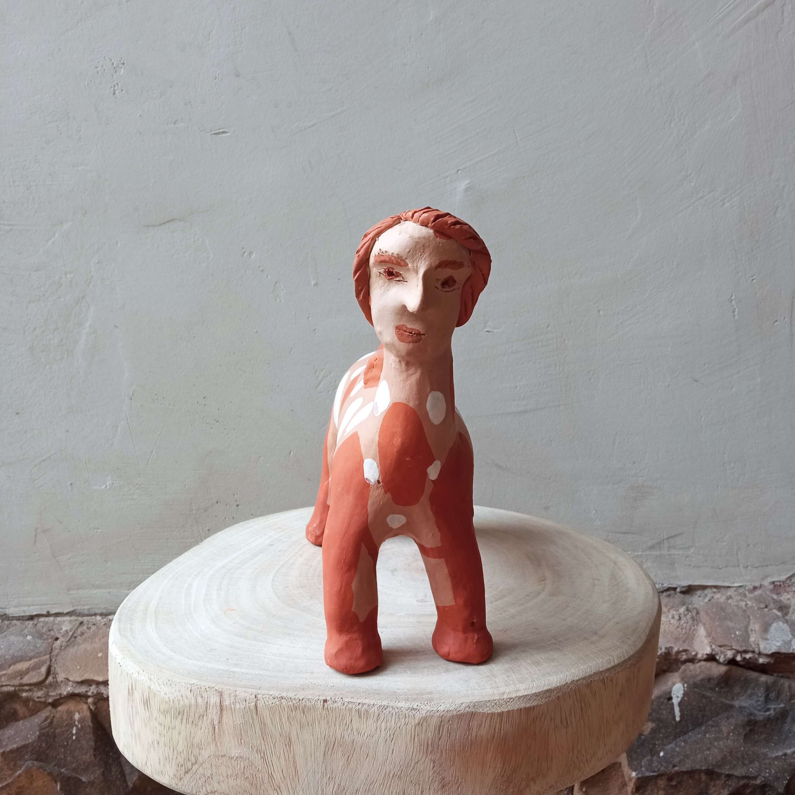 Escultura de bicho com cabeça de gente da artista Elza. Figura comum na obra dela e de outros artistas dessa “escola” em Caraí.