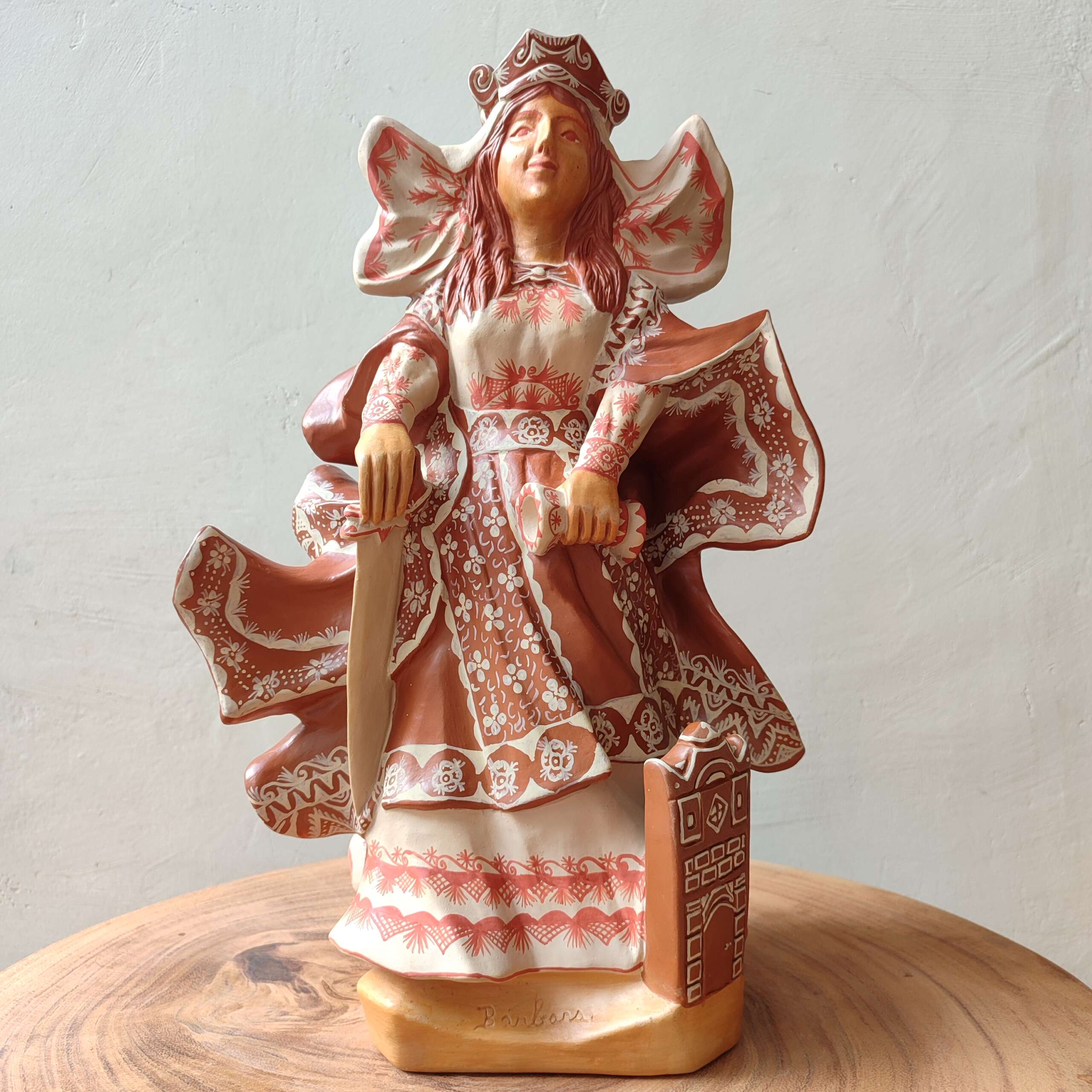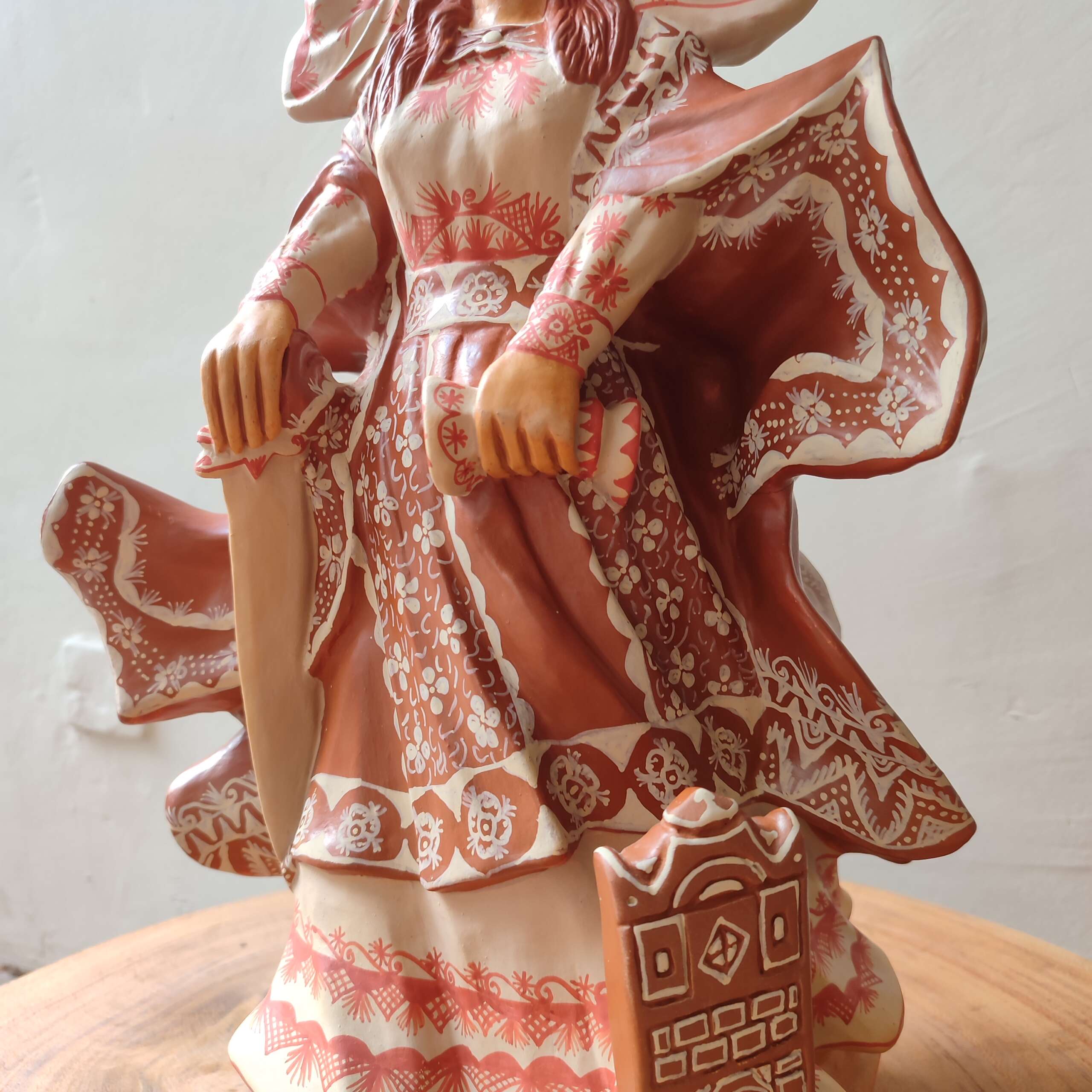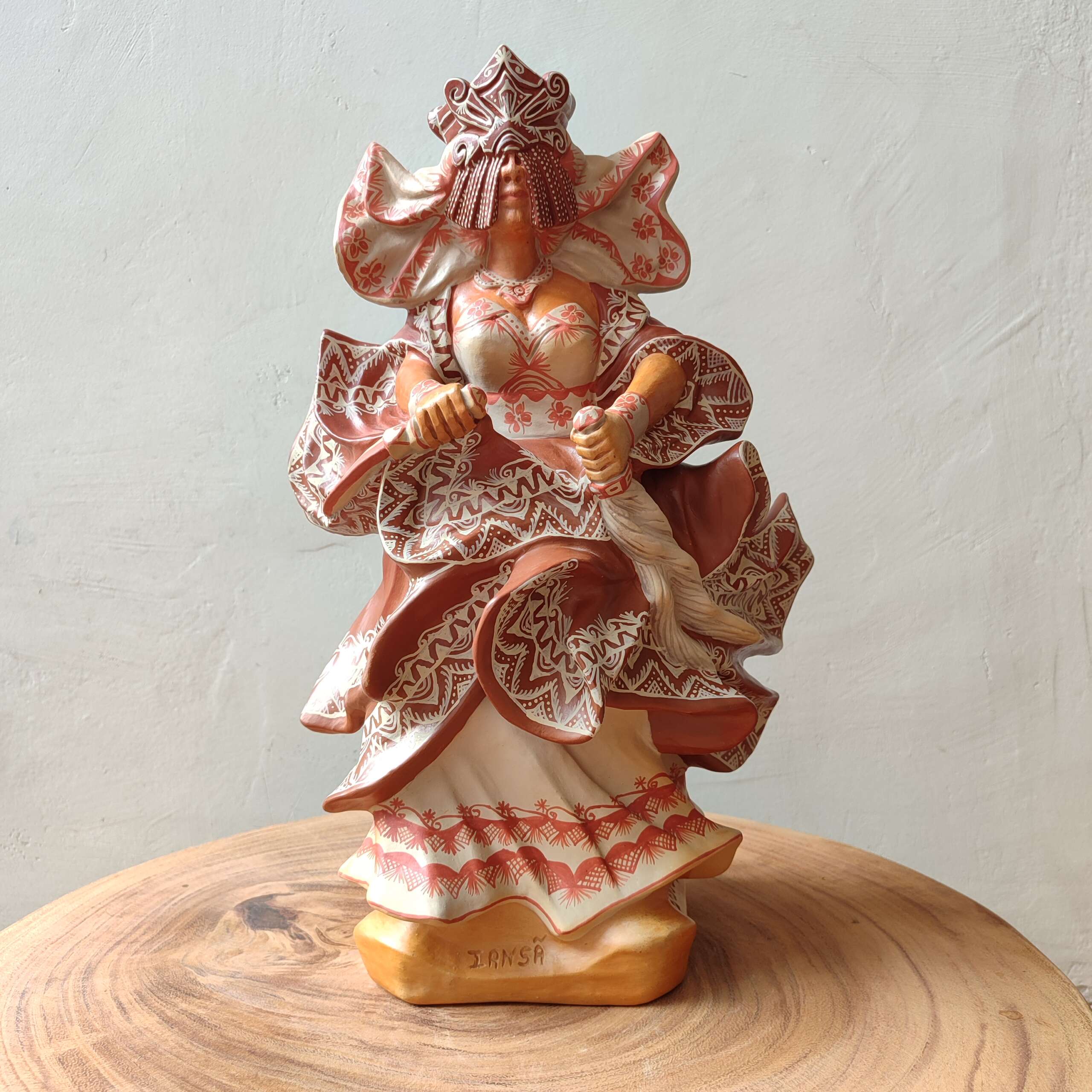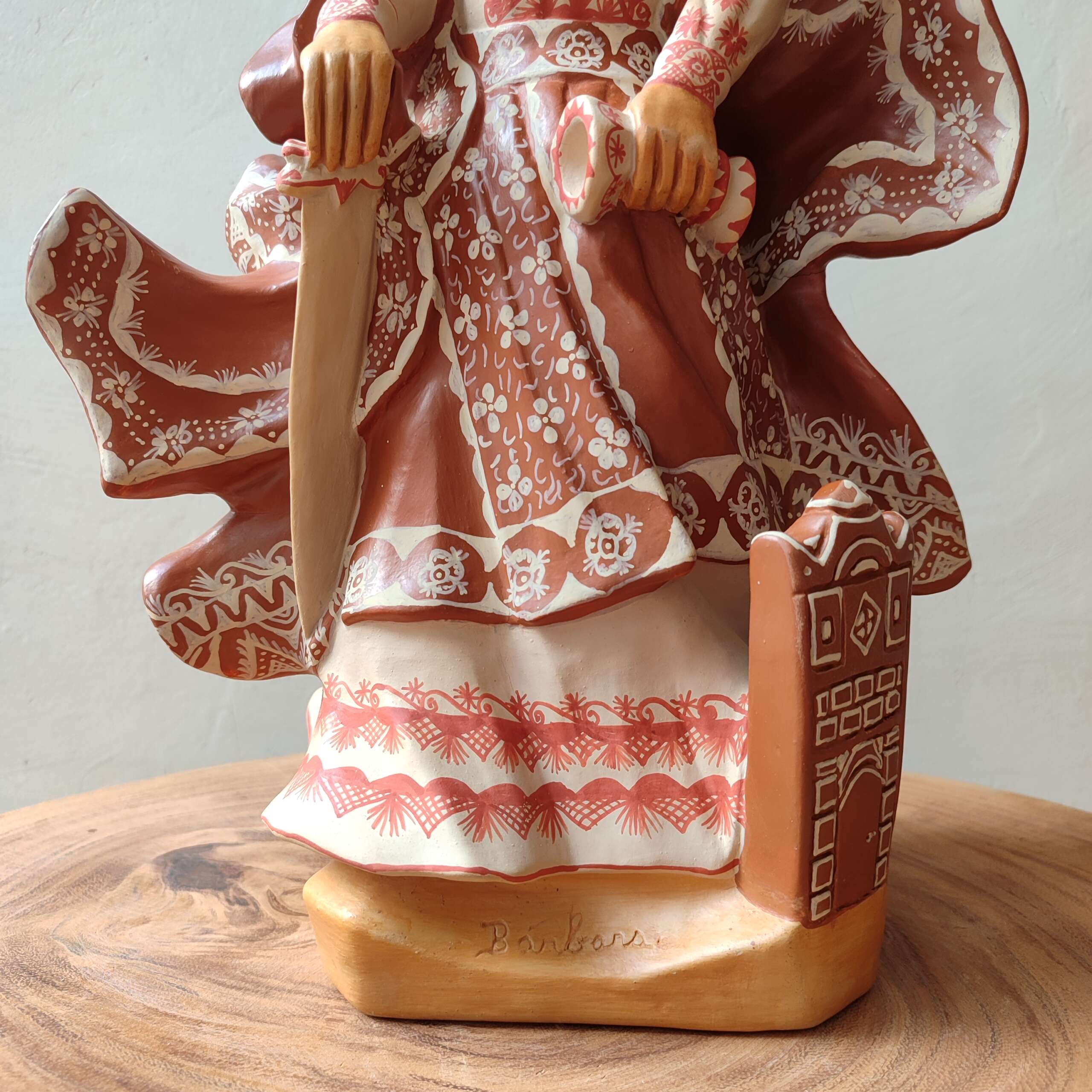 Escultura decorativa de cerâmica, com imagem sincrética e pintura do próprio barro misturado de dois rios diferentes. Orixá Iansã/Santa Bárbara. Confeccionada pelo artesão Elson – Barra – BA.