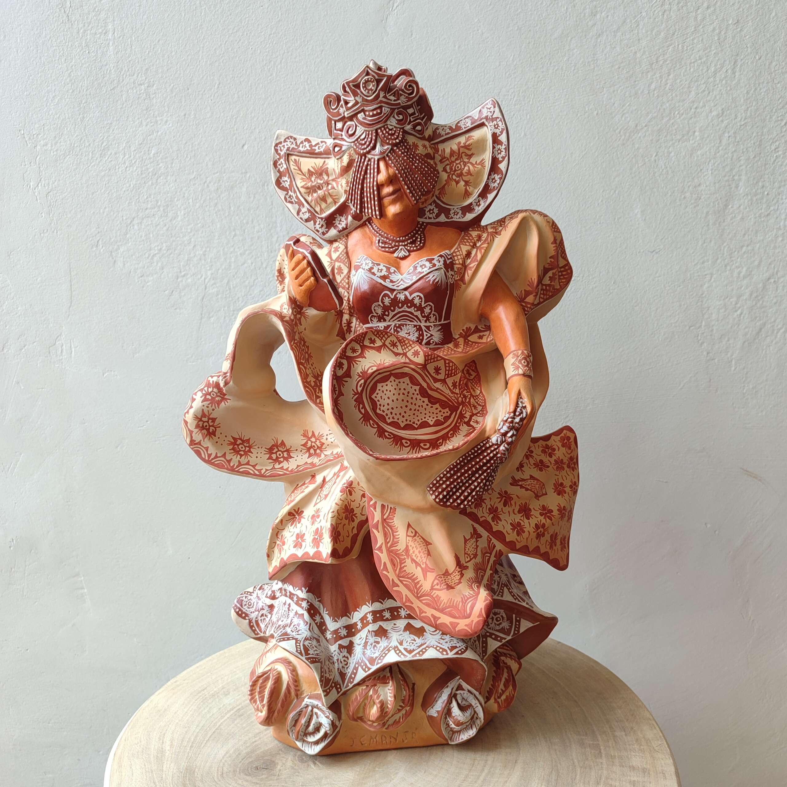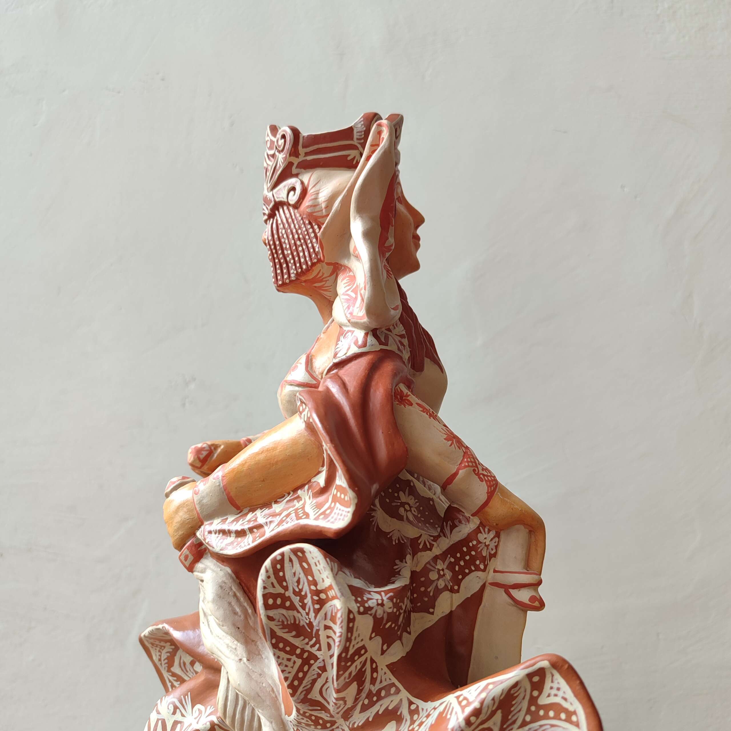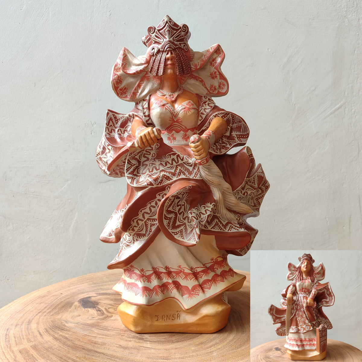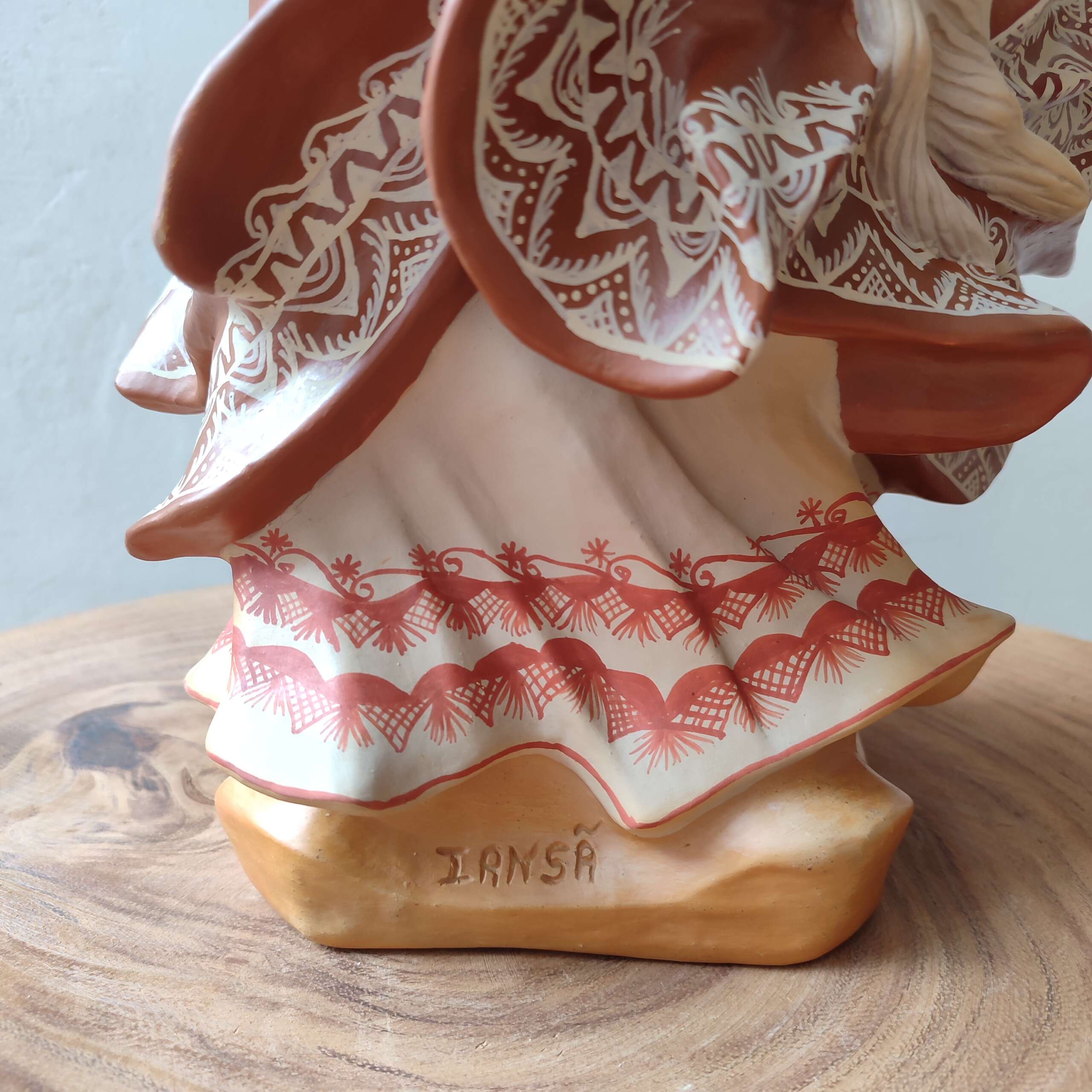 Escultura decorativa de cerâmica, com imagem sincrética e pintura do próprio barro misturado de dois rios diferentes. Orixá Iansã/Santa Bárbara. Confeccionada pelo artesão Elson – Barra – BA.