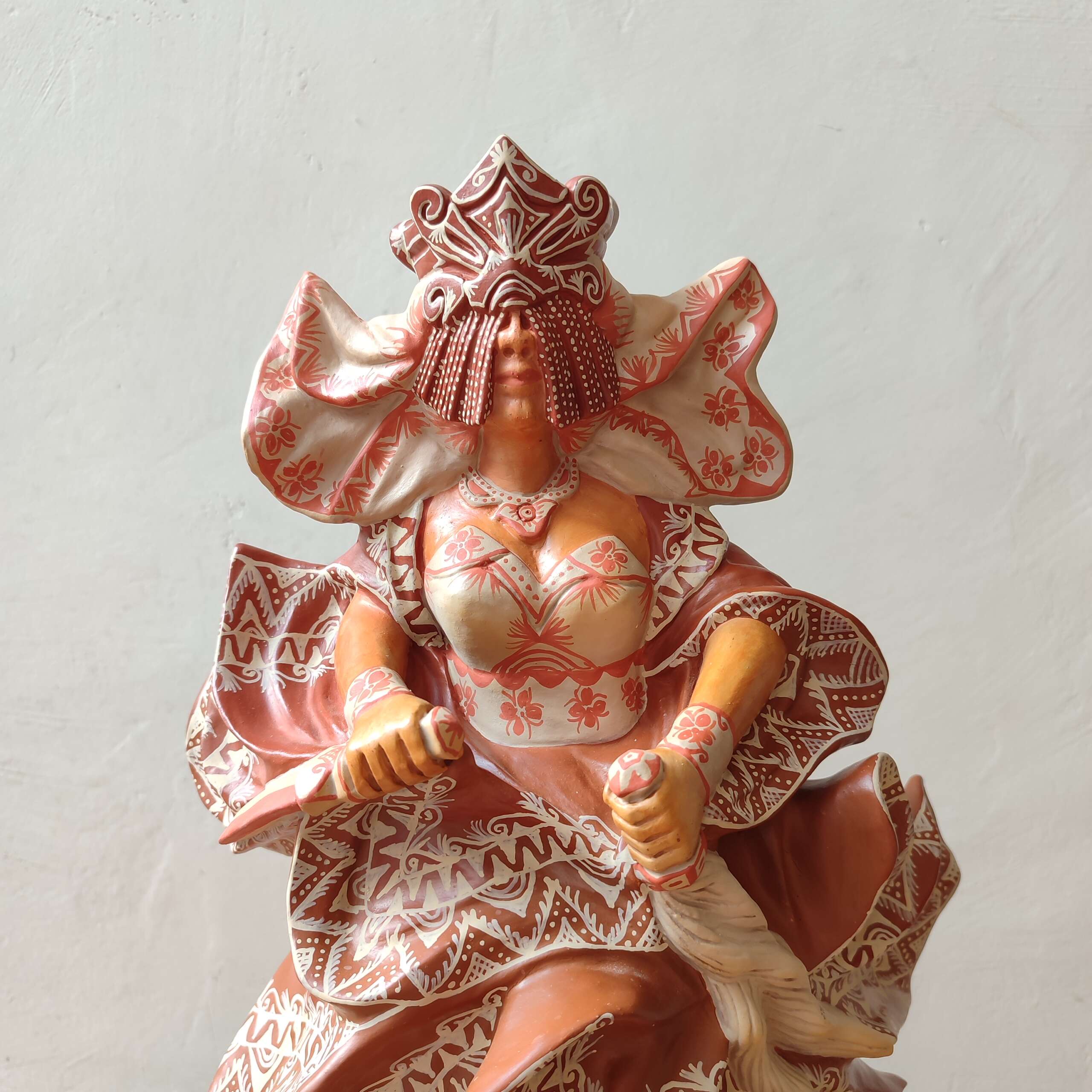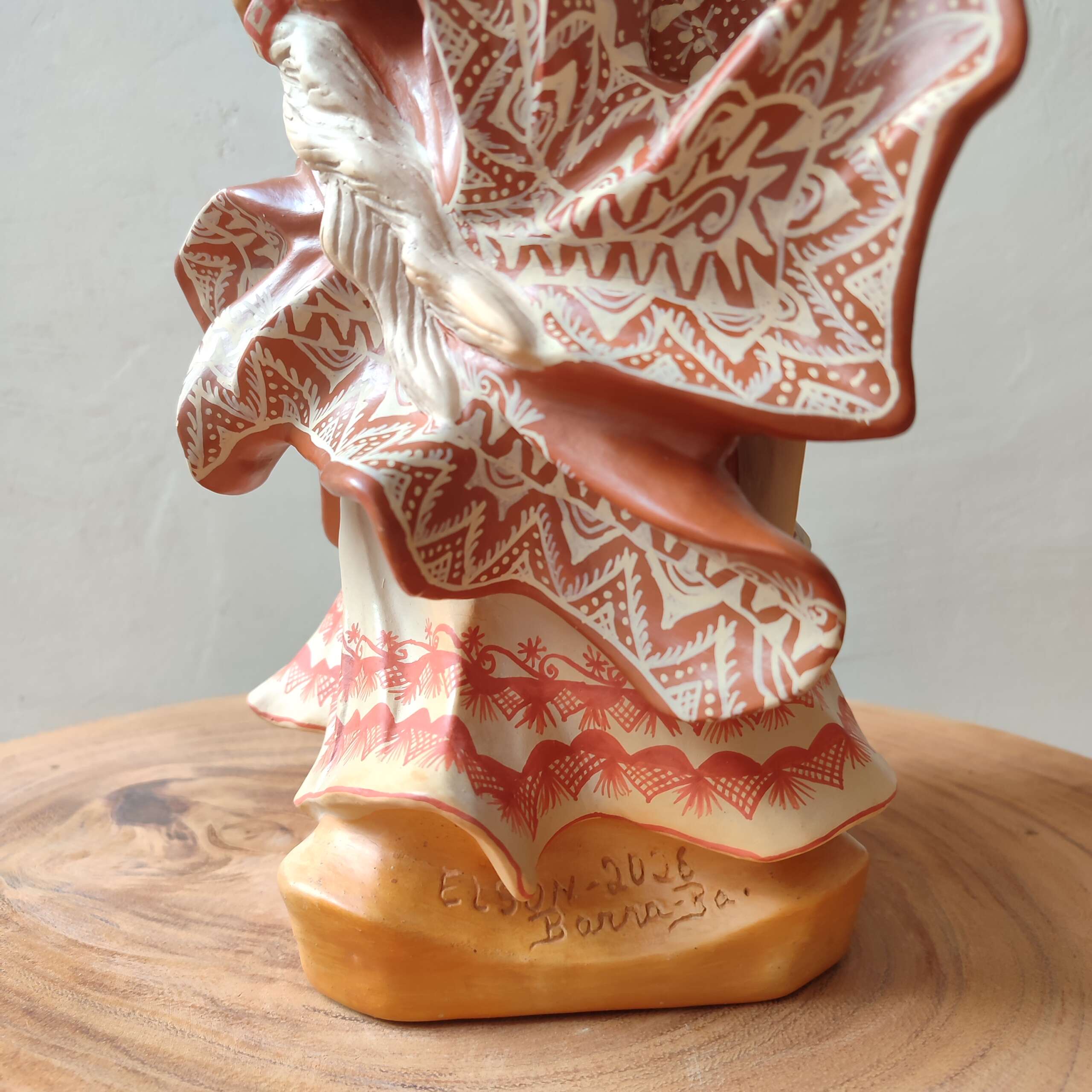 Escultura lindíssima decorativa de cerâmica, com pintura do próprio barro, duas cores de barro, o tauá mais avermelhado e a tabatinga, uma argila mais mole que dá o tom branco as esculturas. Escultura sincrética que representa de um lado a orixá Iansã e do outro Santa Bárbara. Confeccionada pelo artesão Elson, discípulo de Mestre Gerar – Barra – BA.
