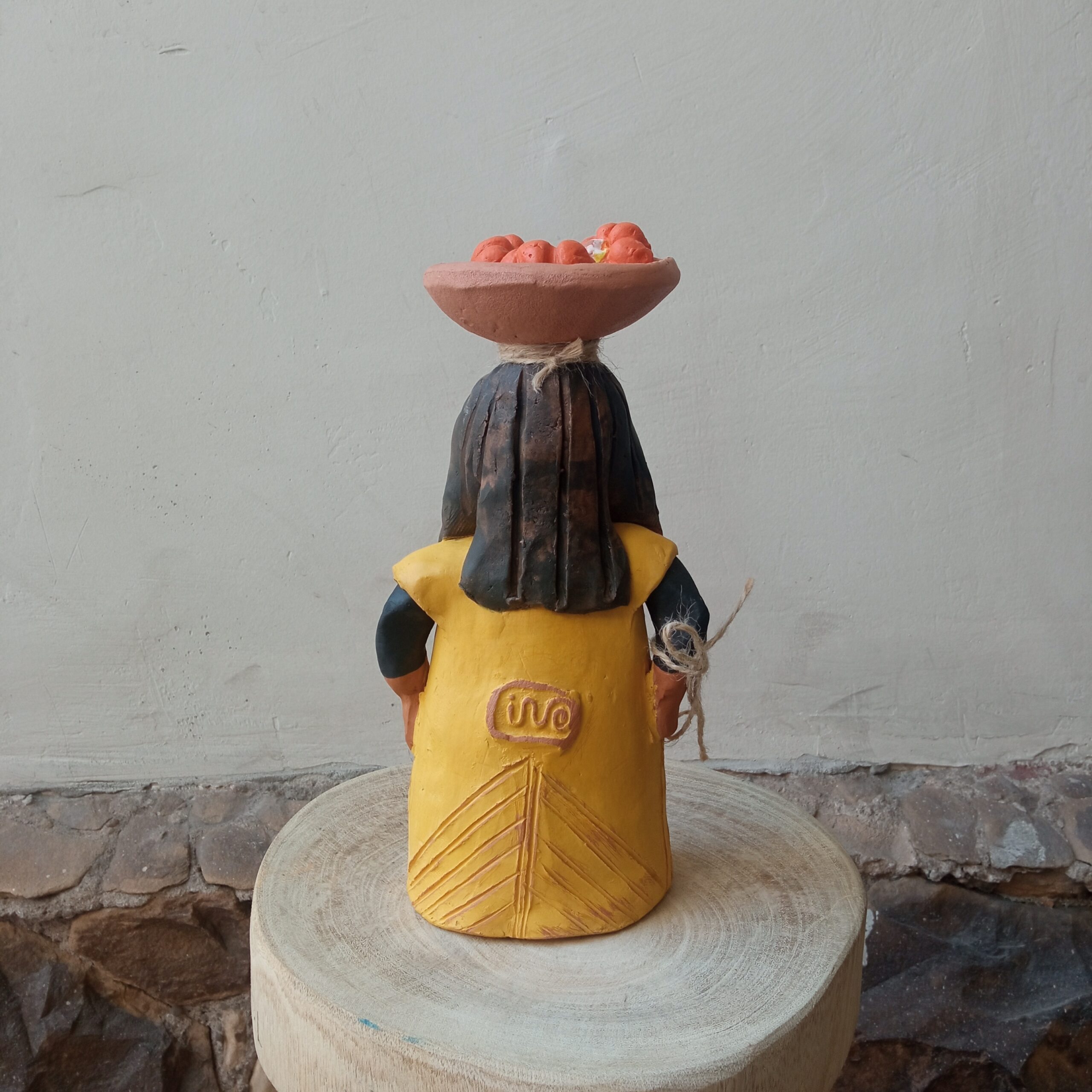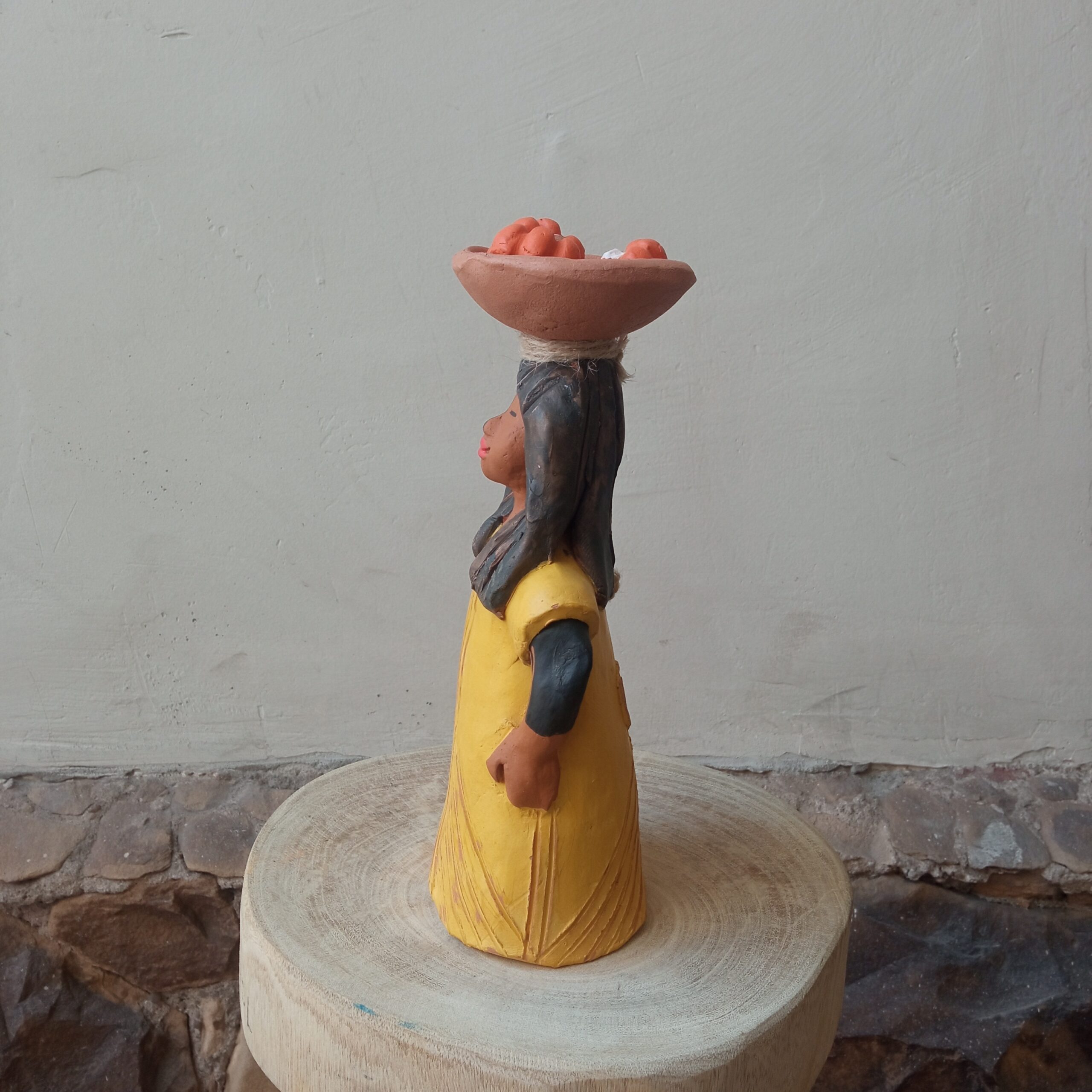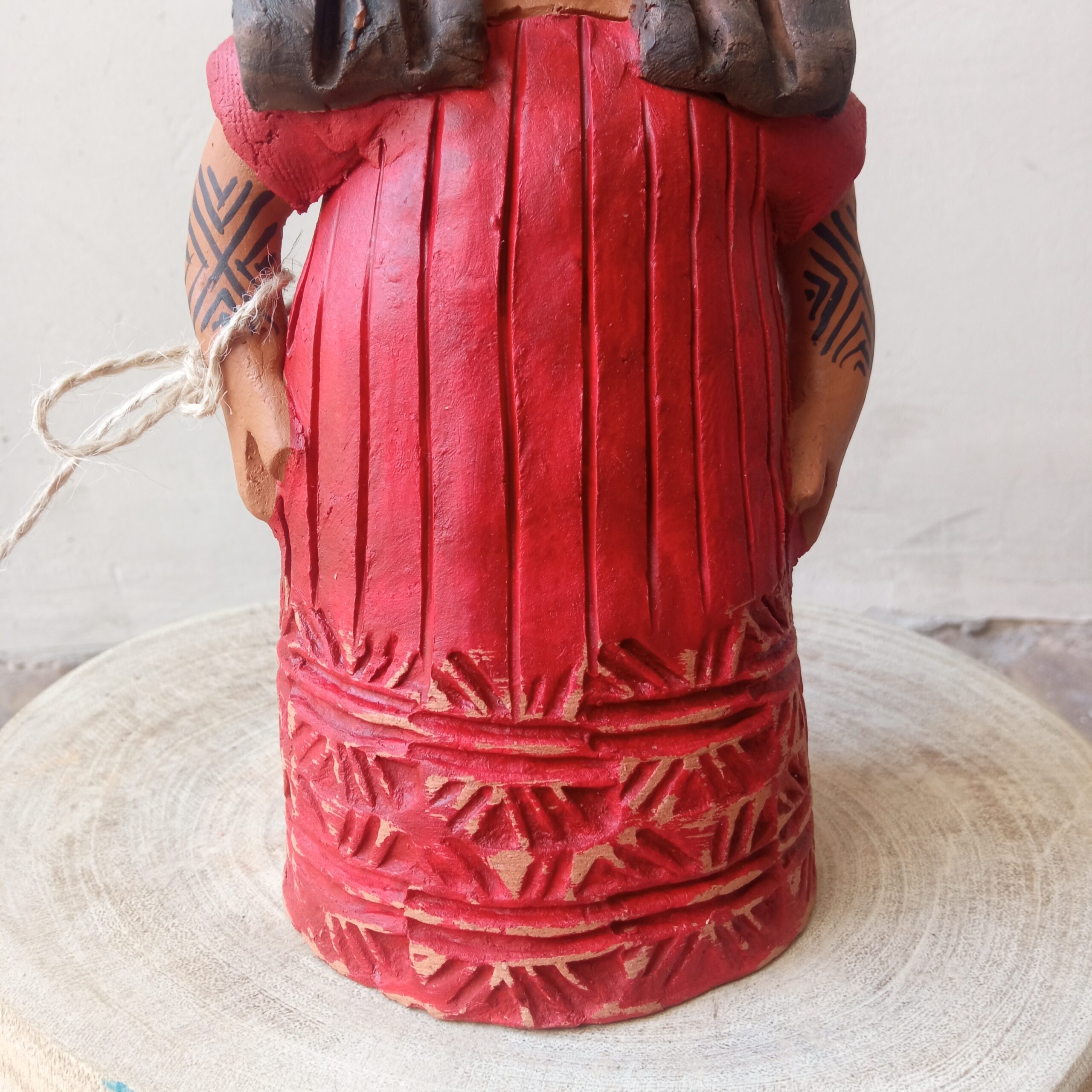 Escultura de cerâmica representando uma mulher indígena, inspirada nos terenas. Artista Indiana Marques.
