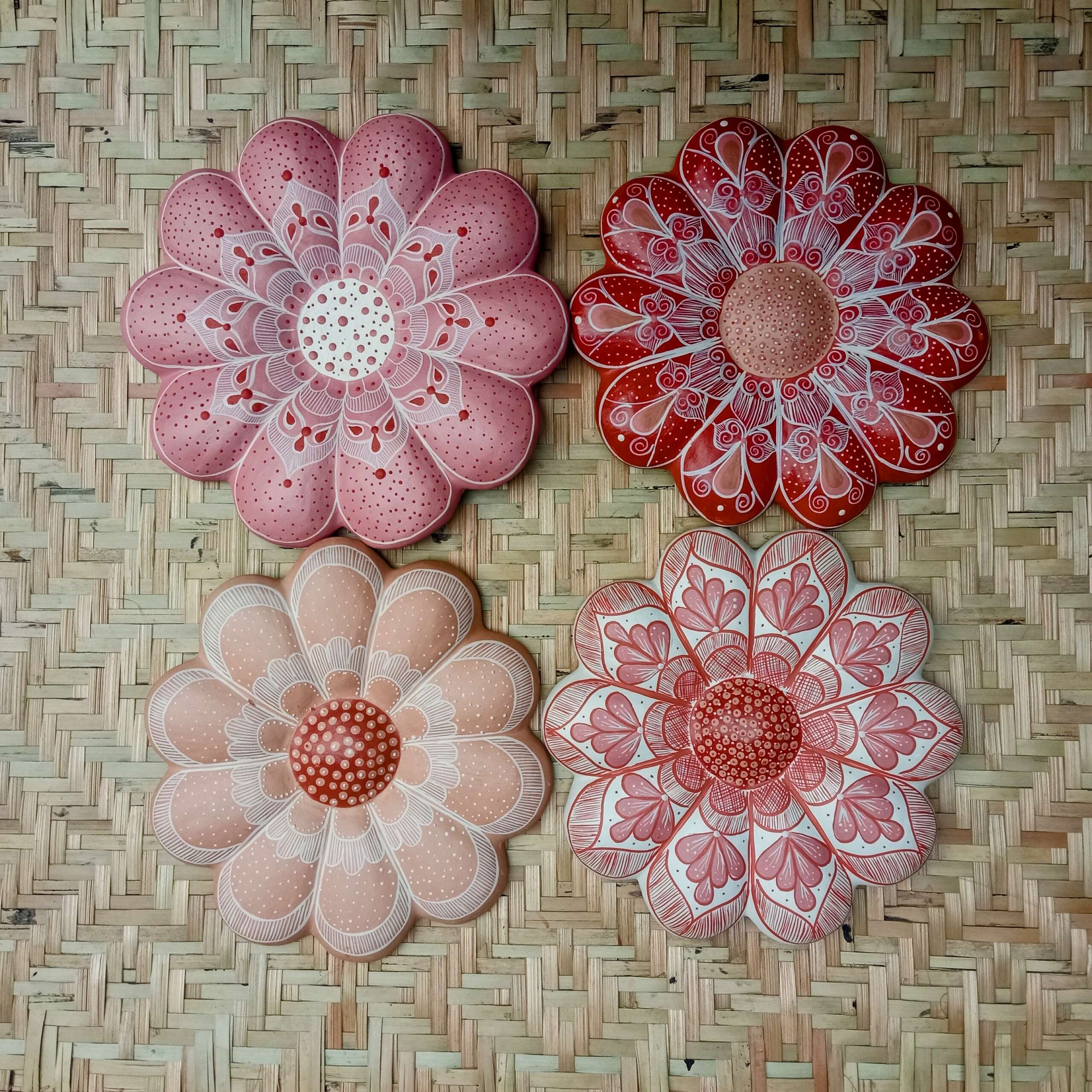 Flor de barro, decorativa para parede, com pintura do próprio barro com misturas de plantas e raízes, cores da natureza. Confeccionadas por artesãs do Vale do Jequitinhonha – MG.