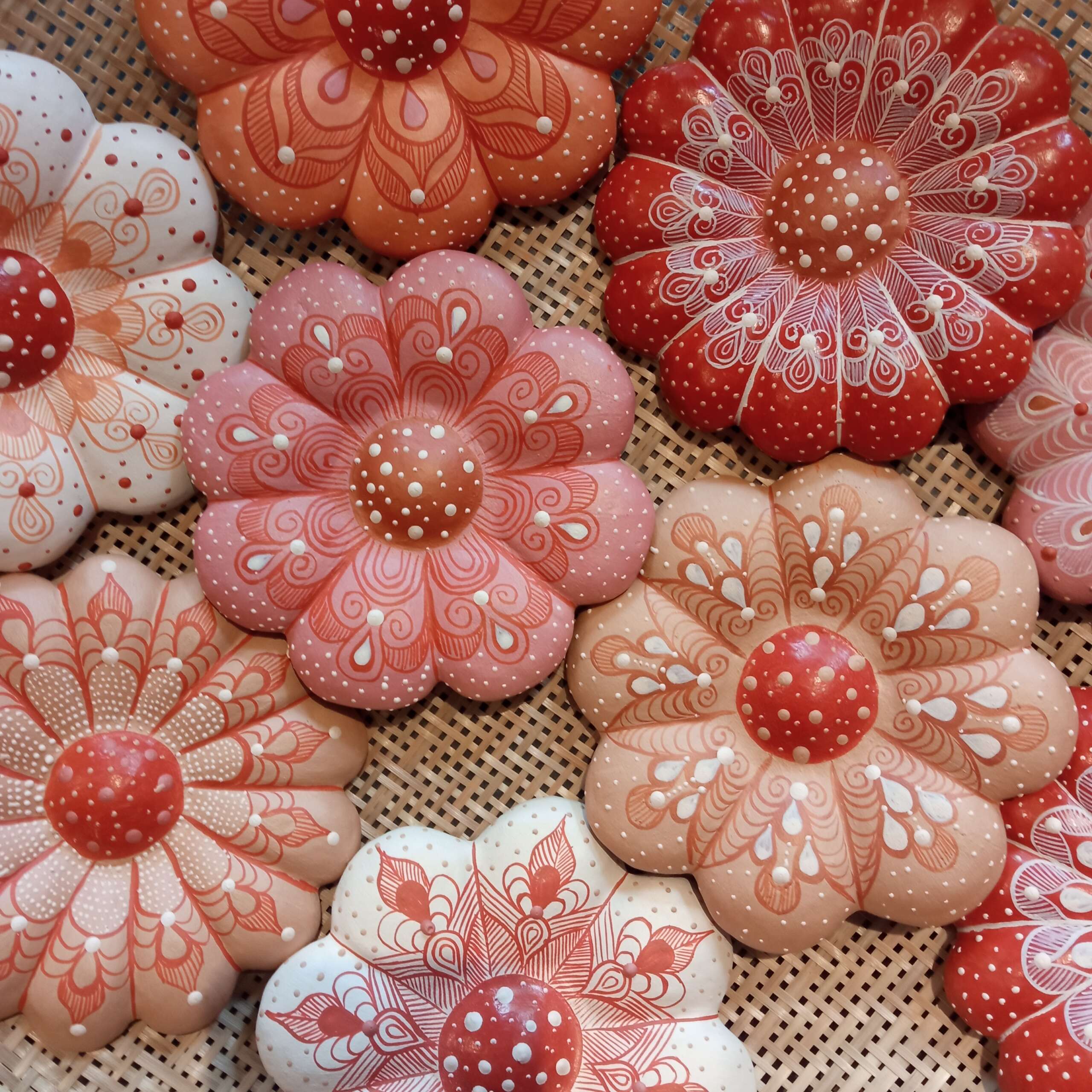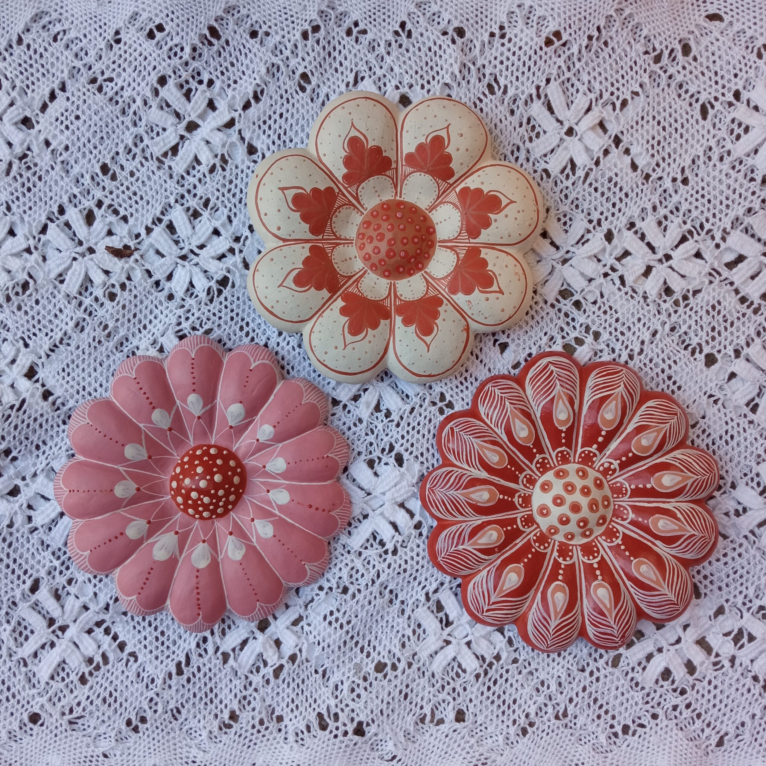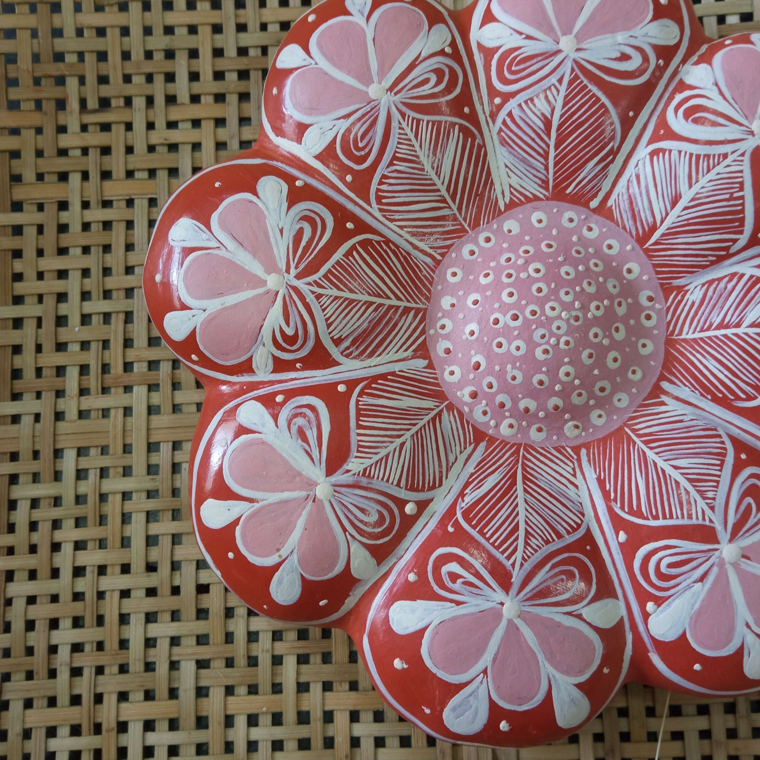 Flor de barro, decorativa para parede, com pintura do próprio barro com misturas de plantas e raízes, cores da natureza. Confeccionadas por artesãs do Vale do Jequitinhonha – MG.