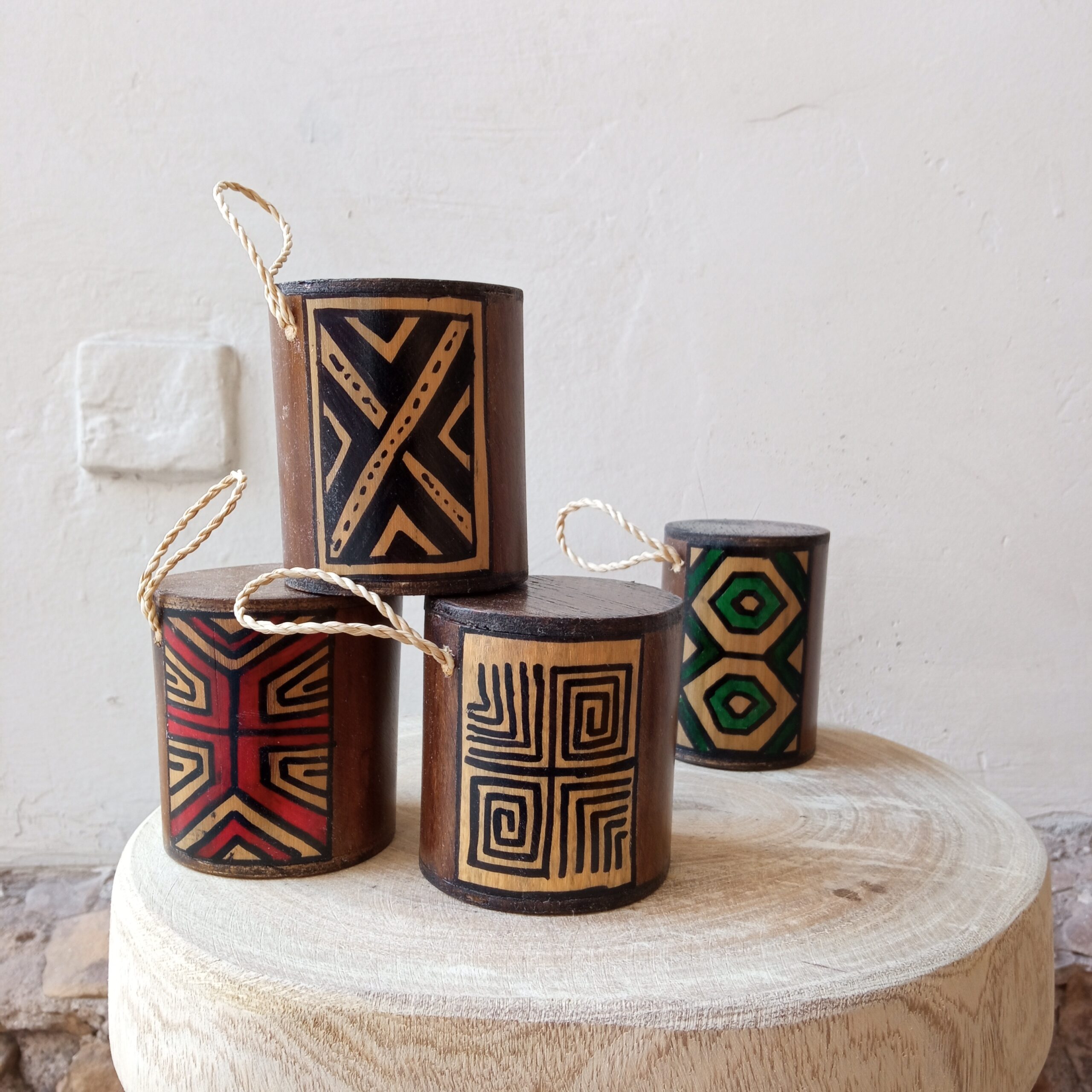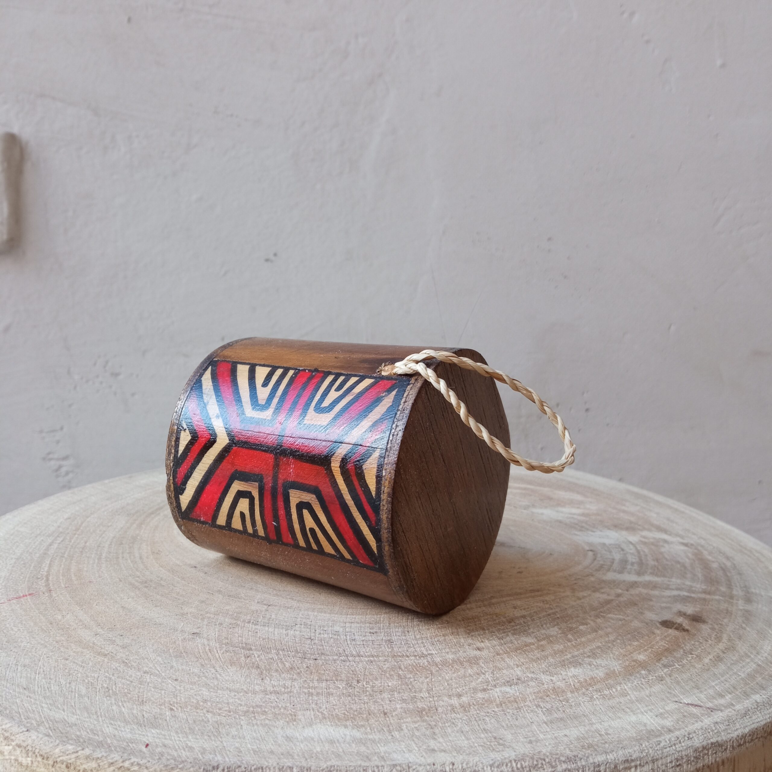 Ganzá, instrumento musical produzido com matéria-prima natural pelo artesão Alexandre Paulemy. Pintado à mão.