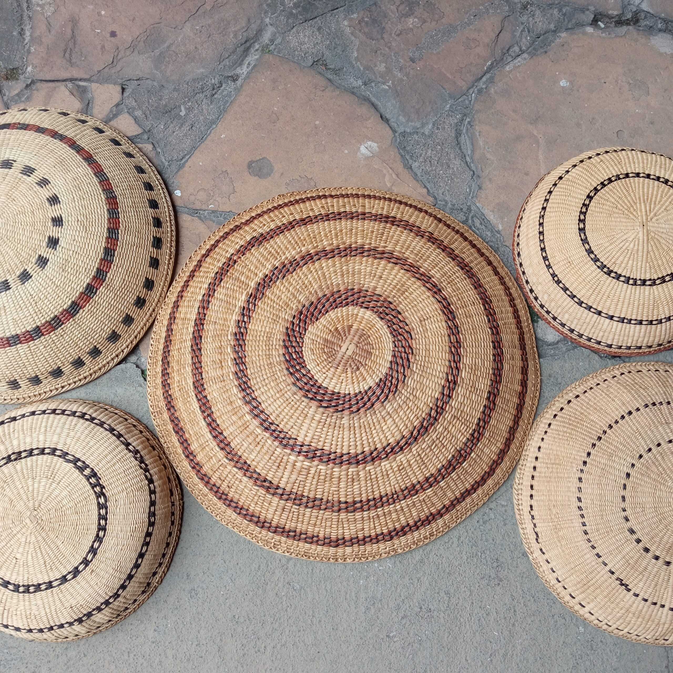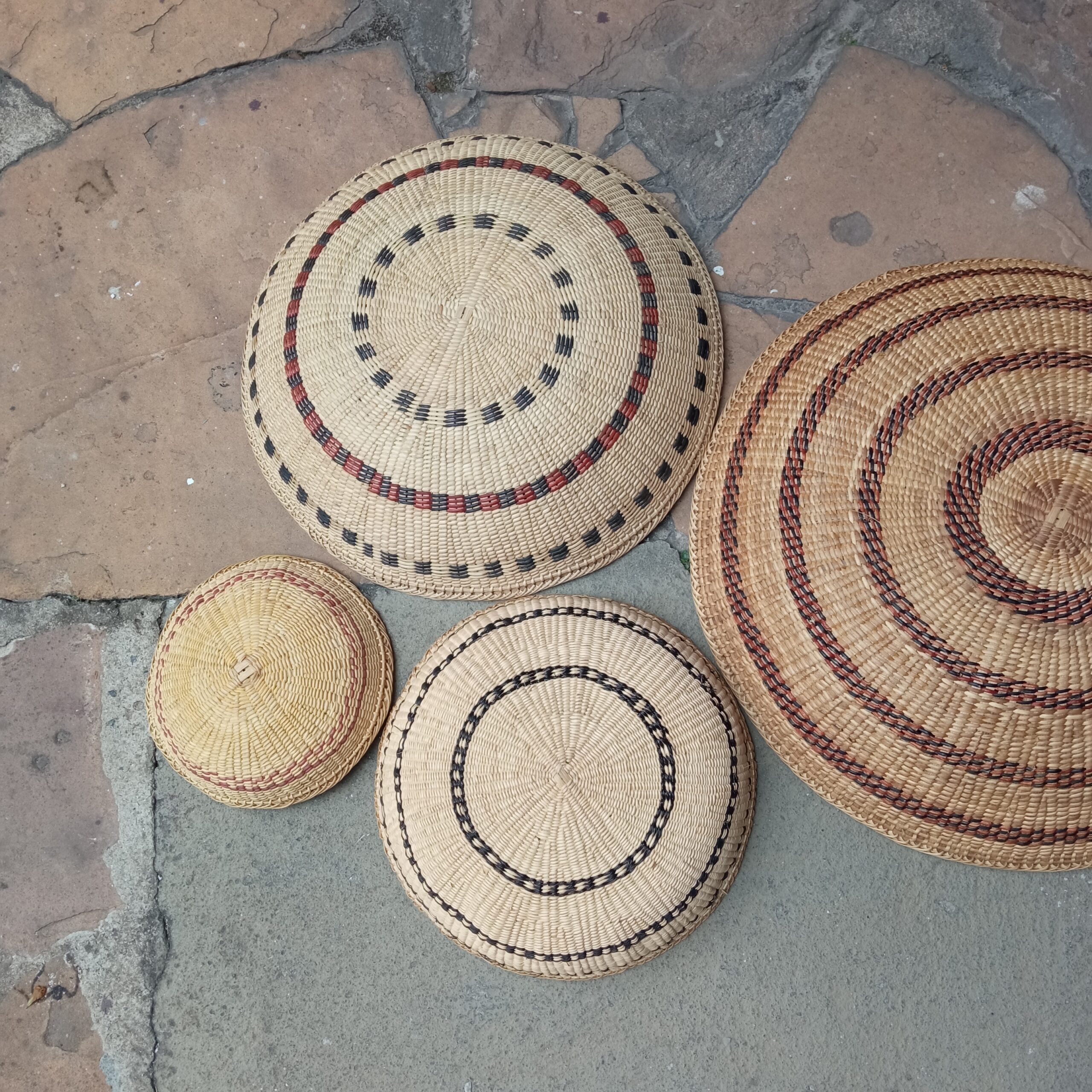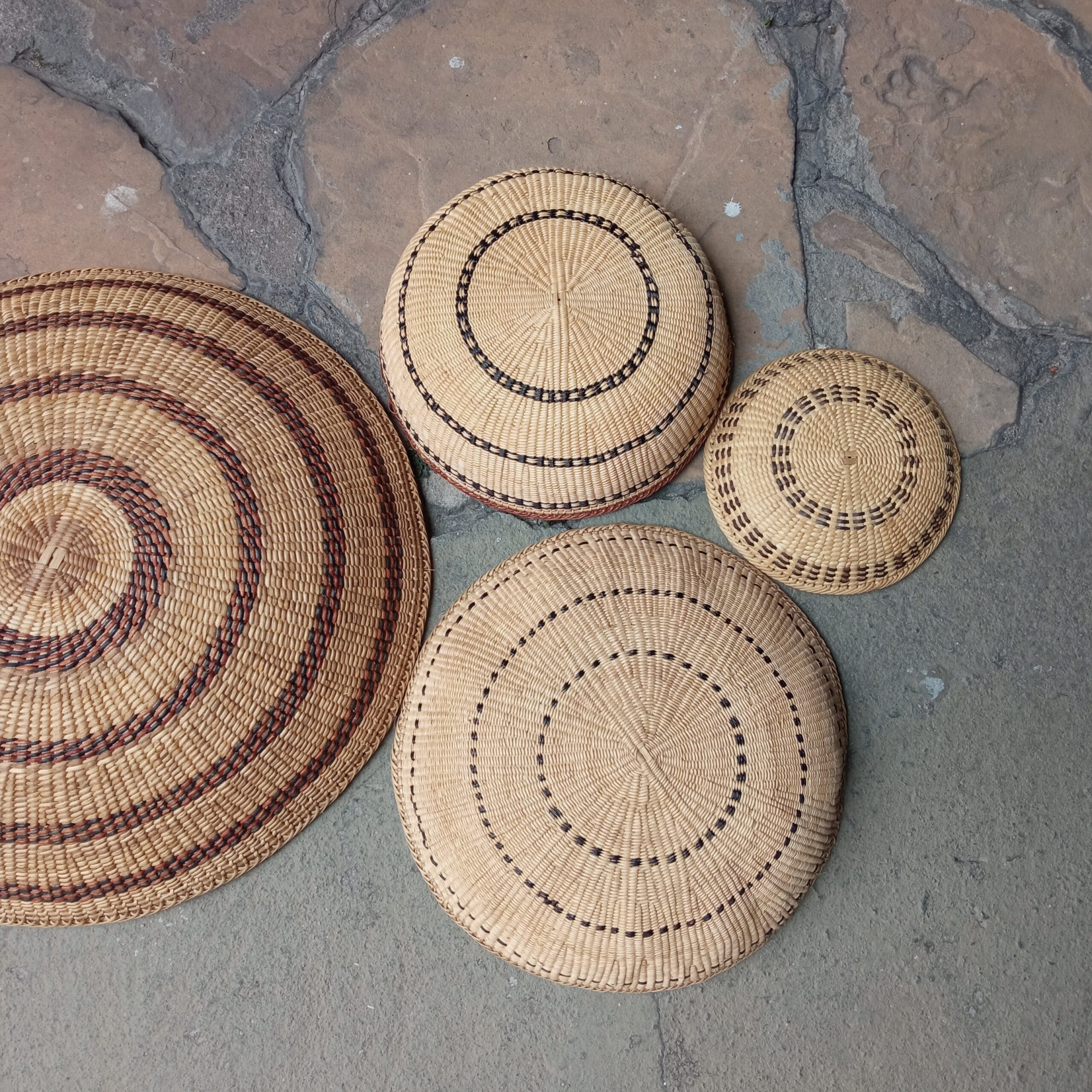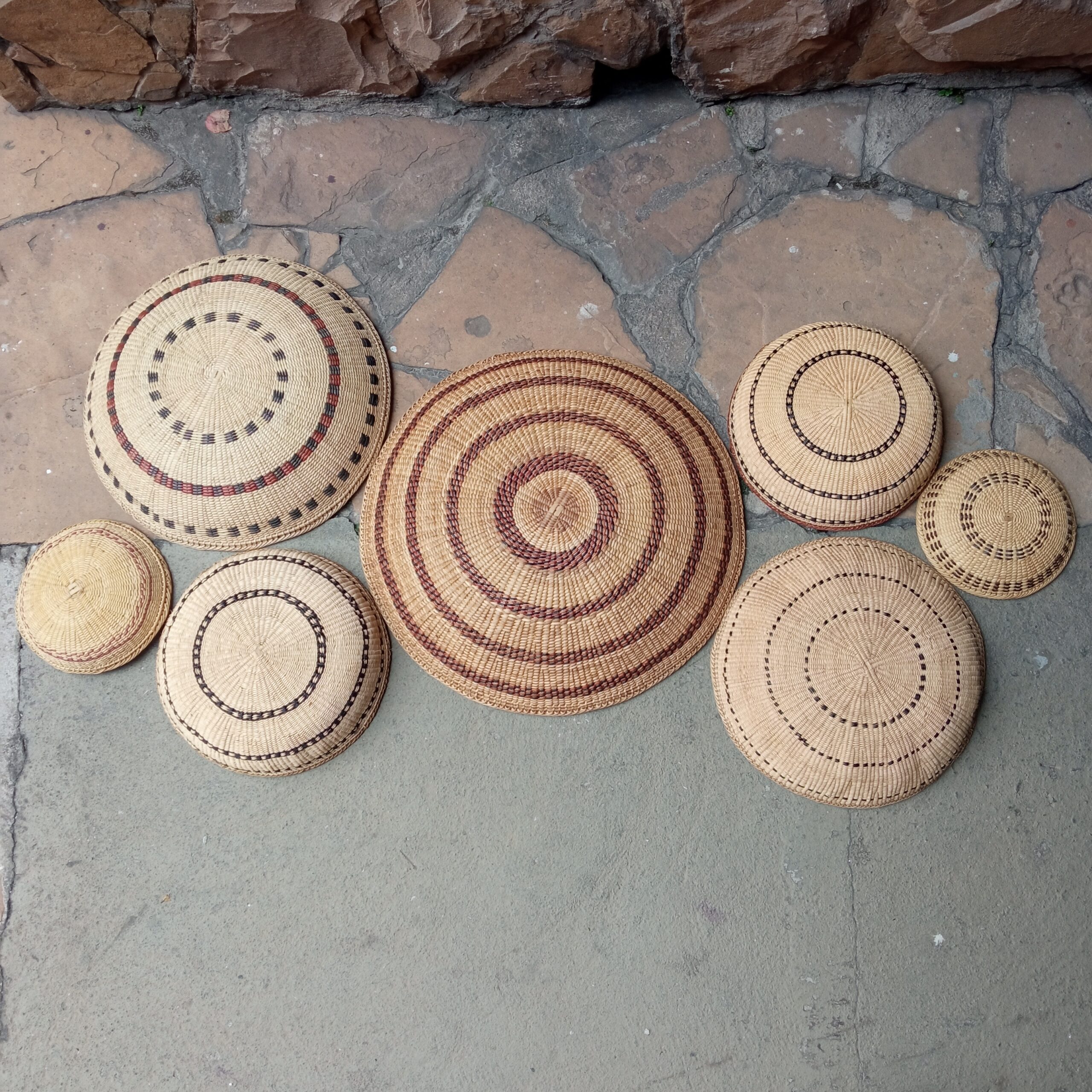 Kit com 7 cestas xotó do Povo Yanomami, em cipó titica e detalhes em cores marrom e preto (pigmento natural)- (2 PPs – 20 cm diâmetro x 8 cm altura, 2 Ps – 29 cm diâmetro x 8 cm altura, 1 M – 34 cm diâmetro x 8 cm altura, 1 G – 41 cm diâmetro x 10 cm altura e 1 GG – 50 cm diâmetro x 10 cm altura). Área da foto de 1,00 m x 1,50m.