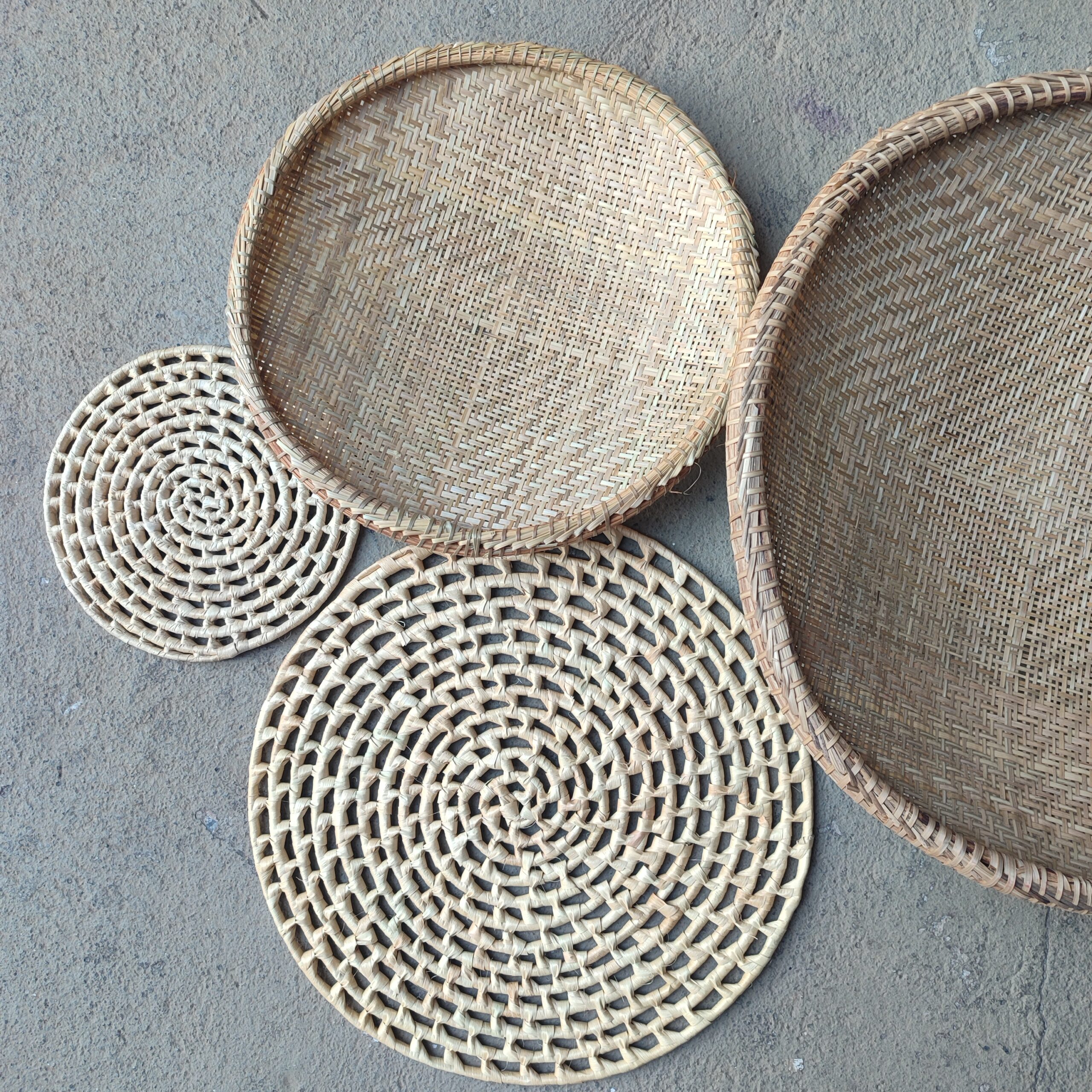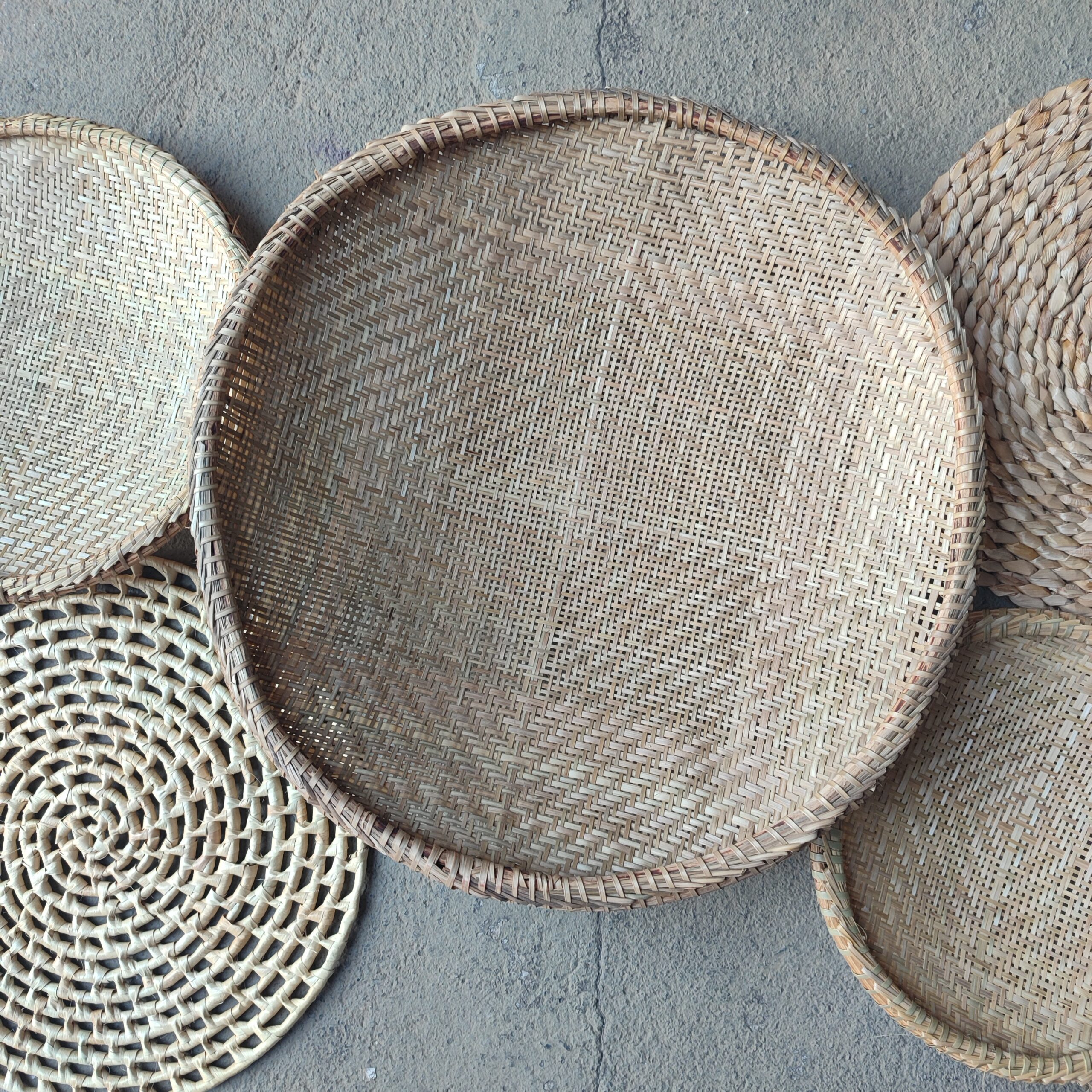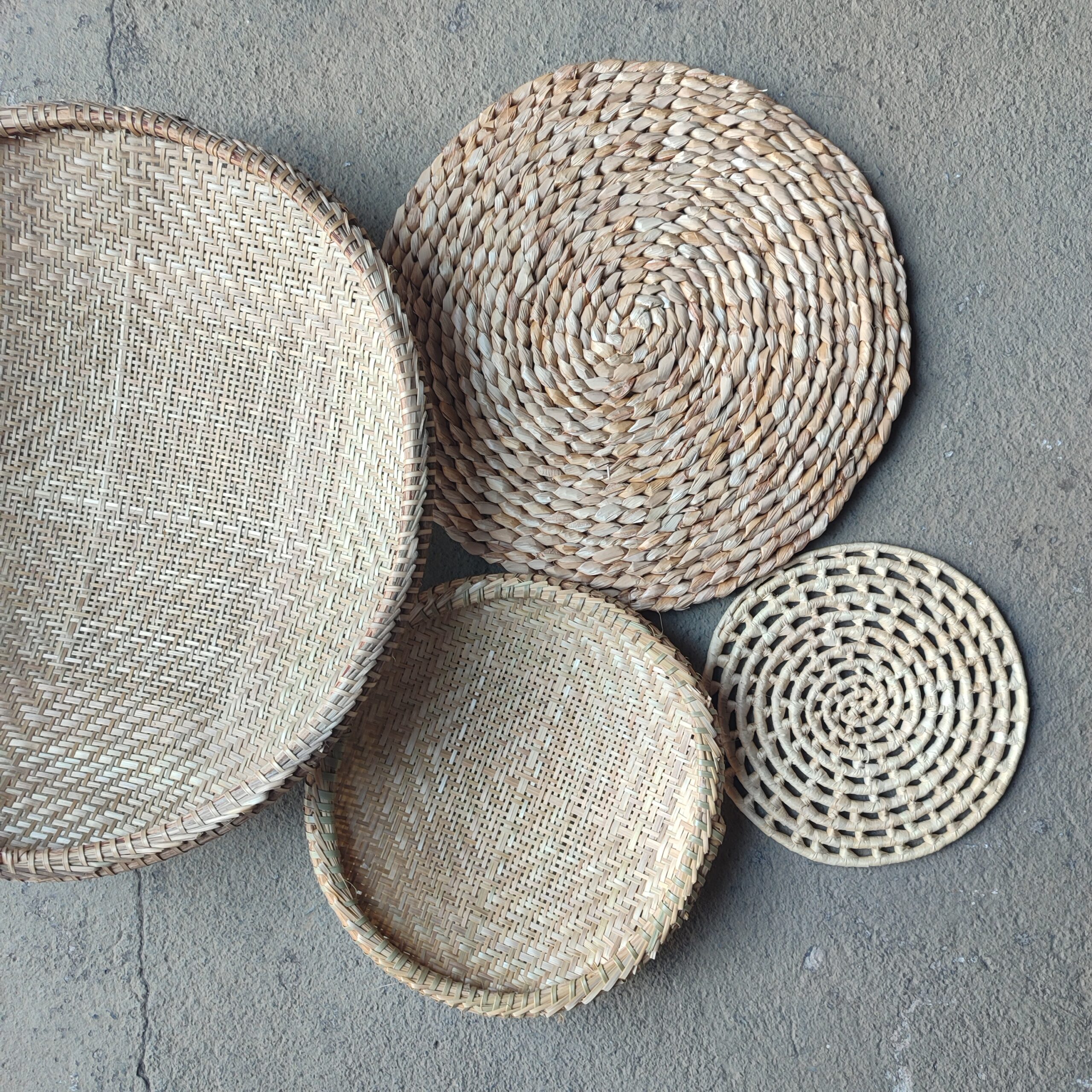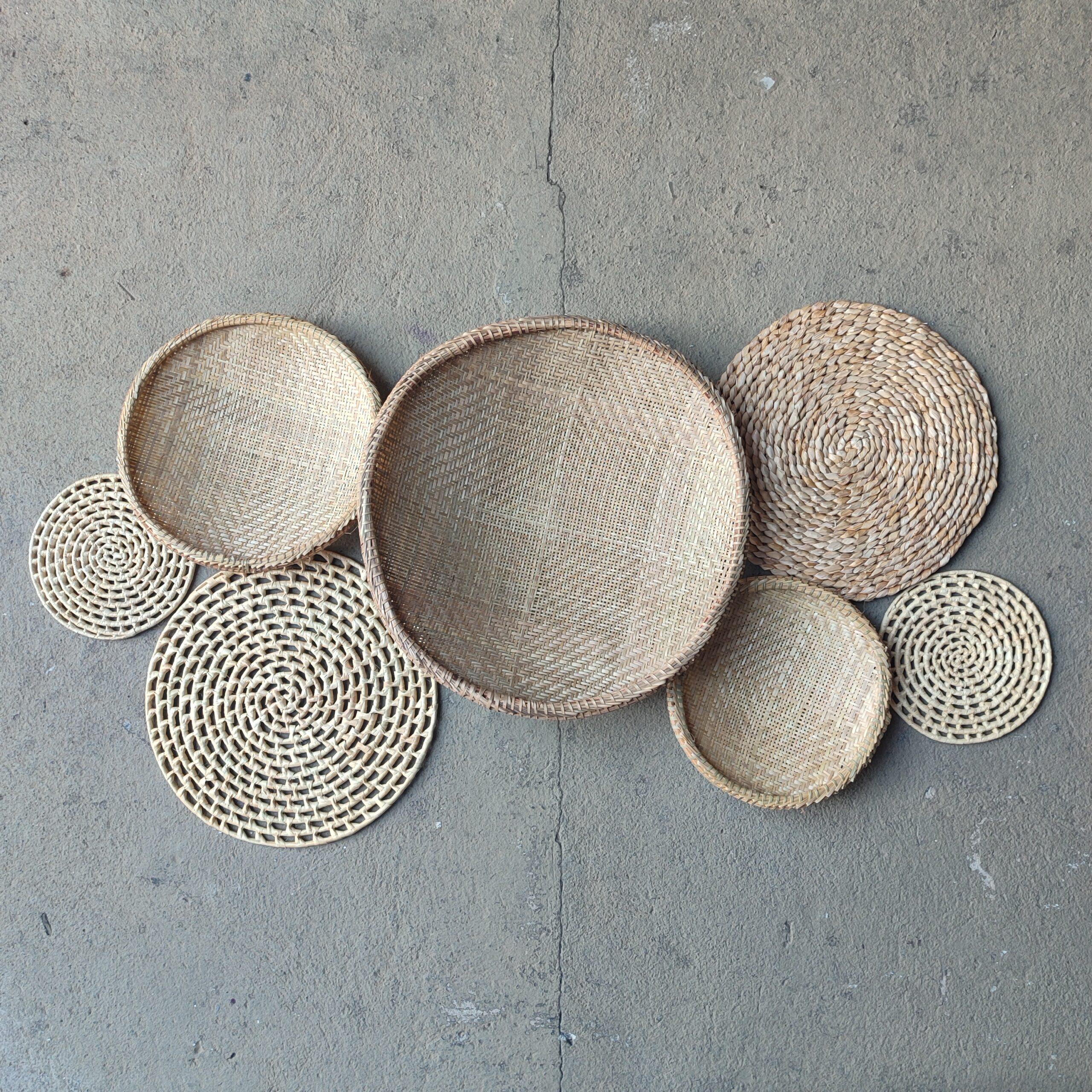 Kit com 7 cestas para decorar a parede – 3 cestas em taquara (1 unid – 25 cm diâmetro x 5 cm altura, 1 unid – 30 cm diâmetro x 5 cm altura e 1 unid – 40 cm diâmetro x 5 cm altura), 2 descansos em palha de carnaúba (20 cm diâmetro), 1 sousplat em palha de carnaúba (35 cm diâmetro) e 1 sousplat em palha de taboa (35 cm diâmetro). Área da foto de 1,60 m x 1,00m.
