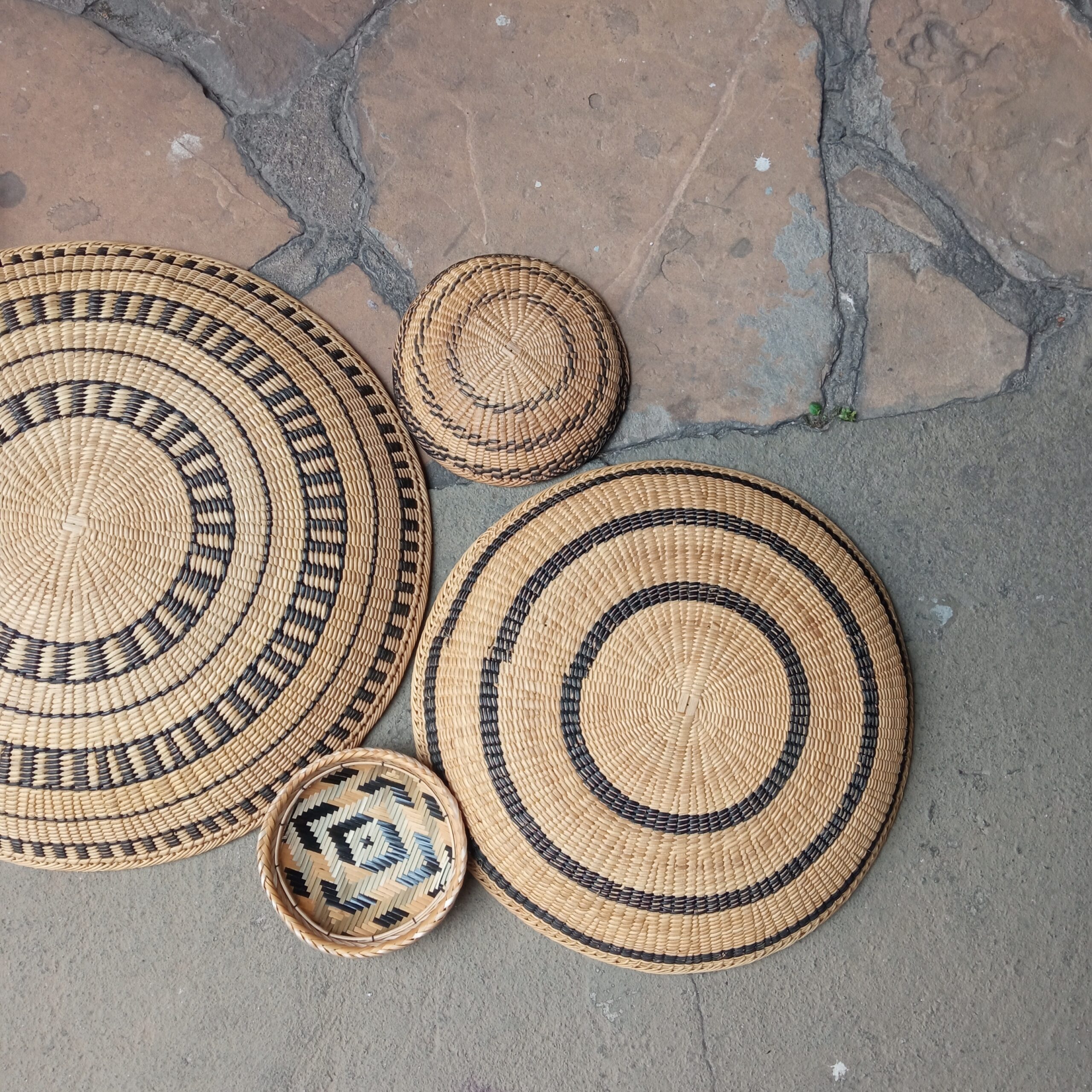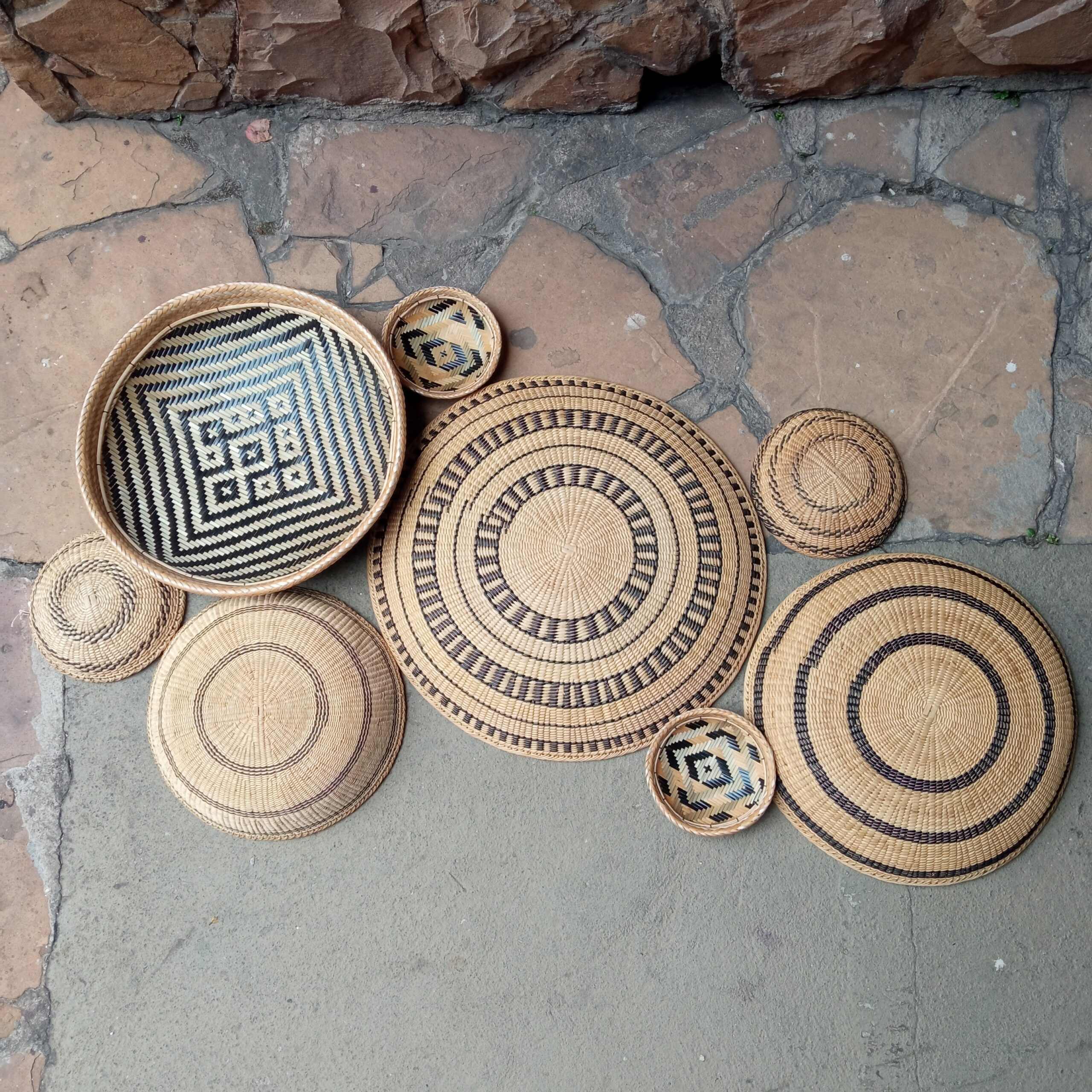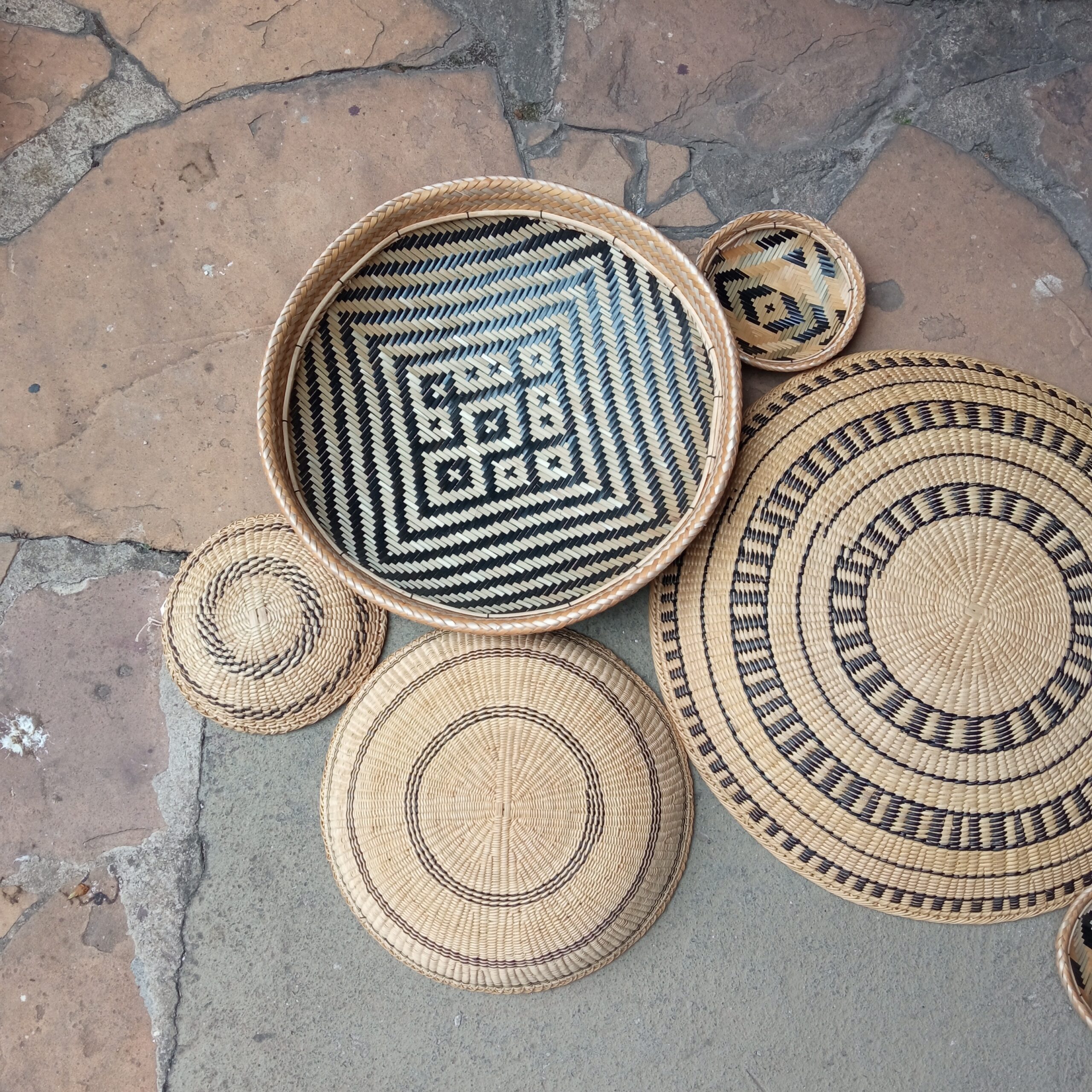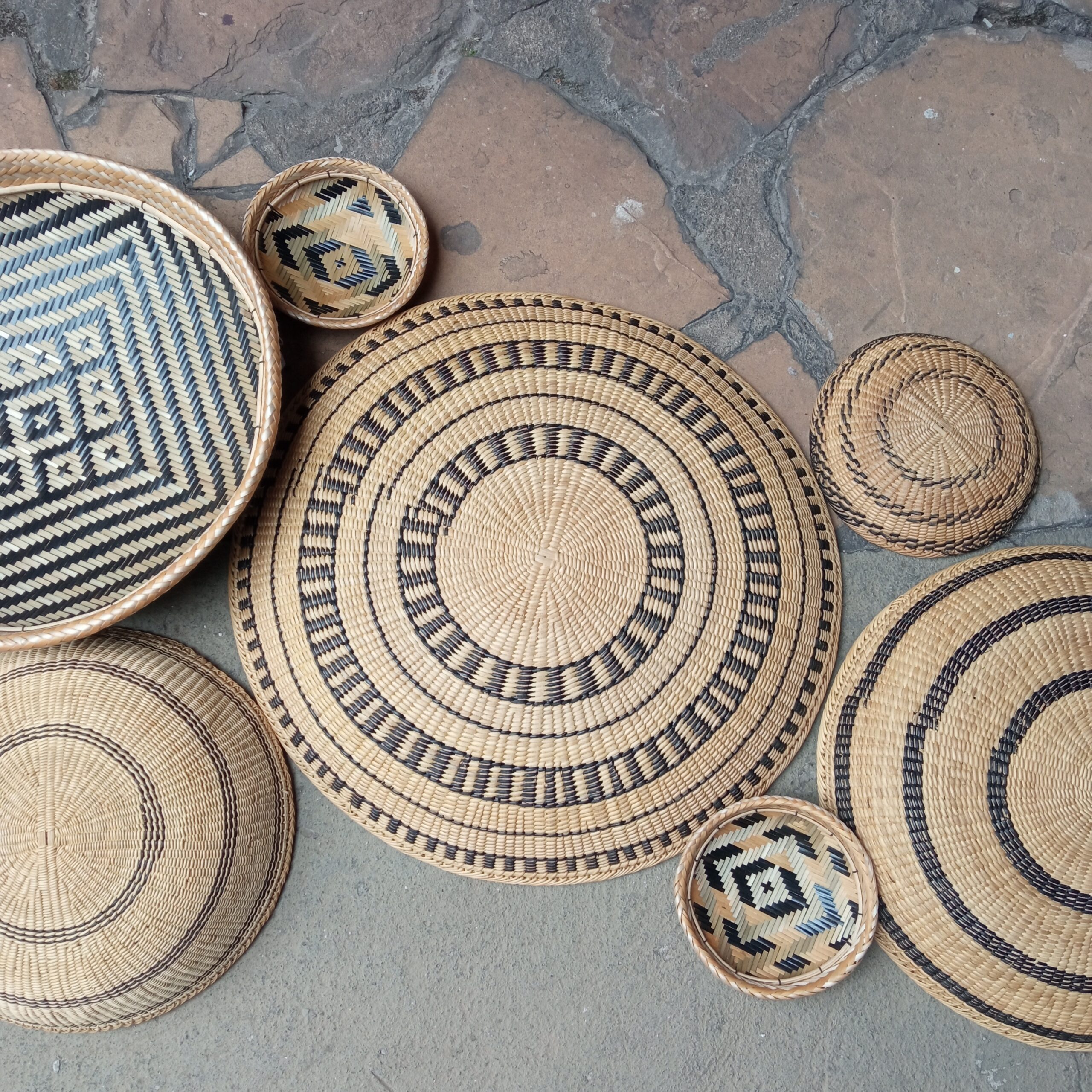 Kit com 8 cestas para decorar a parede – 5 cestas em cipó titica e tingimento natural do Povo Yanomami (2 PPs – 20 cm diâmetro x 6 cm altura, 1 P – 28 cm diâmetro x 6 cm altura, 1 M – 34 cm diâmetro x 7 cm altura e 1 GG – 50 cm diâmetro x 8 cm altura) e 3 peneiras em arumã e tingimento natural do Povo Baniwa (2 unids. – 15 cm diâmetro x 3 cm altura, 1 unid. – 40 cm diâmetro x 5 cm altura). Área da foto de 1,60m x 1,00m.