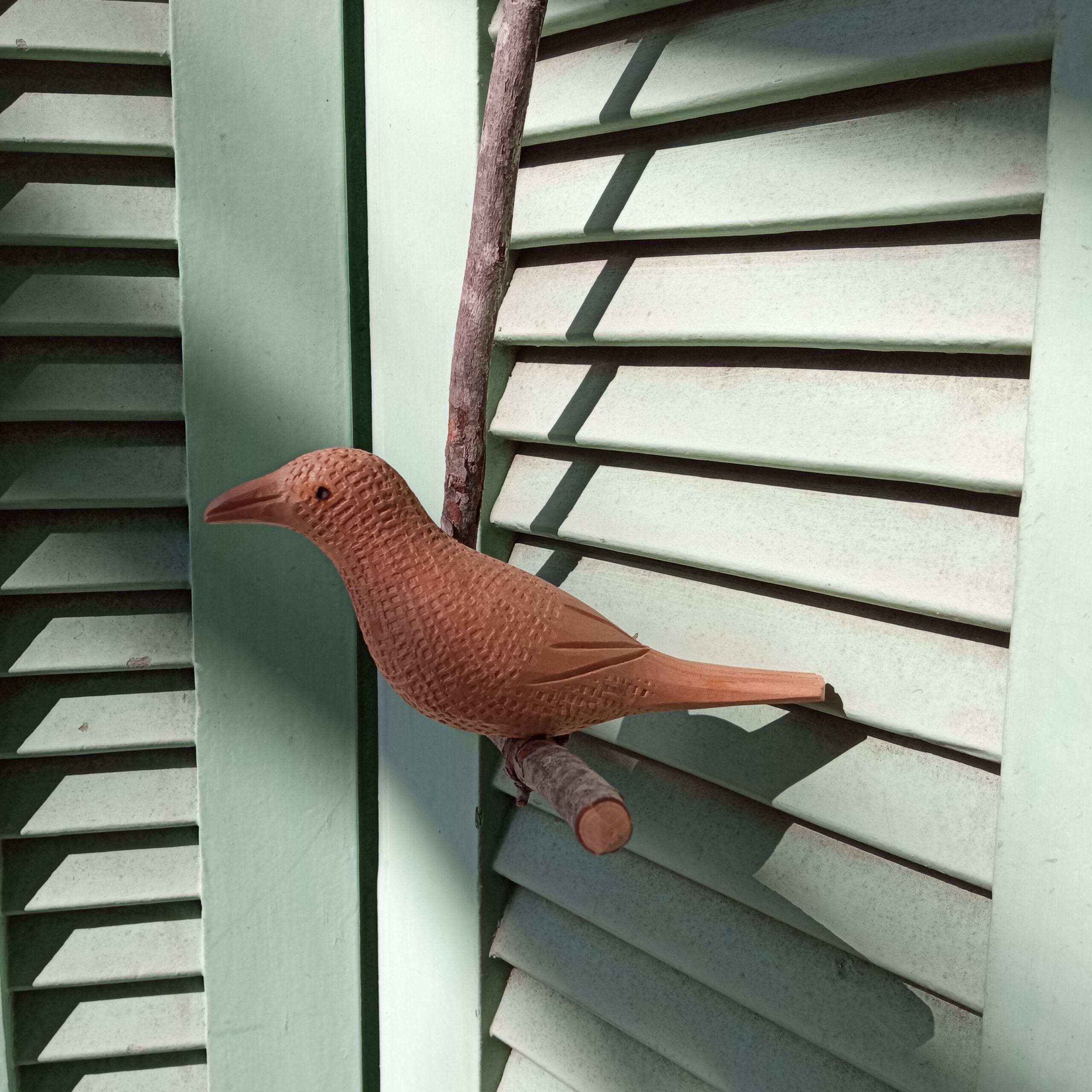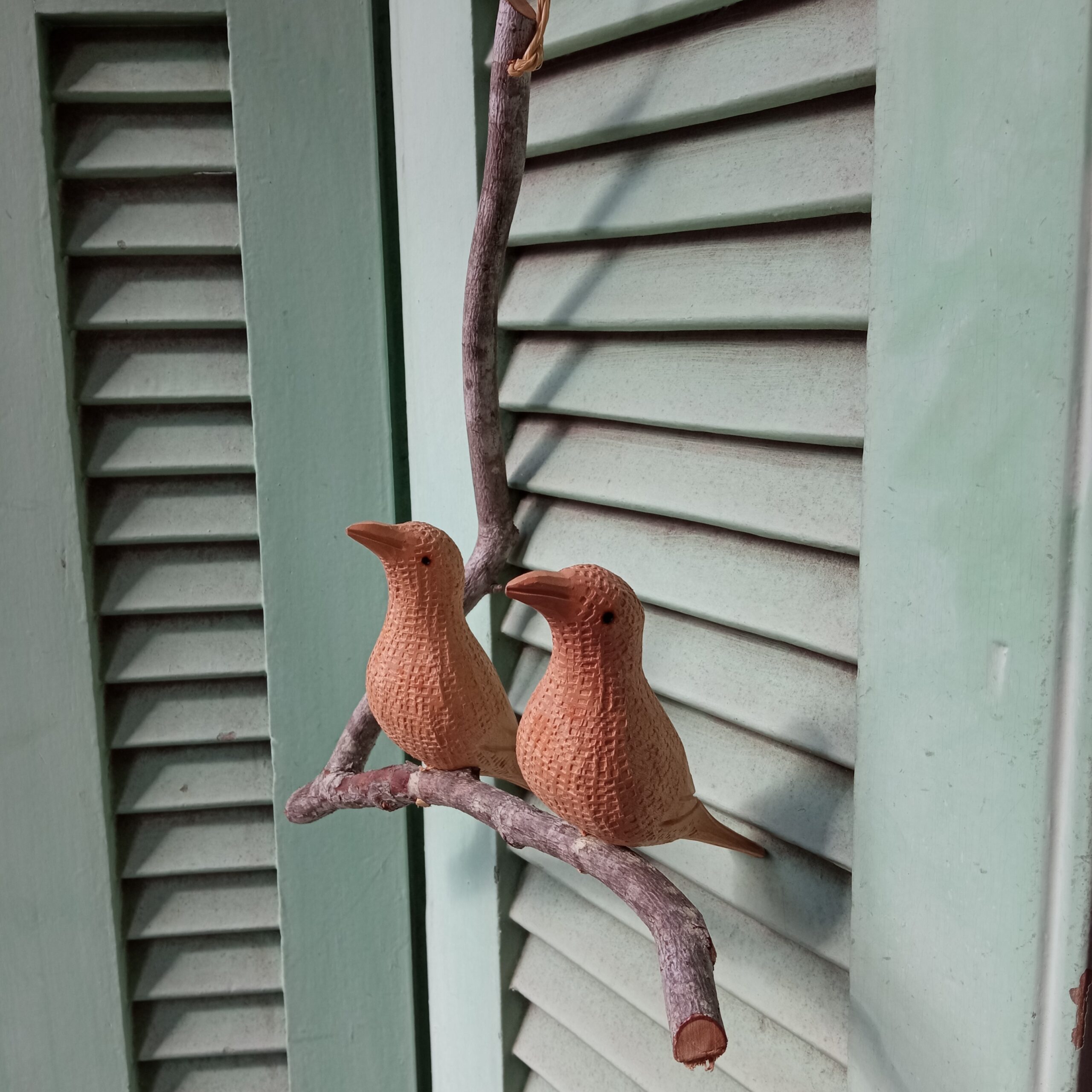 Móbile de pássaro duplo no galho, entalhado à mão na madeira umburana.