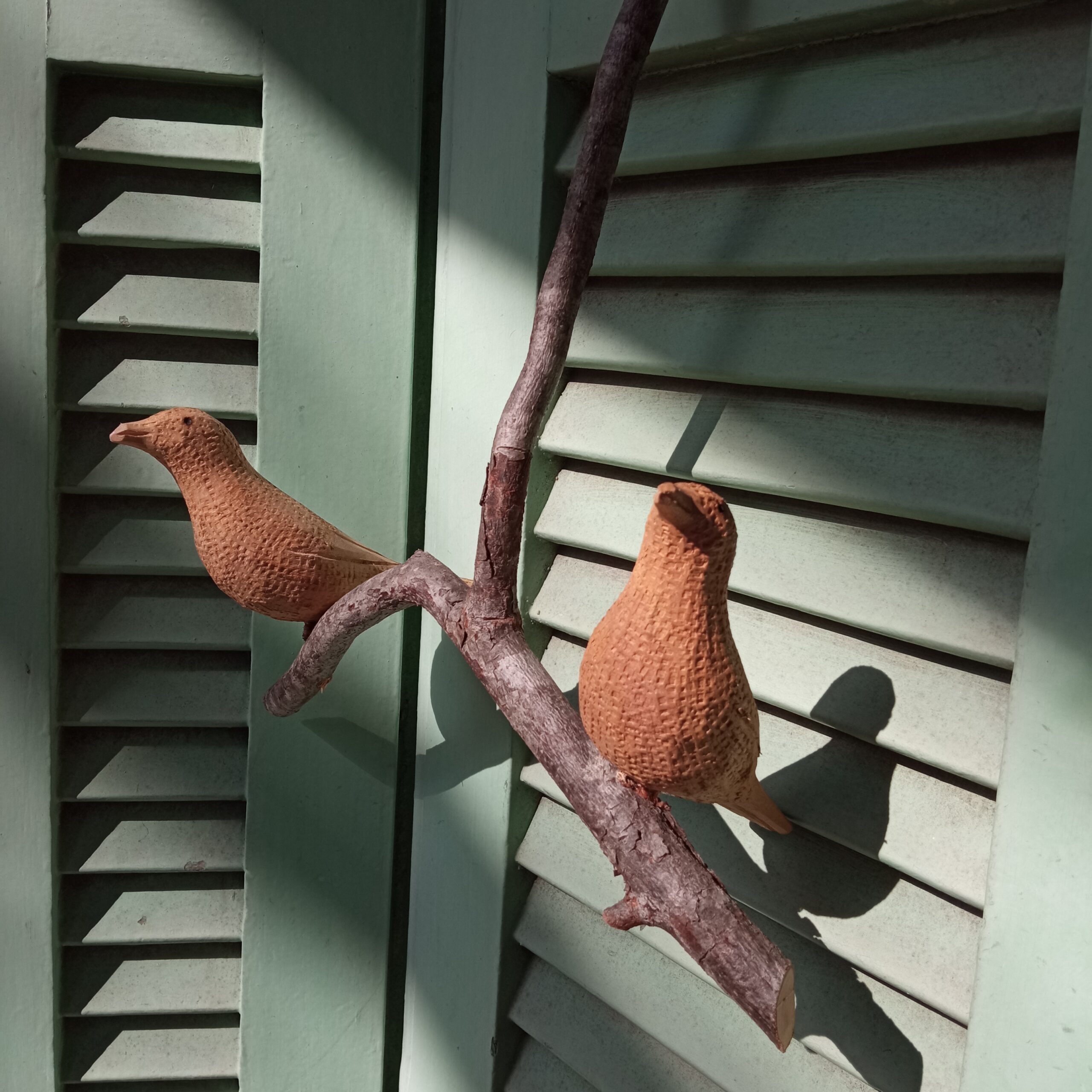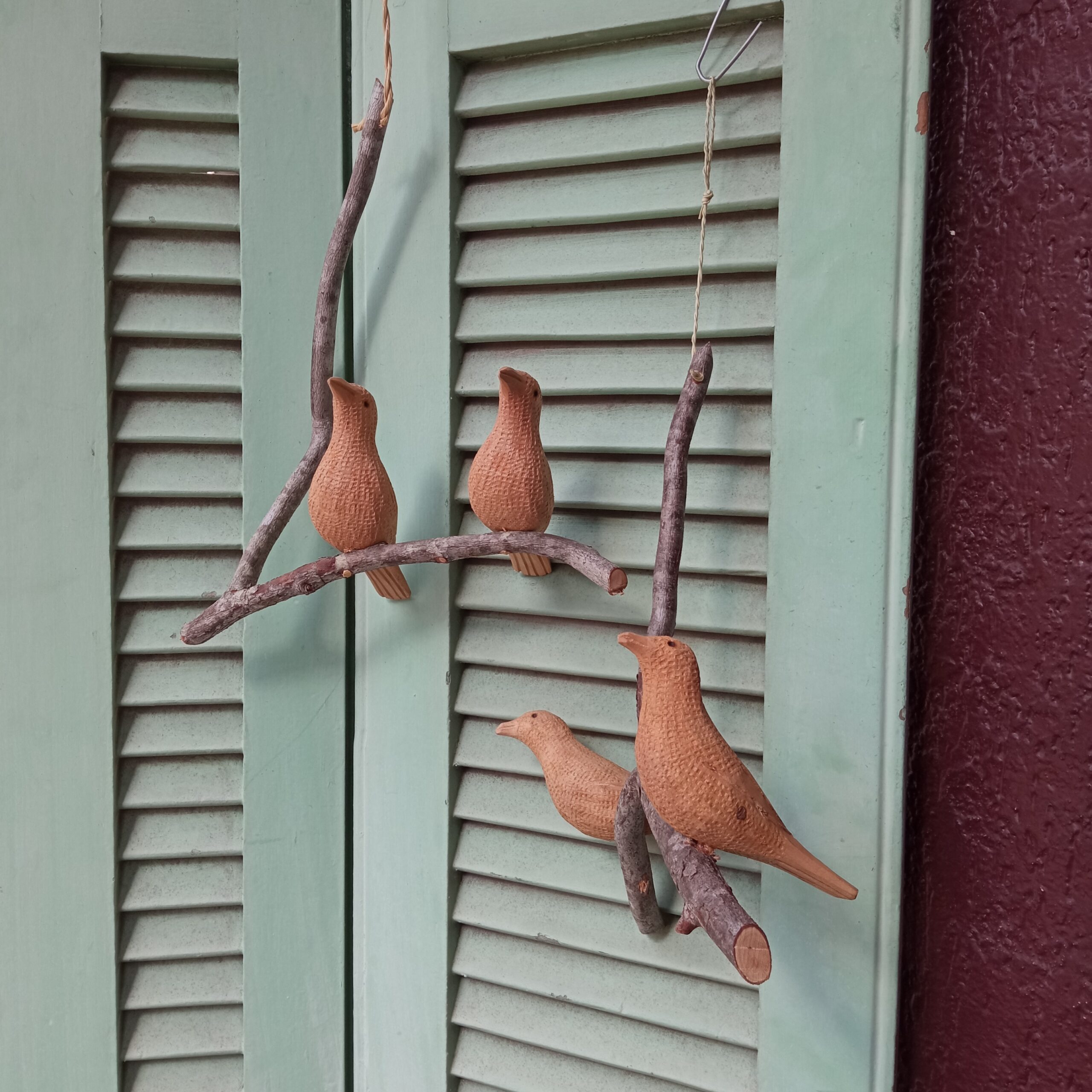 Móbile com dois pássaros no galho suspenso. Entalhados na madeira umburana por artesãos do sertão da Bahia.