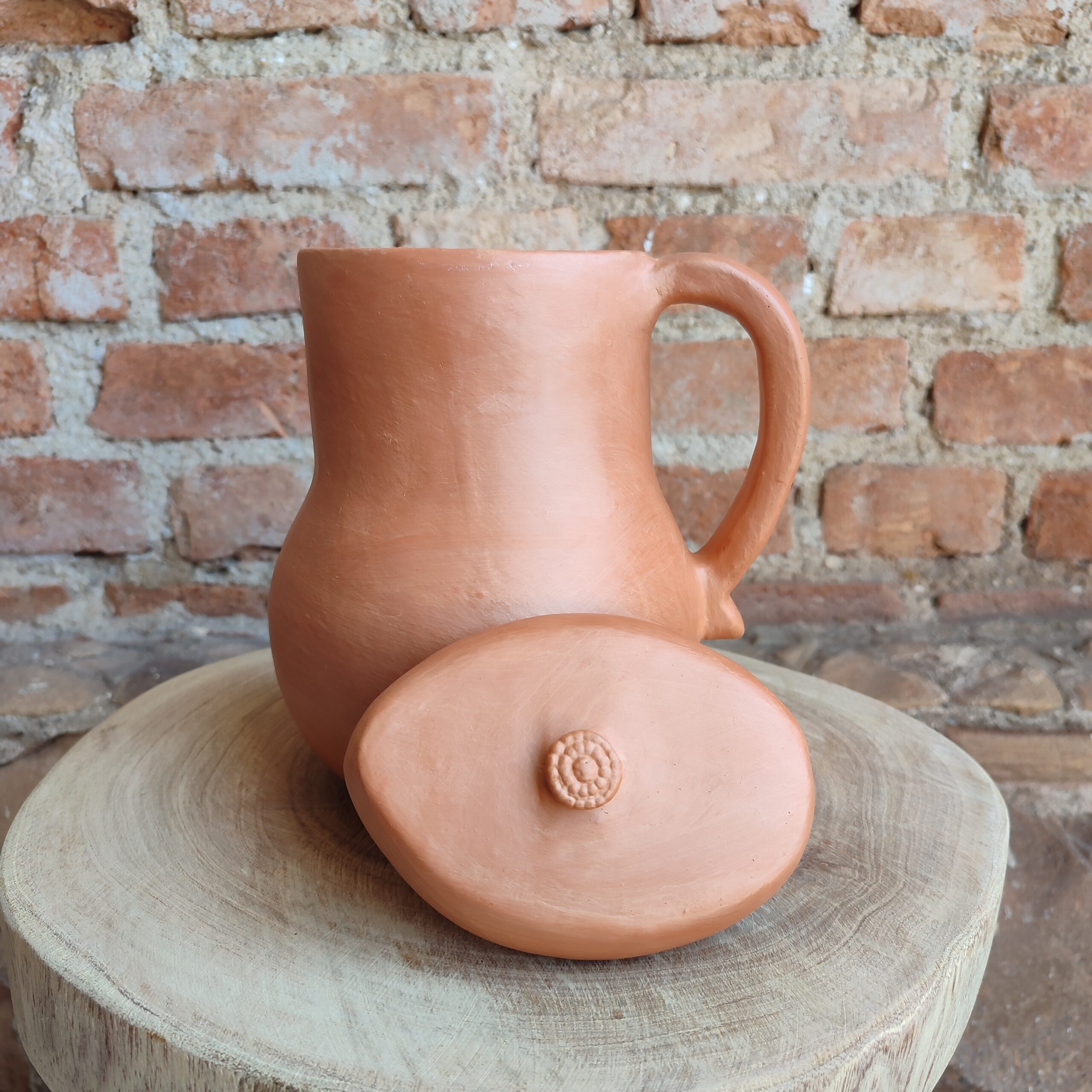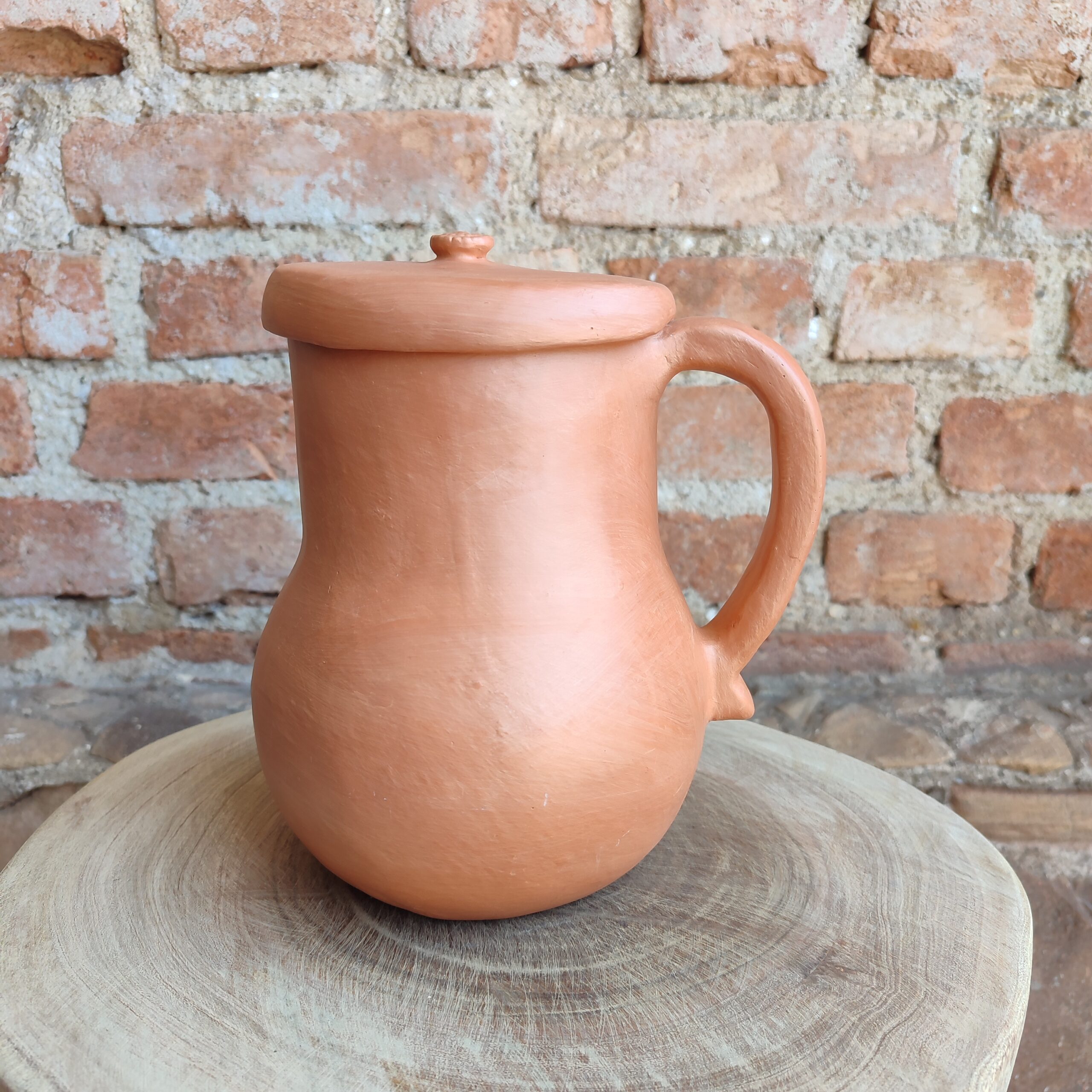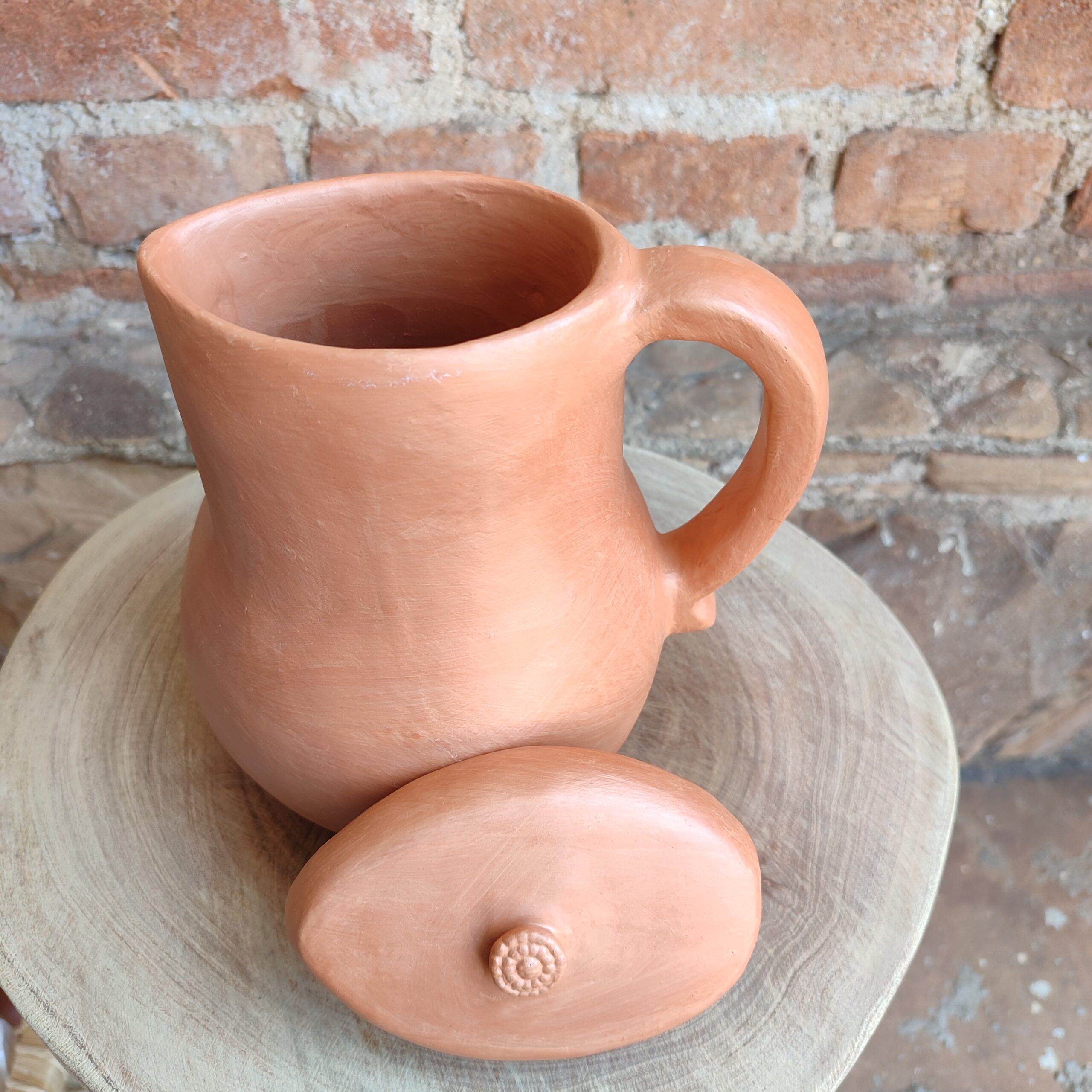 Moringa de cerâmica com tampa, com pintura do próprio barro, cores da natureza. Peça única. Confeccionada por artesãs do Vale do Jequitinhonha – MG. Peça decorativa.