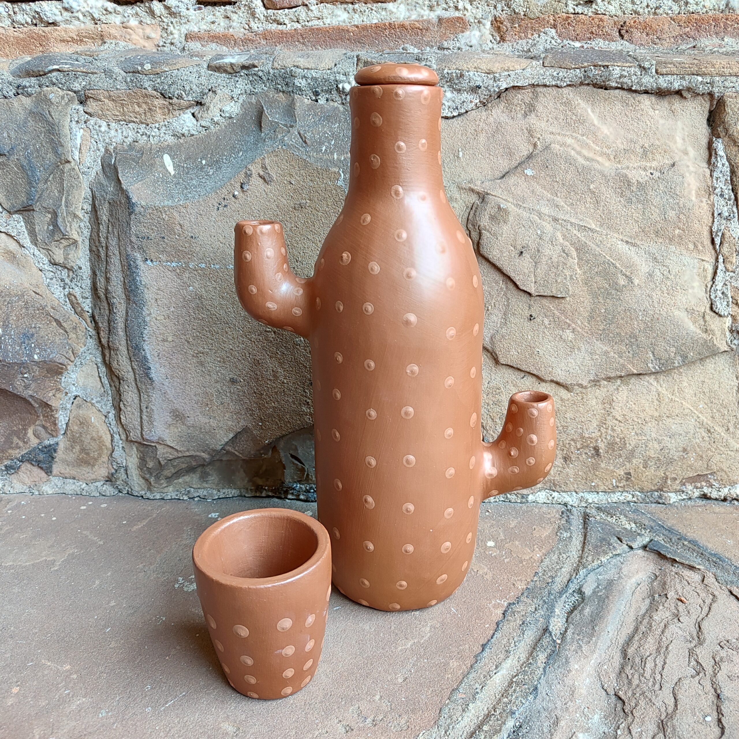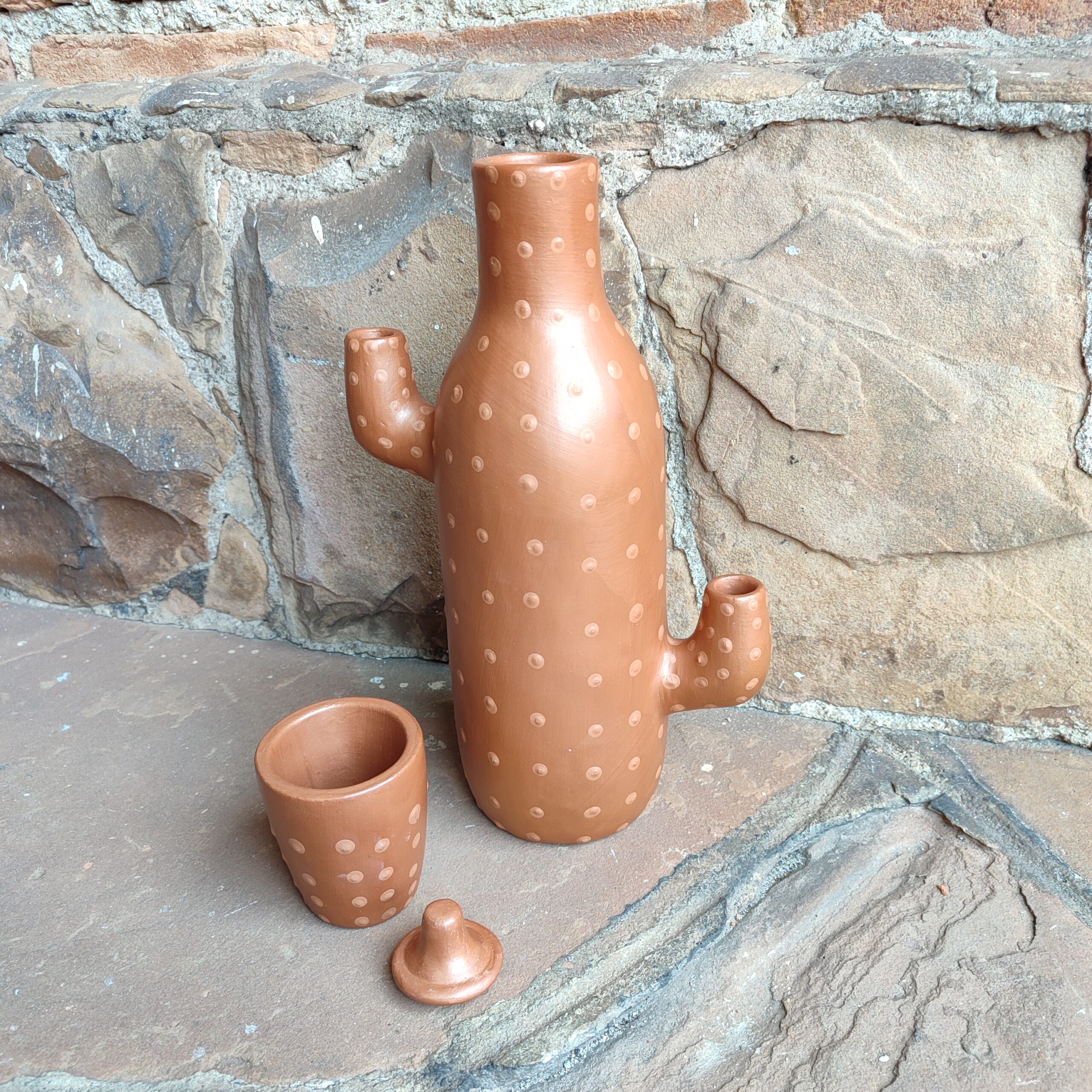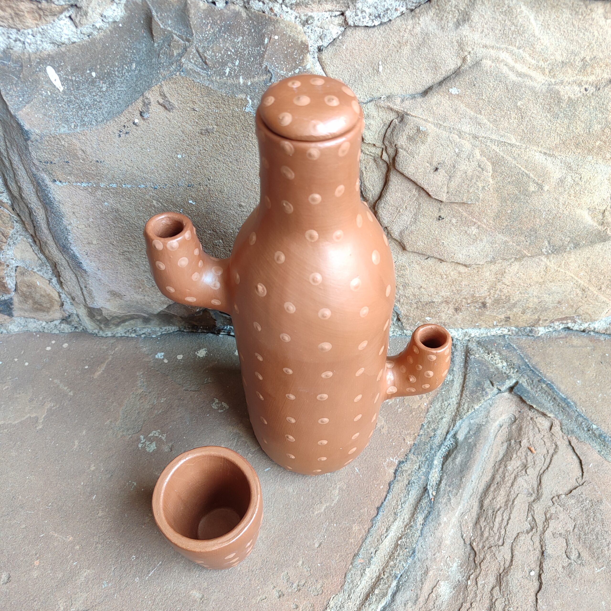 Moringa de cerâmica com tampa e copo, com pintura do próprio barro, cores da natureza. Confeccionada por artesãs do Vale do Jequitinhonha – MG. Para uso, descartar a primeira água, depois utilizar normalmente.