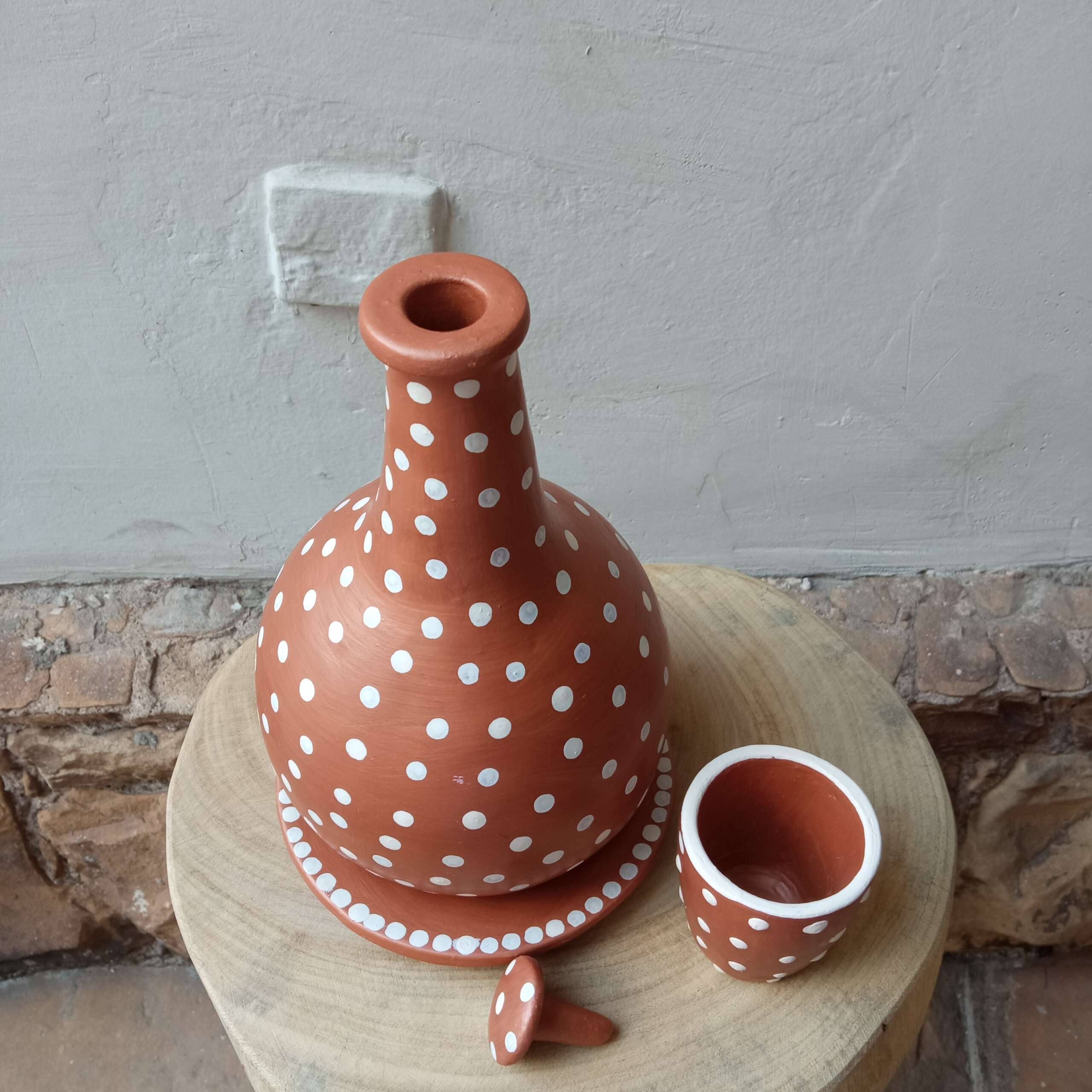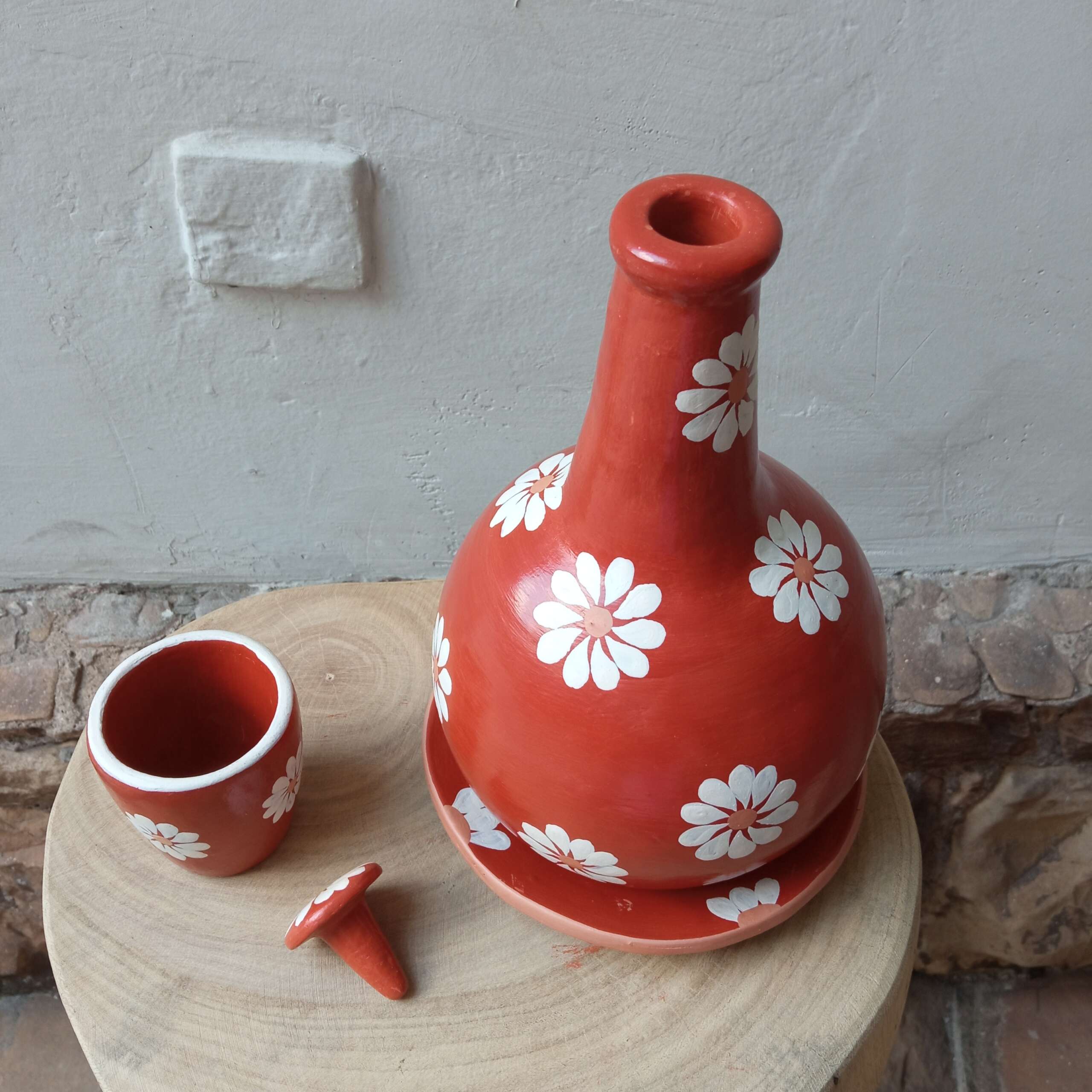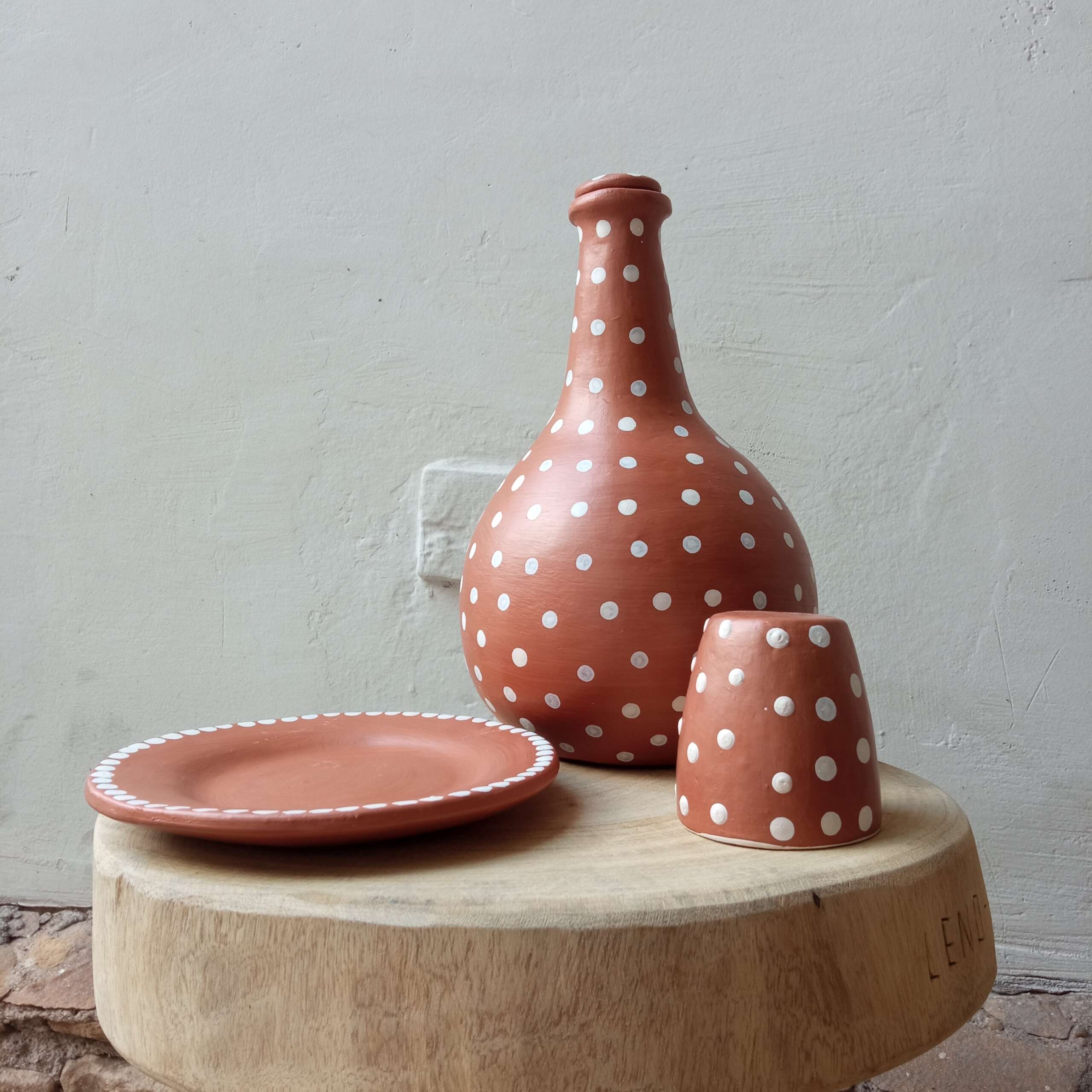 Moringa de cerâmica com prato, tampa e copo, com pintura do próprio barro, cores da natureza. Confeccionada por artesãs do Vale do Jequitinhonha.