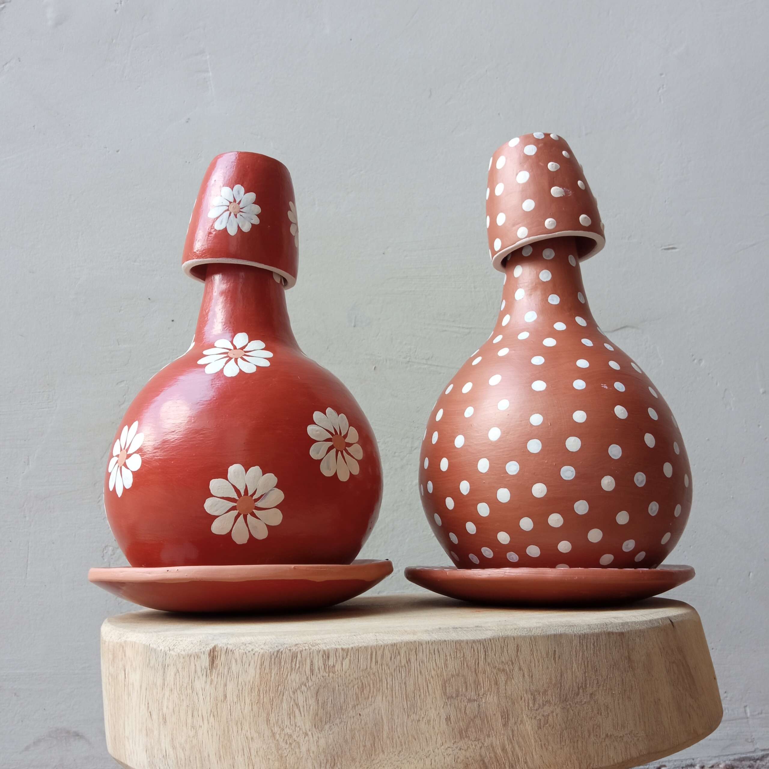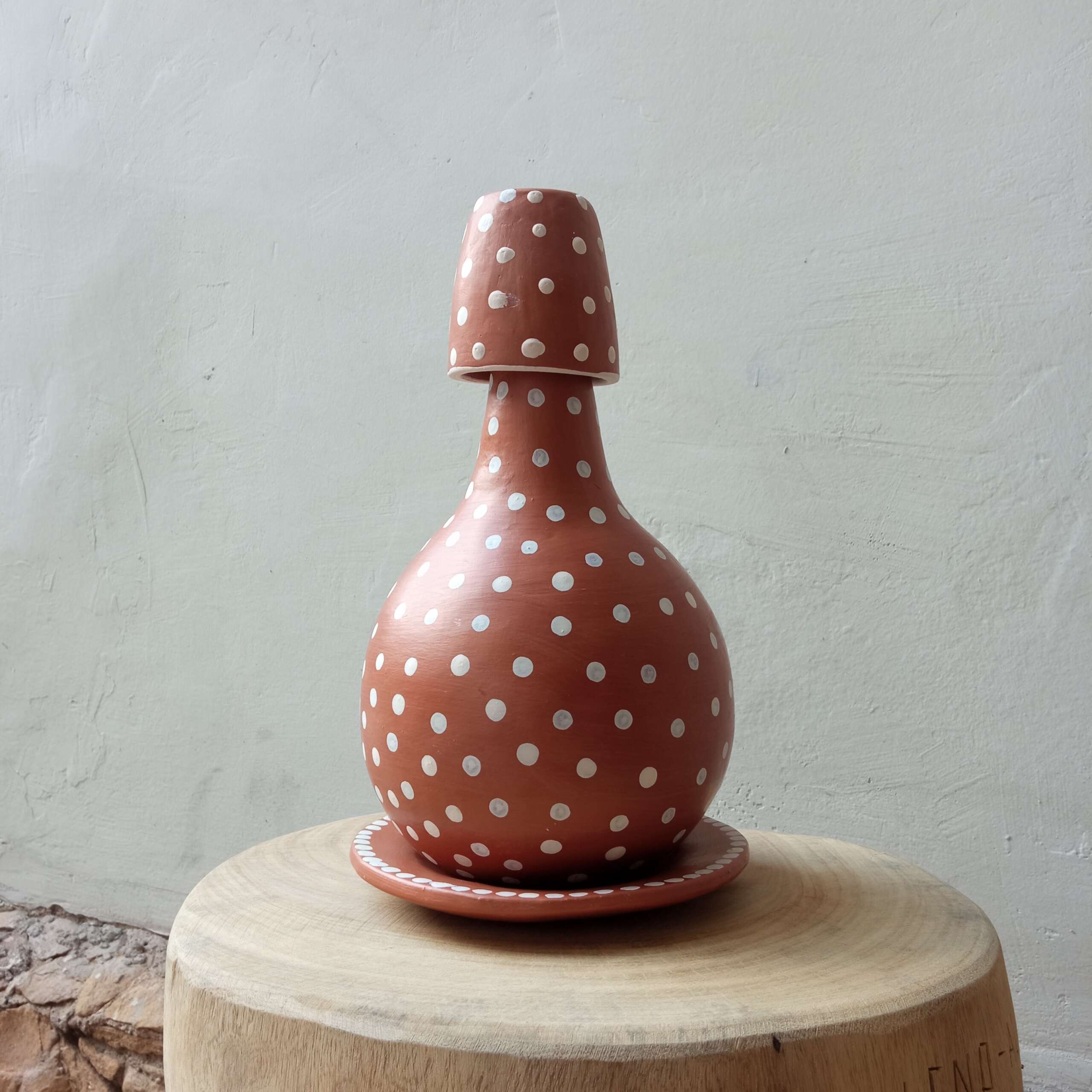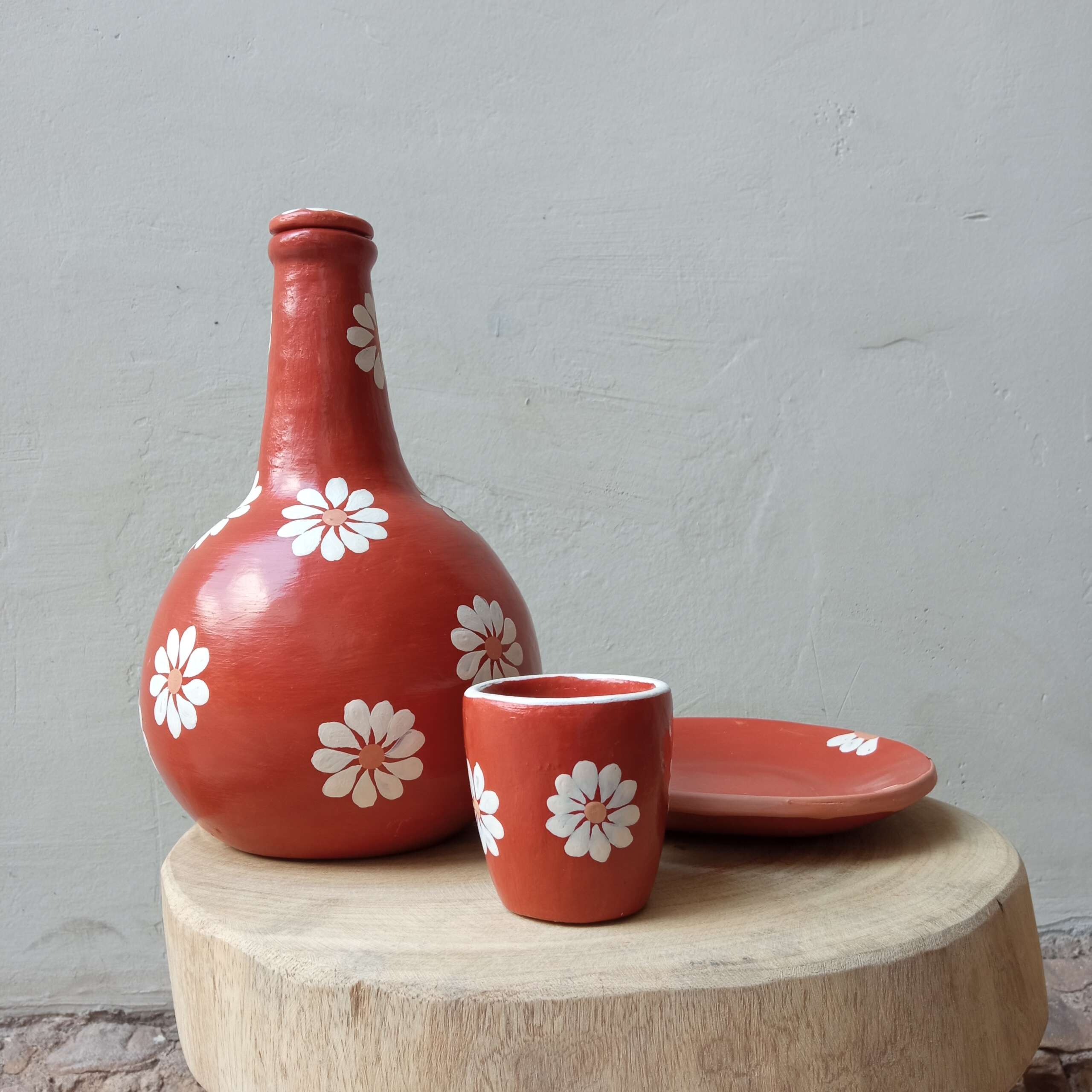 Moringa de cerâmica com prato, tampa e copo, com pintura do próprio barro, cores da natureza. Confeccionada por artesãs do Vale do Jequitinhonha.