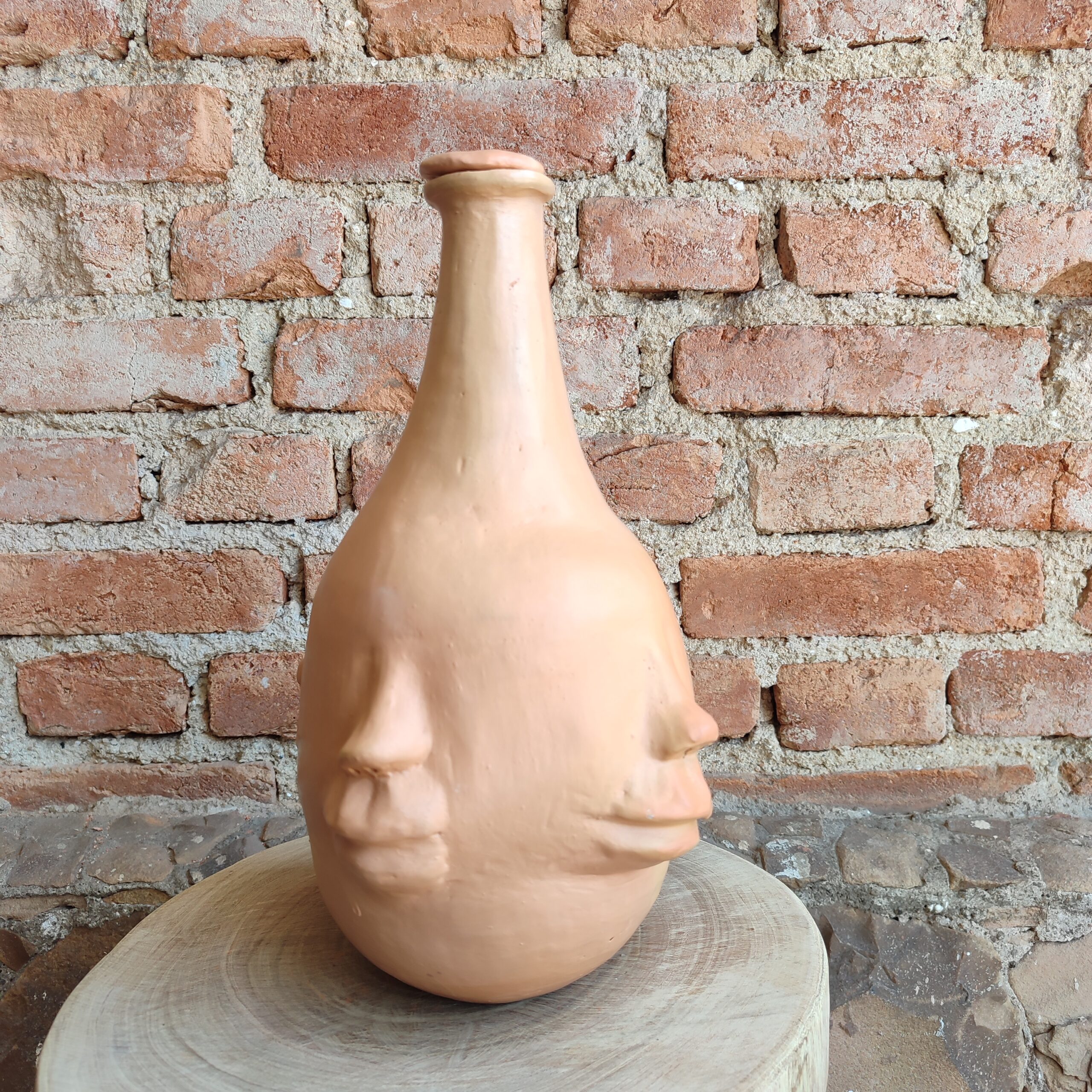 Moringa de cerâmica com tampa adornado por rostos, com pintura do próprio barro, cores da natureza. Confeccionada por Dona Rita, experiente Mestra do Vale do Jequitinhonha – MG. Para uso, descartar a primeira água, depois utilizar normalmente.