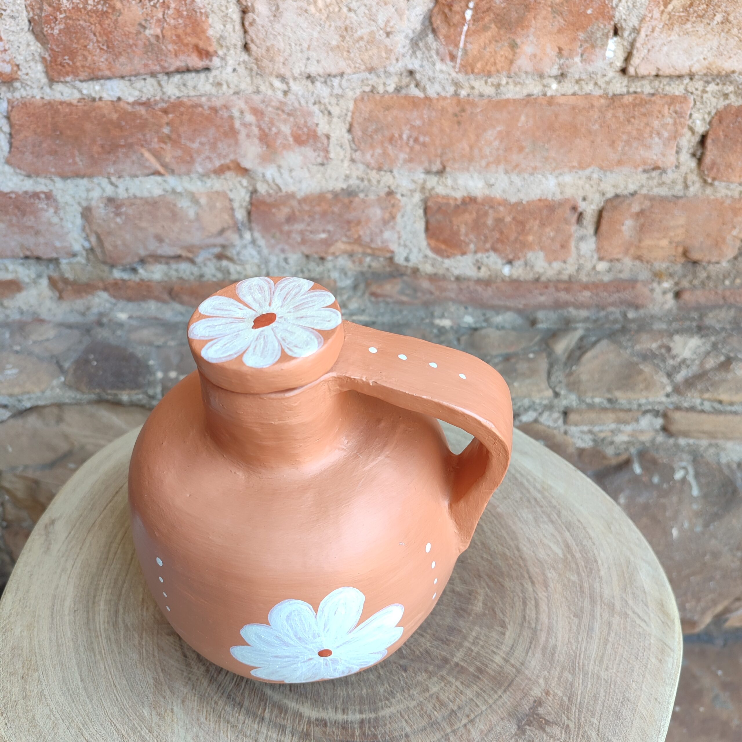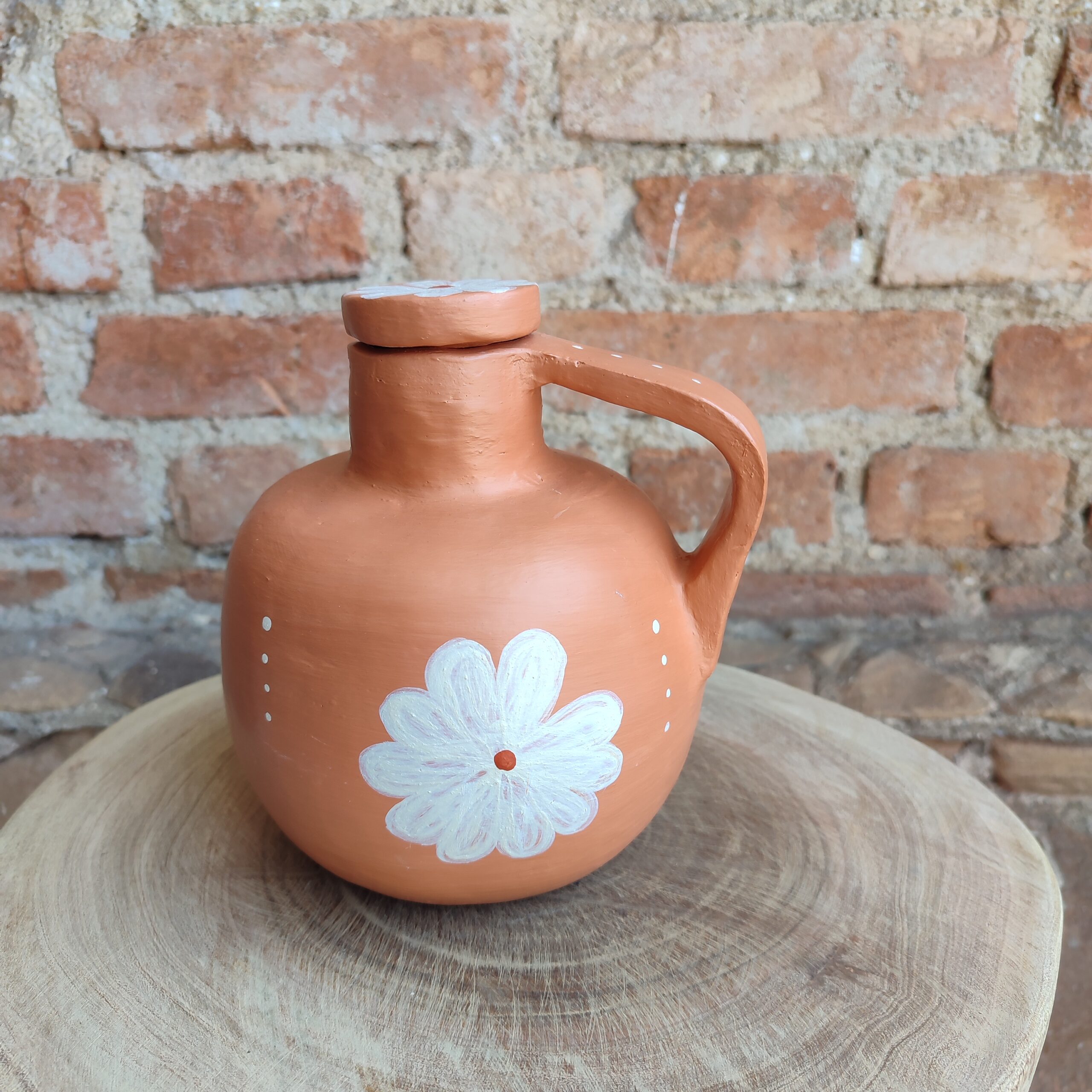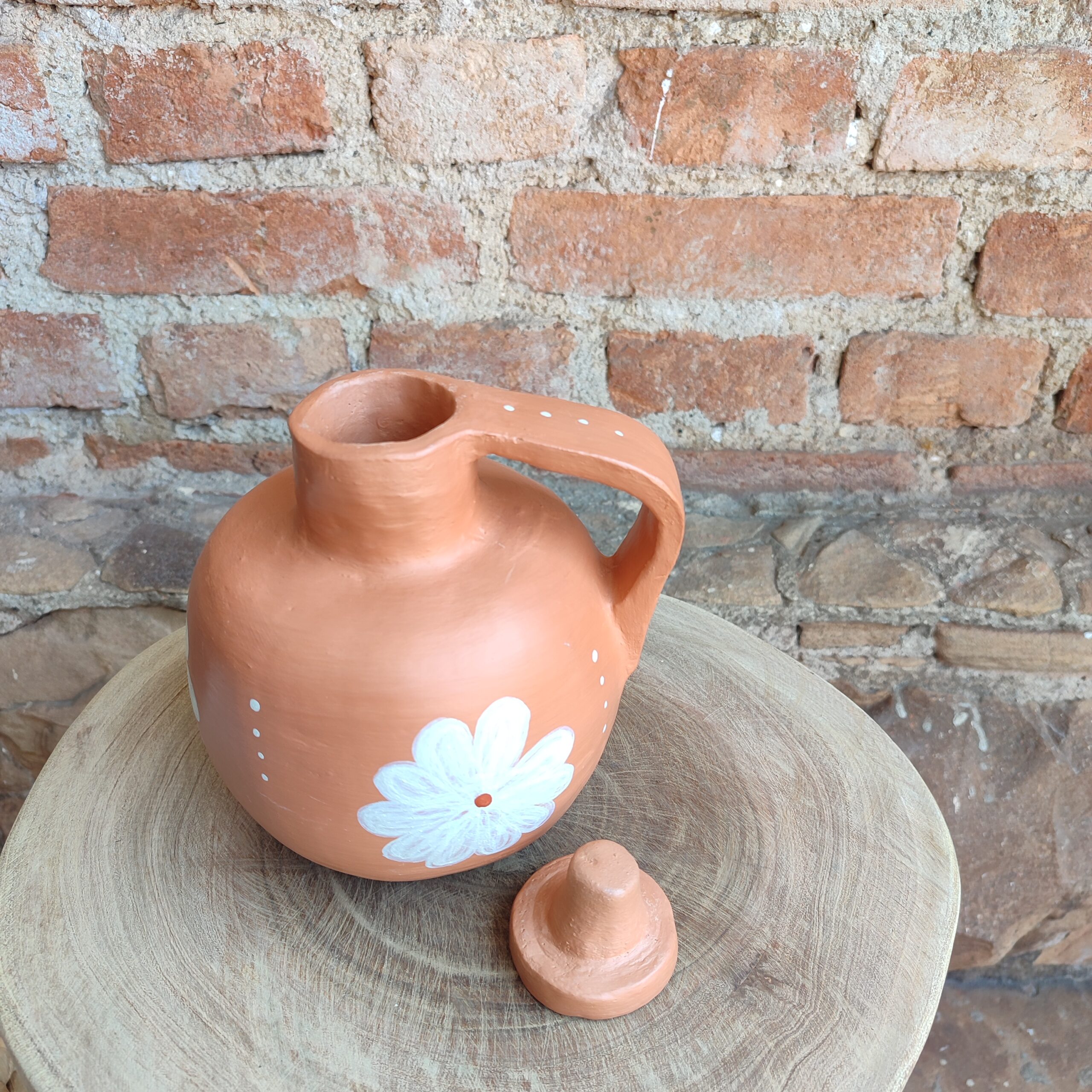 Moringa de cerâmica com tampa, com pintura do próprio barro, cores da natureza. Peça única. Confeccionada por artesãs do Vale do Jequitinhonha – MG. Peça decorativa.