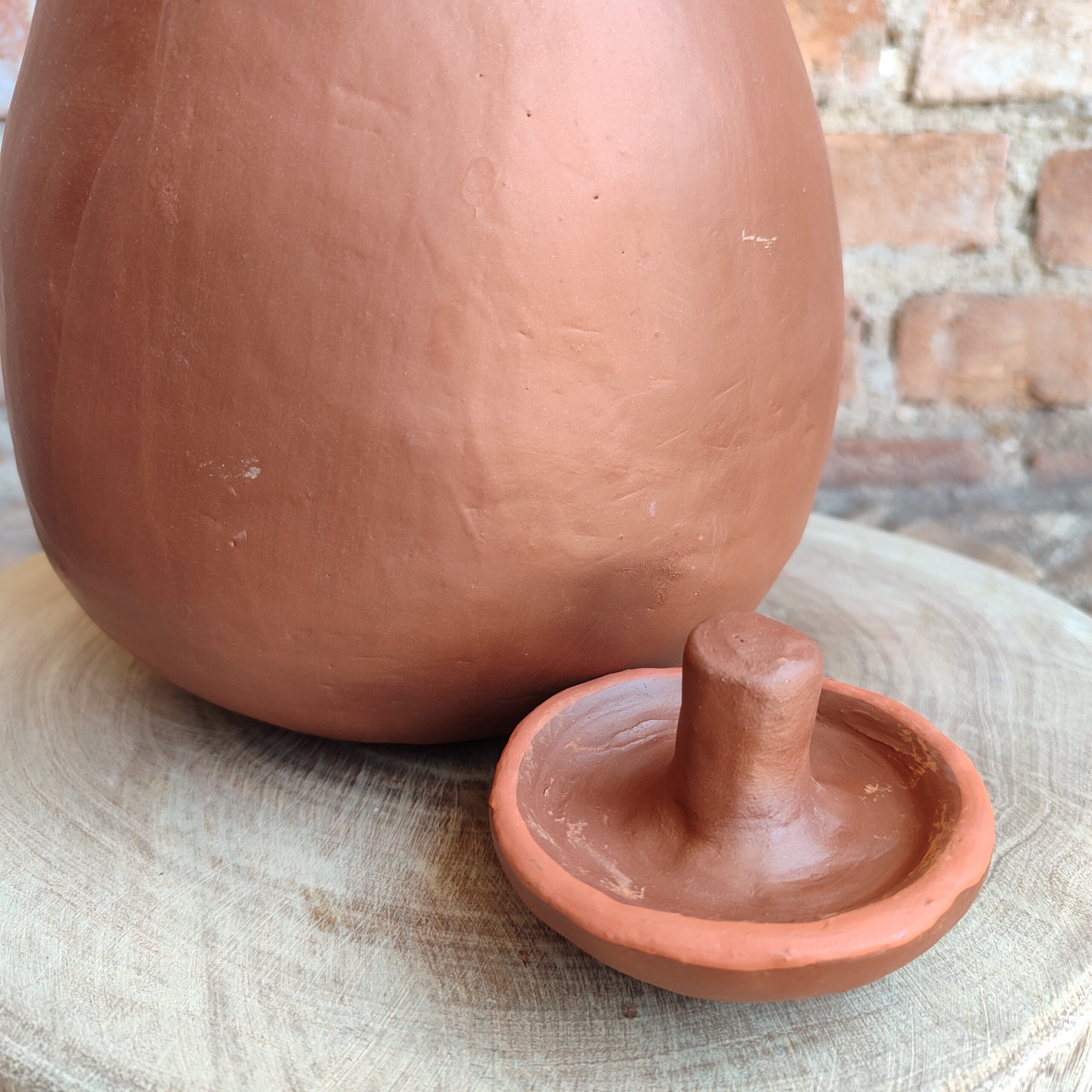 Moringa de cerâmica com tampa, com pintura do próprio barro, cores da natureza. Peça única. Confeccionada por artesãs do Vale do Jequitinhonha – MG. Peça decorativa.