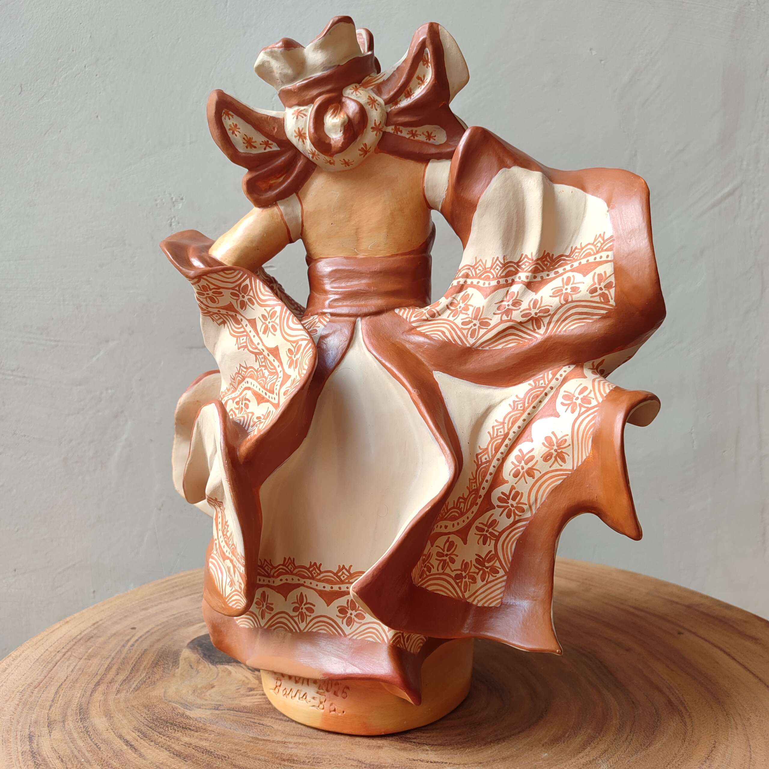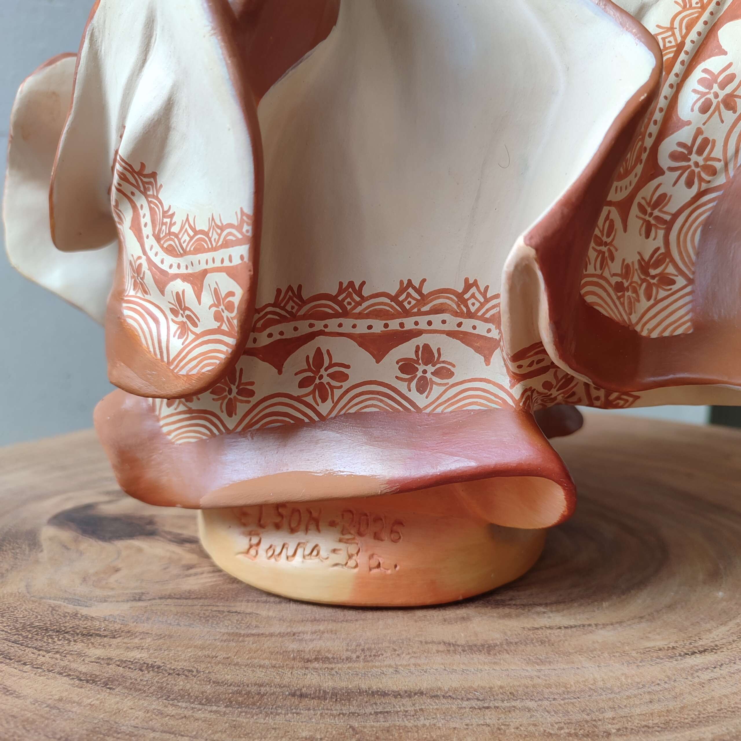 Escultura lindíssima decorativa de cerâmica, com pintura do próprio barro, duas cores de barro, o tauá mais avermelhado e a tabatinga, uma argila mais mole que dá o tom branco as esculturas. Orixá Iemanjá. Confeccionada pelo artesão Elson, discípulo de Mestre Gerar – Barra – BA.