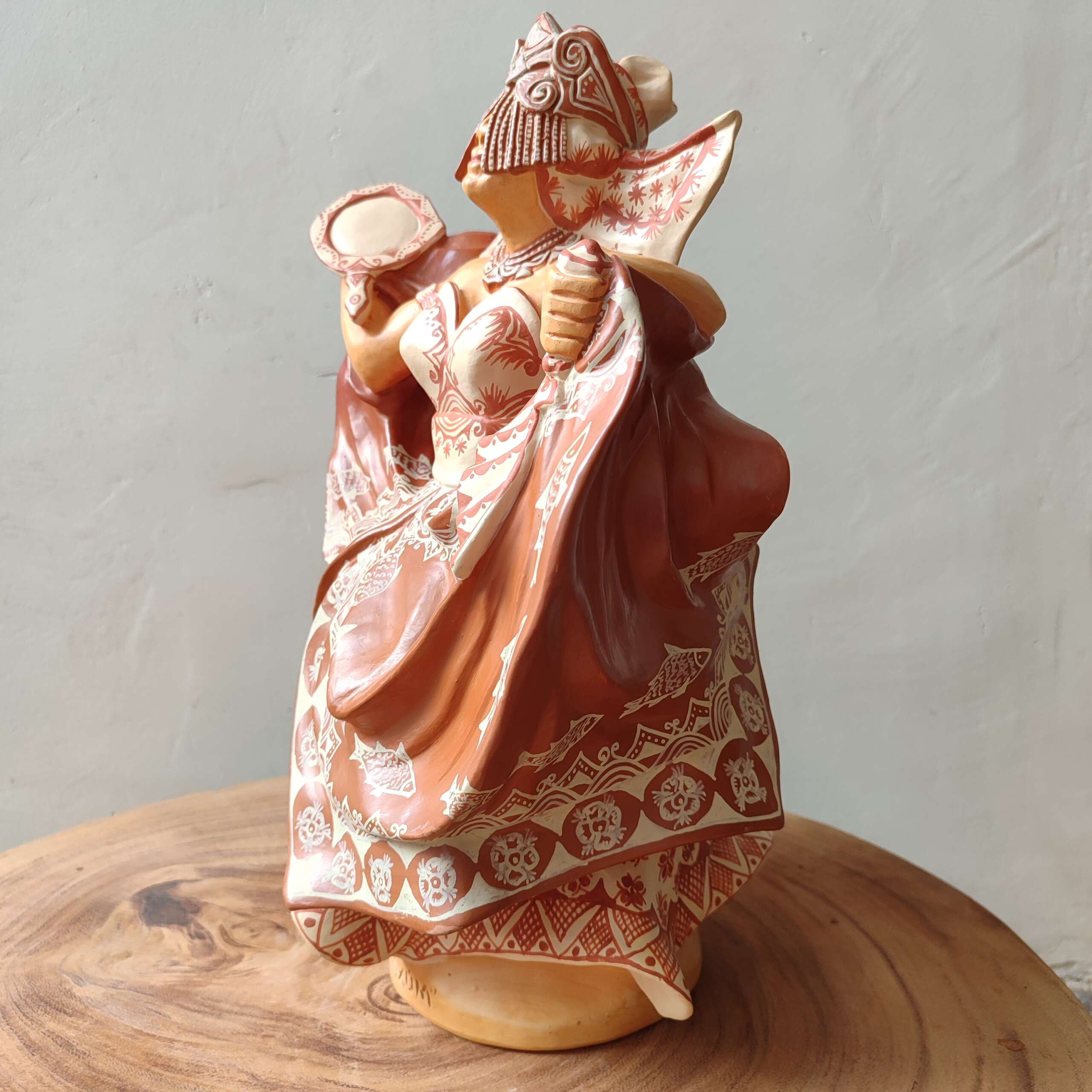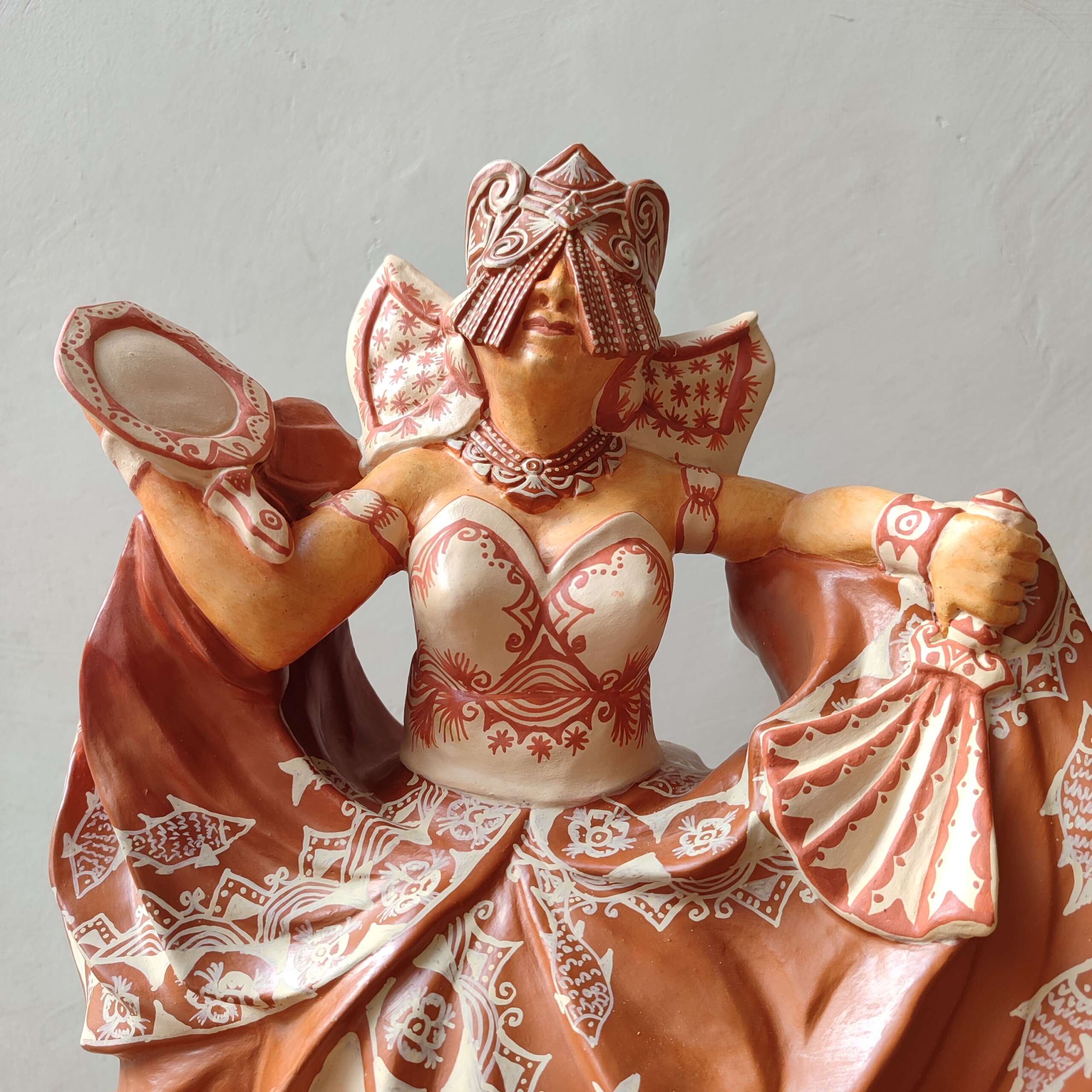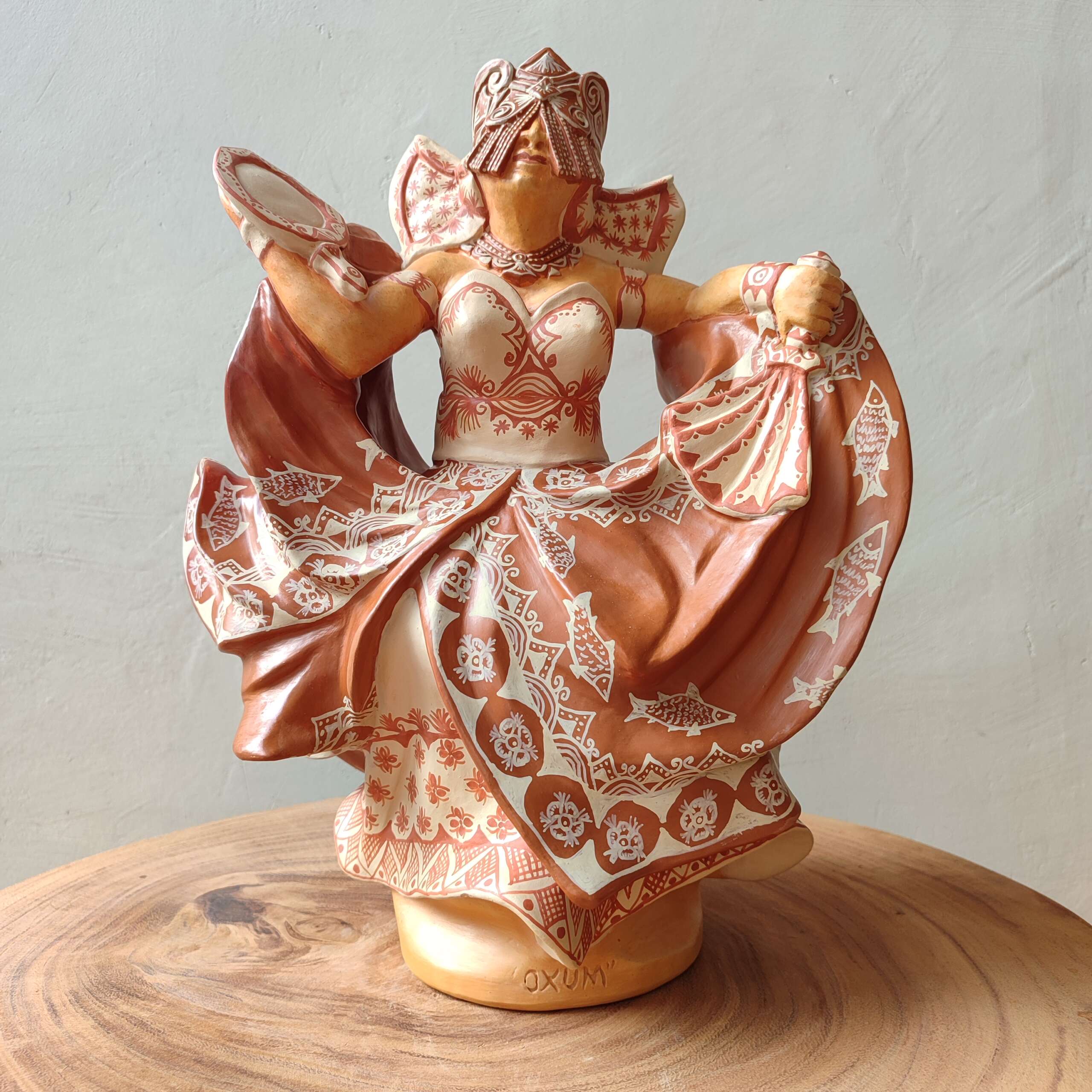 Escultura decorativa de cerâmica, com pintura do próprio barro misturado de dois rios diferentes. Orixá Oxum. Confeccionada pelo artesão Elson – Barra – BA.