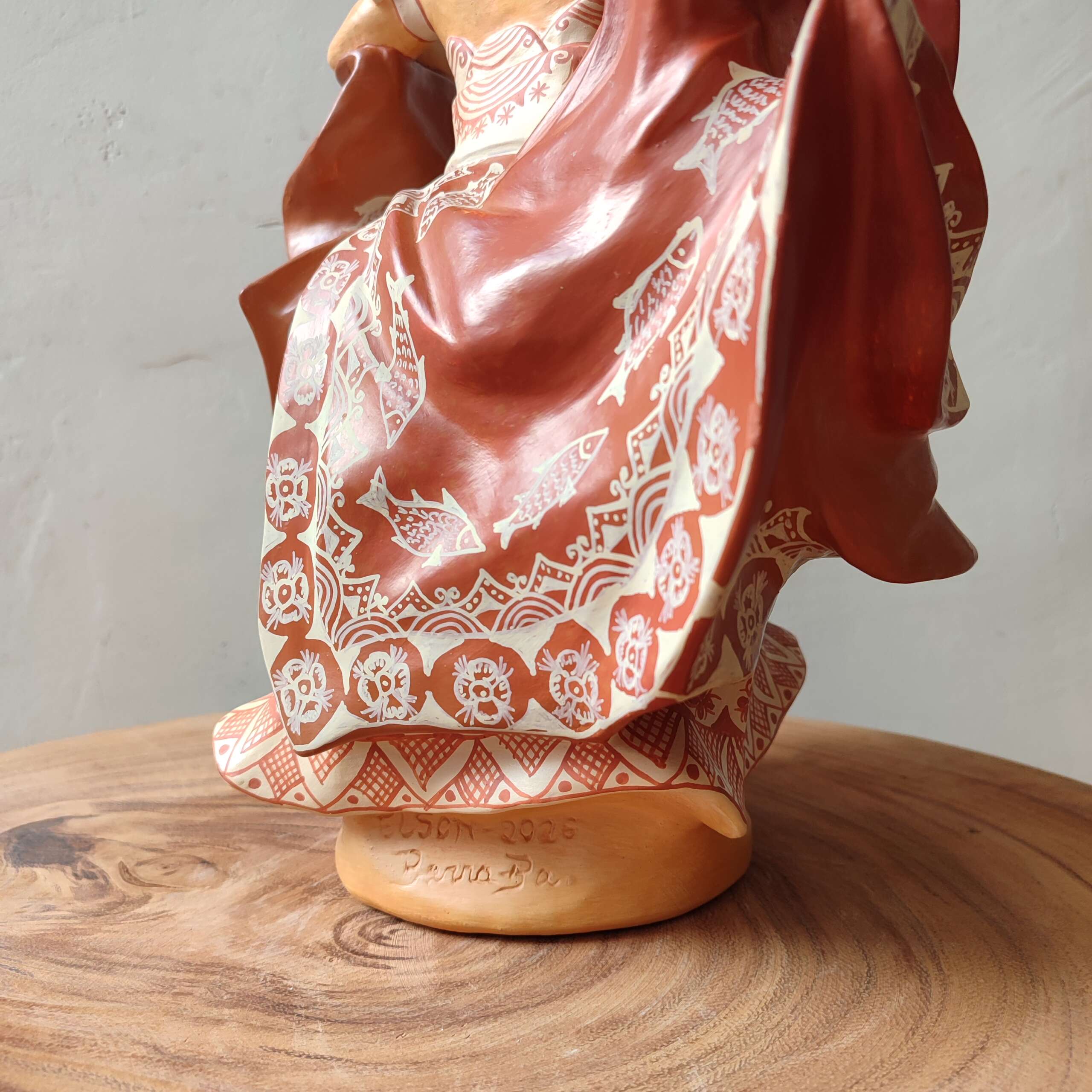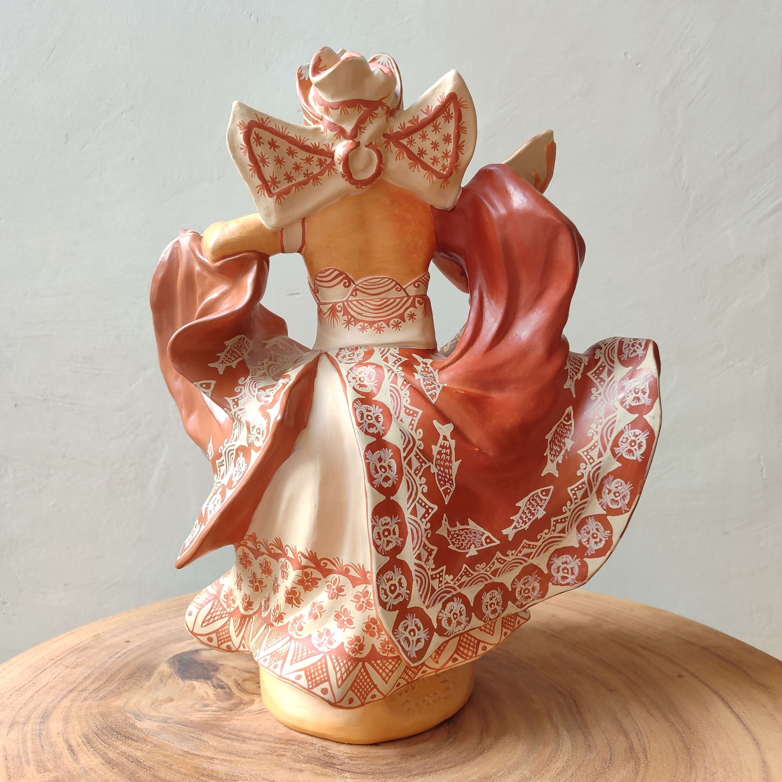 Escultura lindíssima decorativa de cerâmica, com pintura do próprio barro, duas cores de barro, o tauá mais avermelhado e a tabatinga, uma argila mais mole que dá o tom branco as esculturas. Orixá Oxum. Confeccionada pelo artesão Elson, discípulo de Mestre Gerar – Barra – BA.