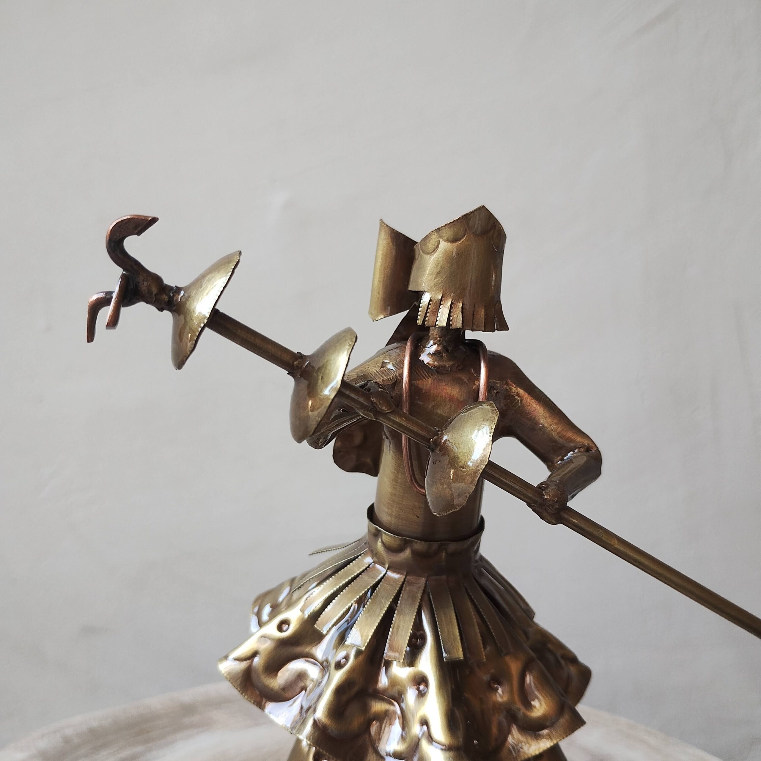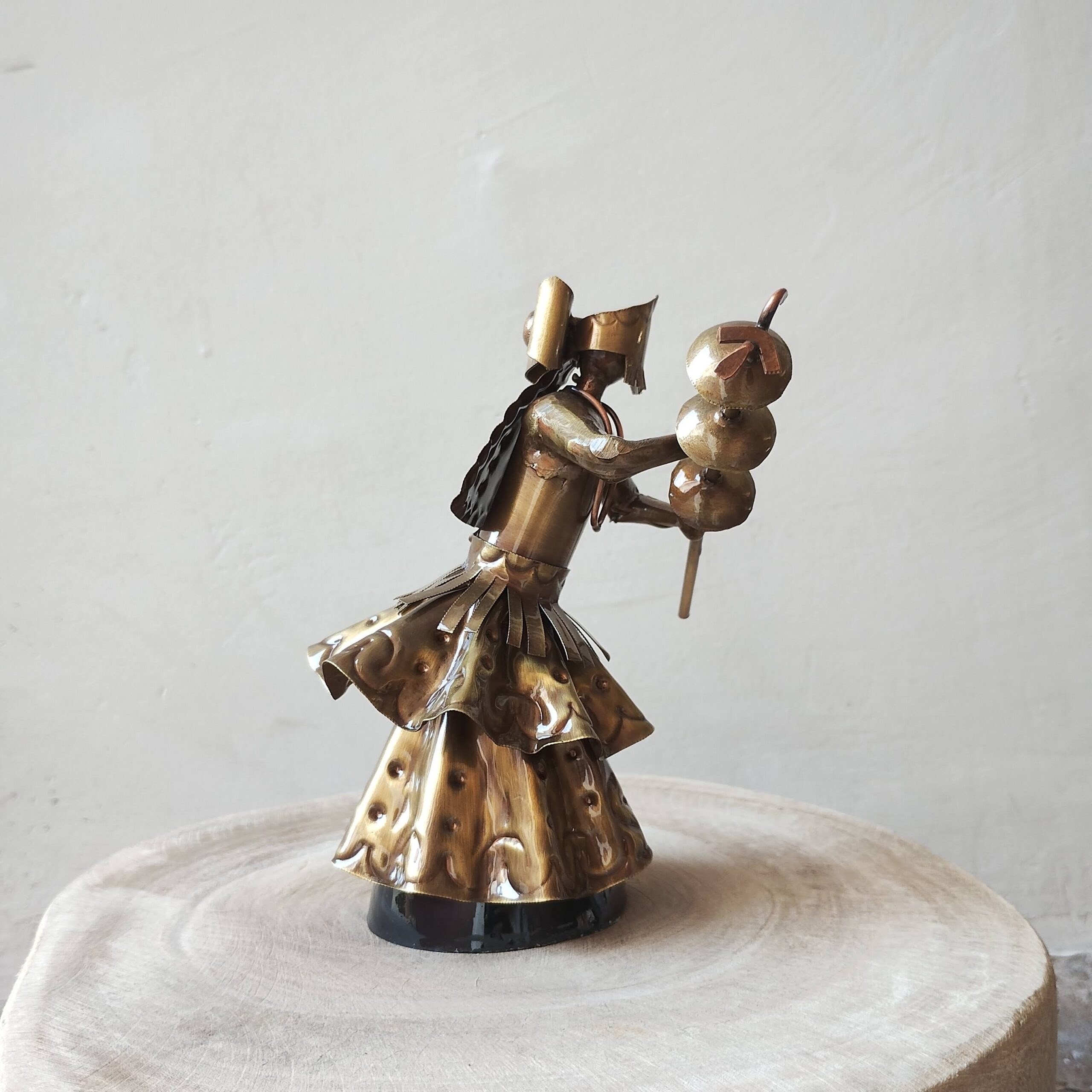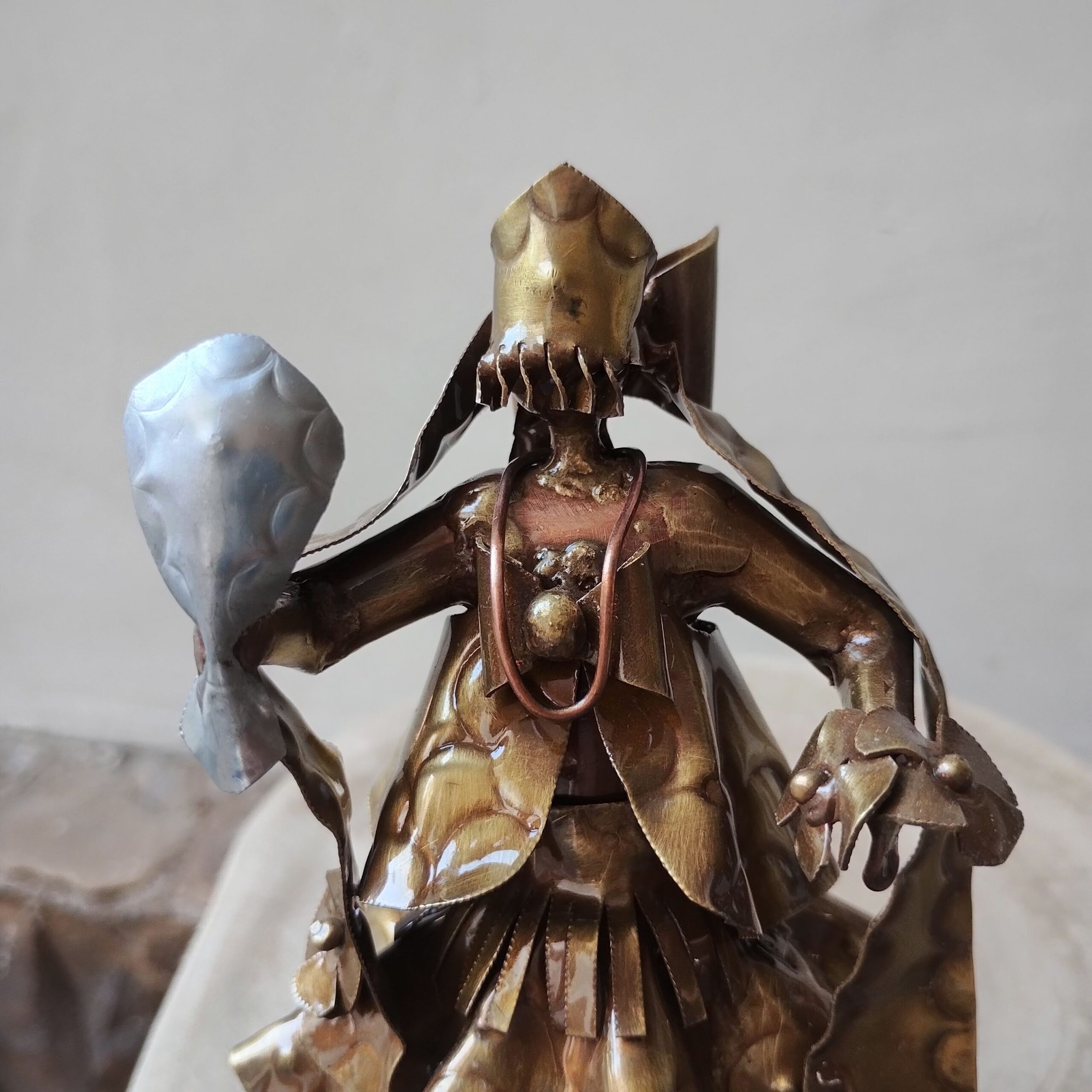 A confecção de orixás em latão é muito tradicional na Bahia, bem como a confecção de paramentas e outros itens vinculados às religiões de matriz africana nesse mesmo material. Confeccionada pela artesã Mônica – BA.