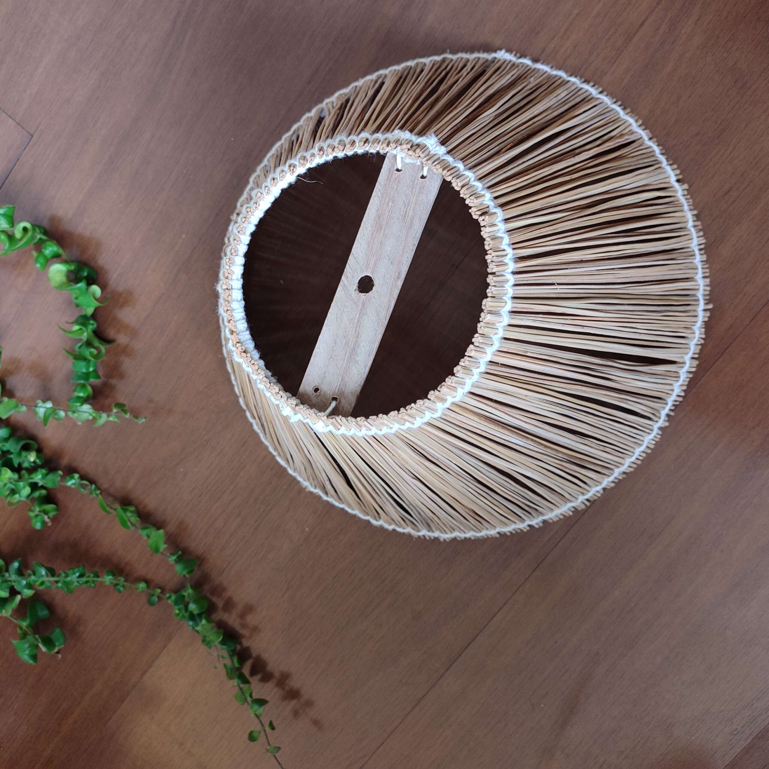 Pendente em talo de coqueiro, armação em arame e trançado com linha de algodão.