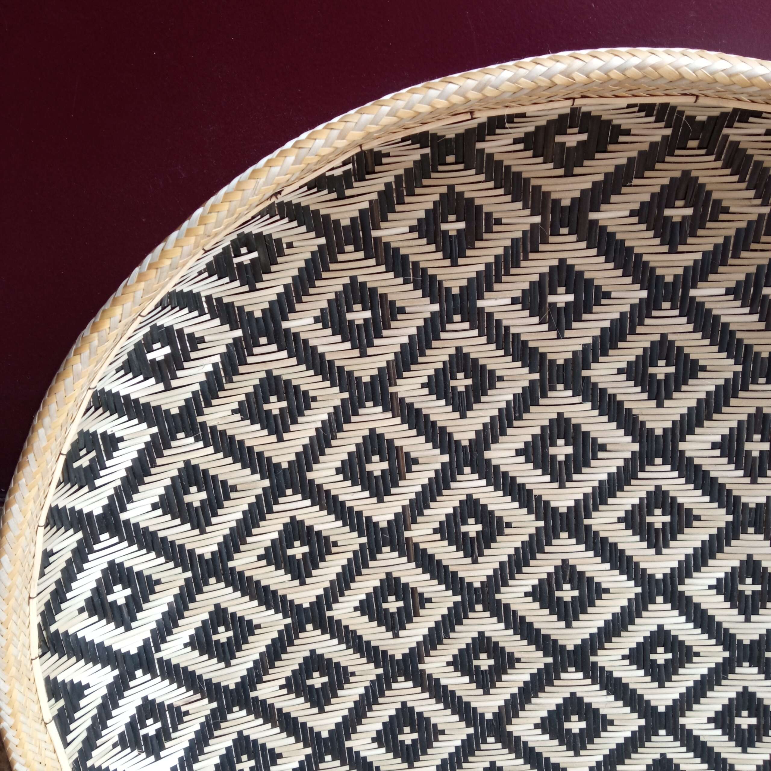 Balaio/peneira do Povo Baniwa, trançados em fibra de arumã e grafismos em tingimento natural – 25 cm diâmetro x 7 cm altura.