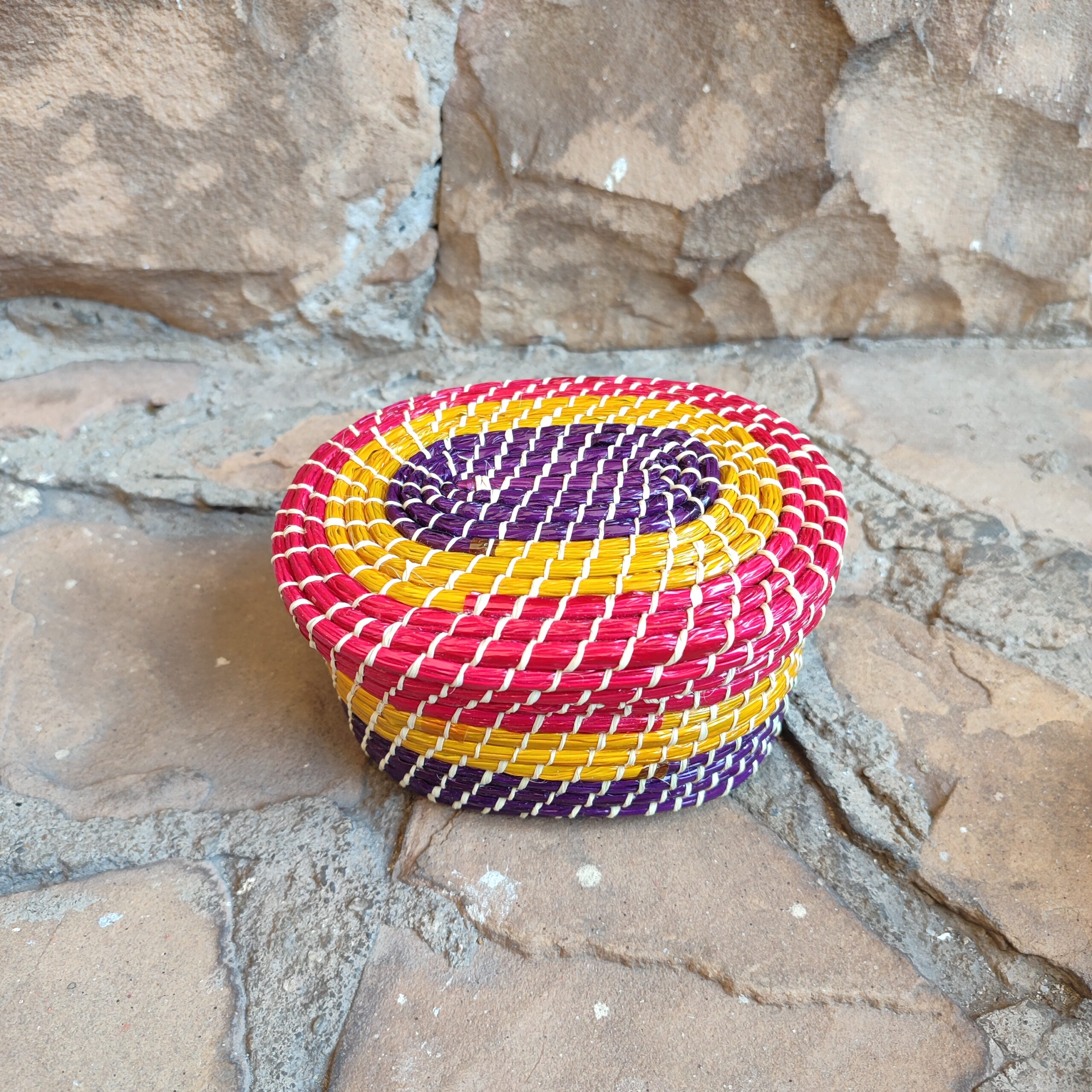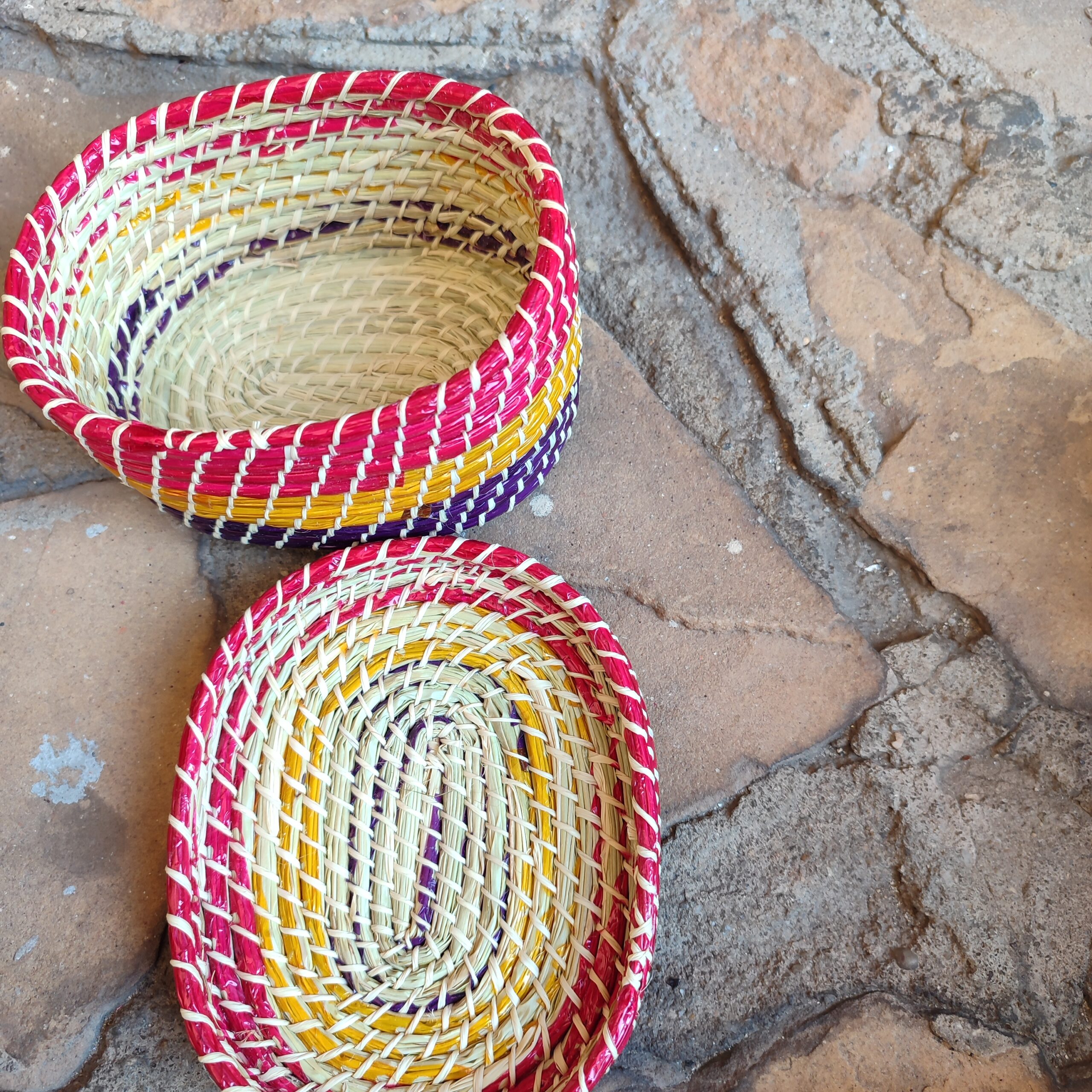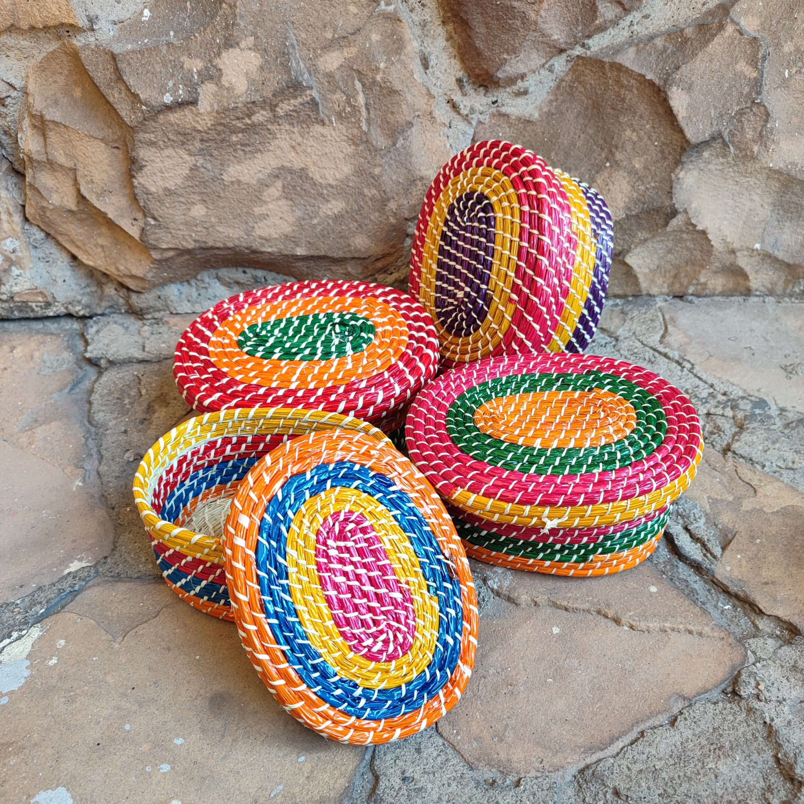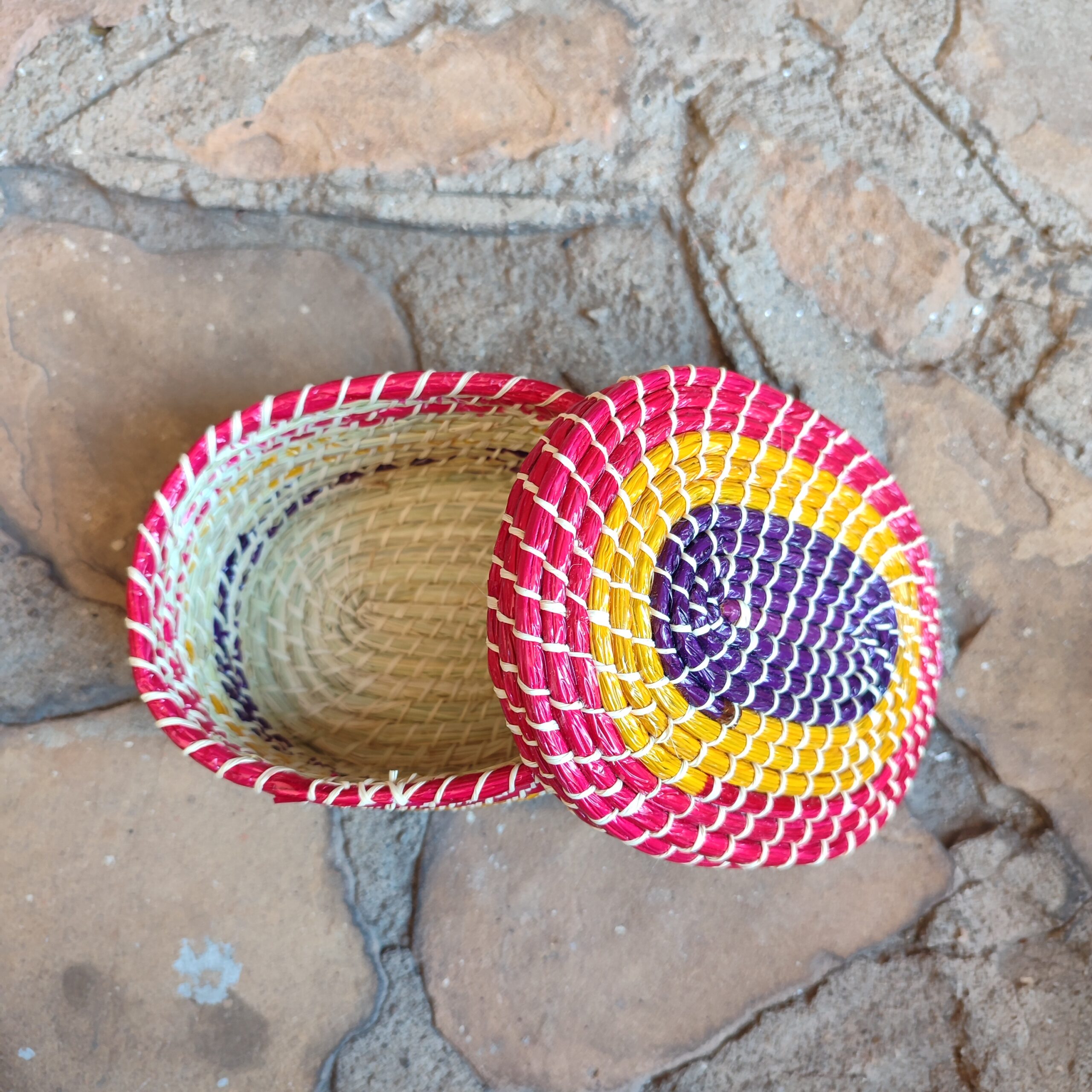 Porta-joia colorido feito à mão em palha de ouricuri ou licuri com tampa de encaixe. São ideais para guardar pequenos objetos ou usar de maneira decorativa.