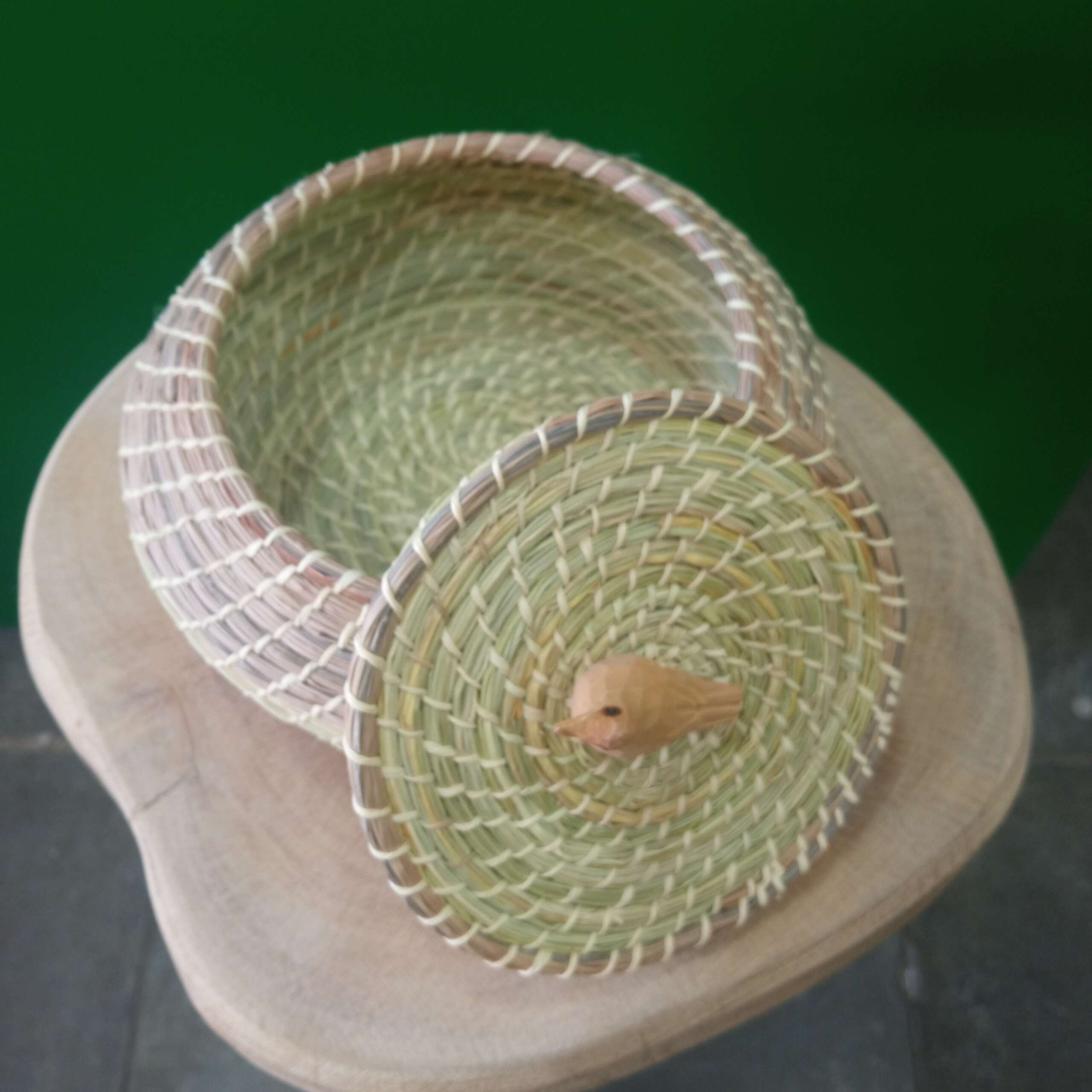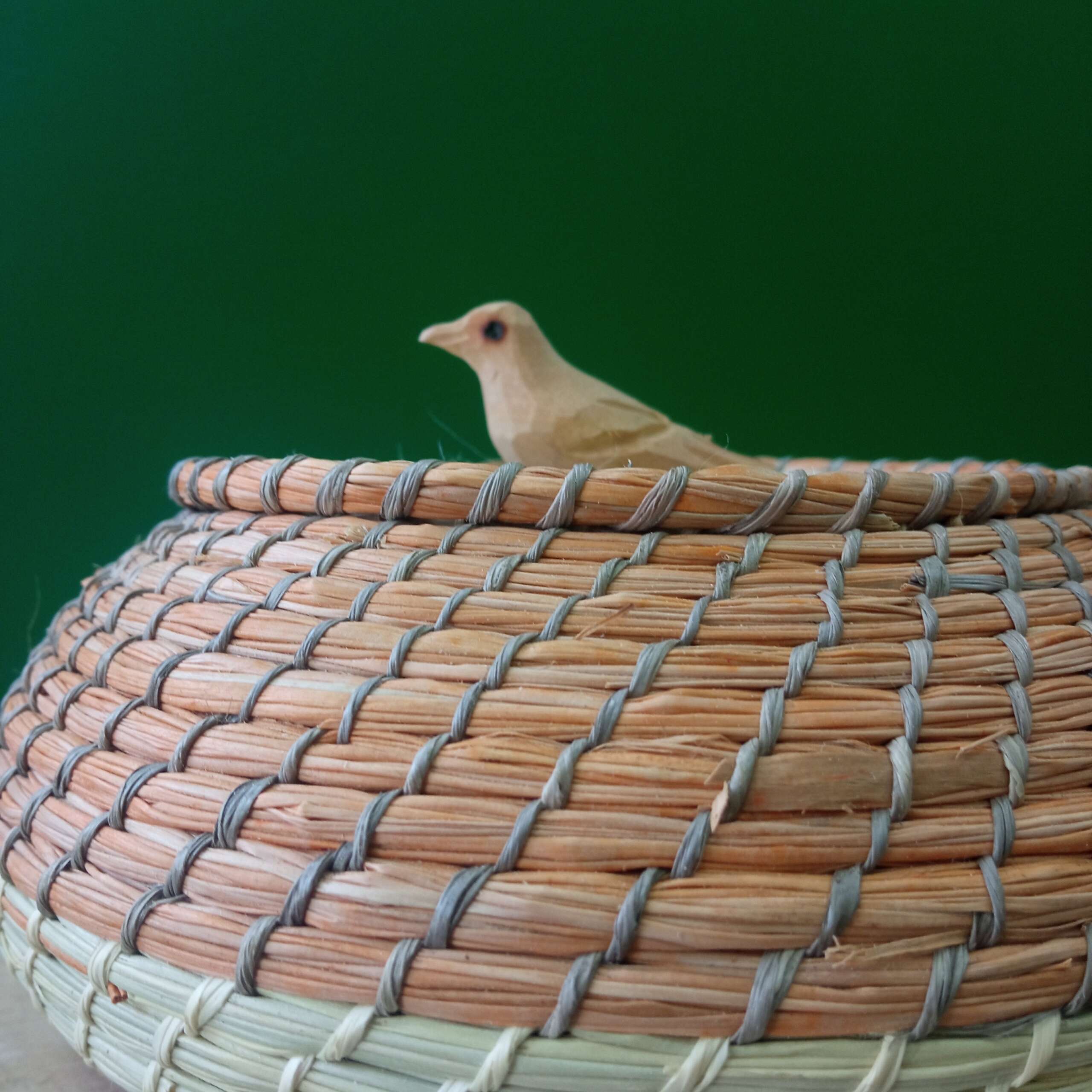 Porta jóia em palha de ouricuri com pássaro de madeira