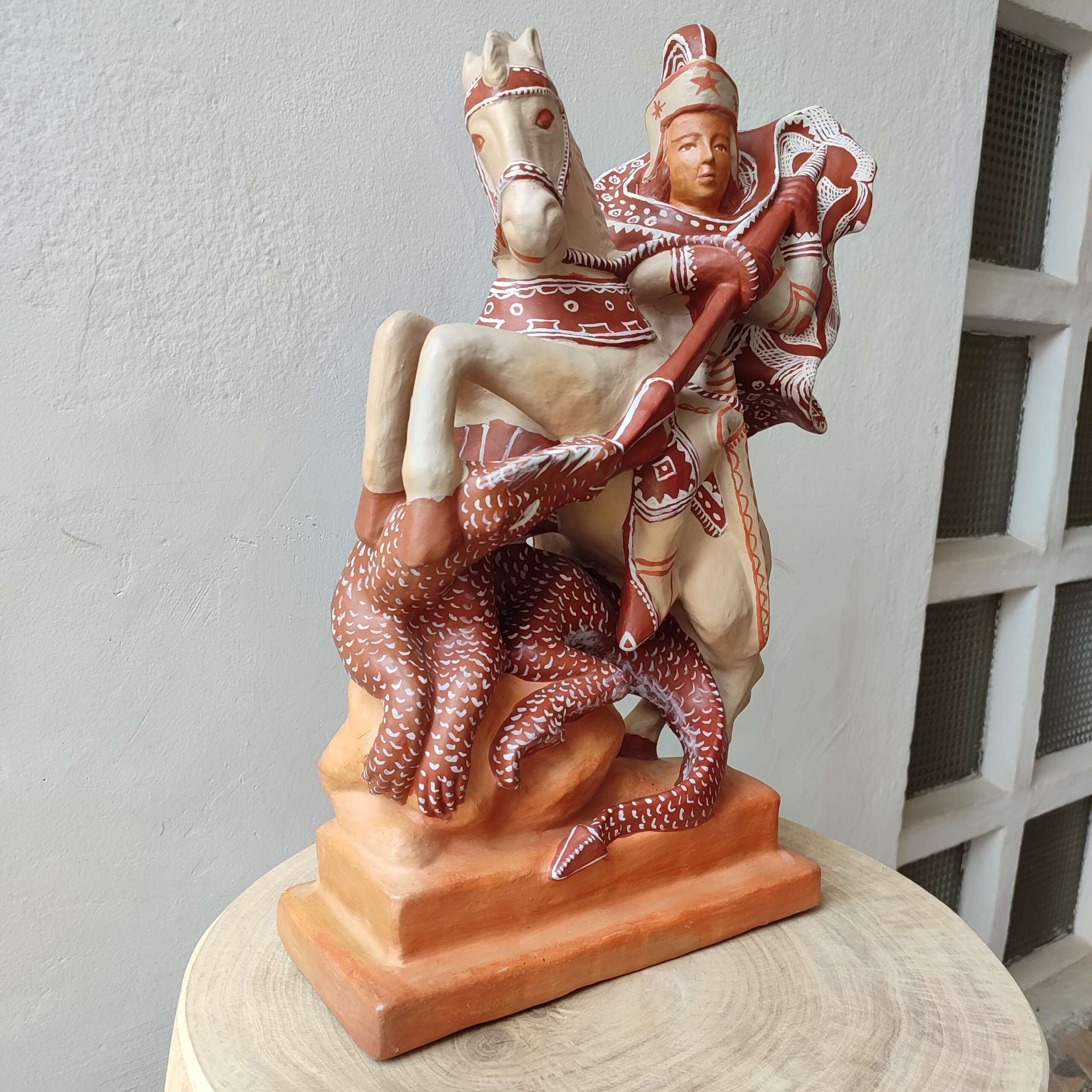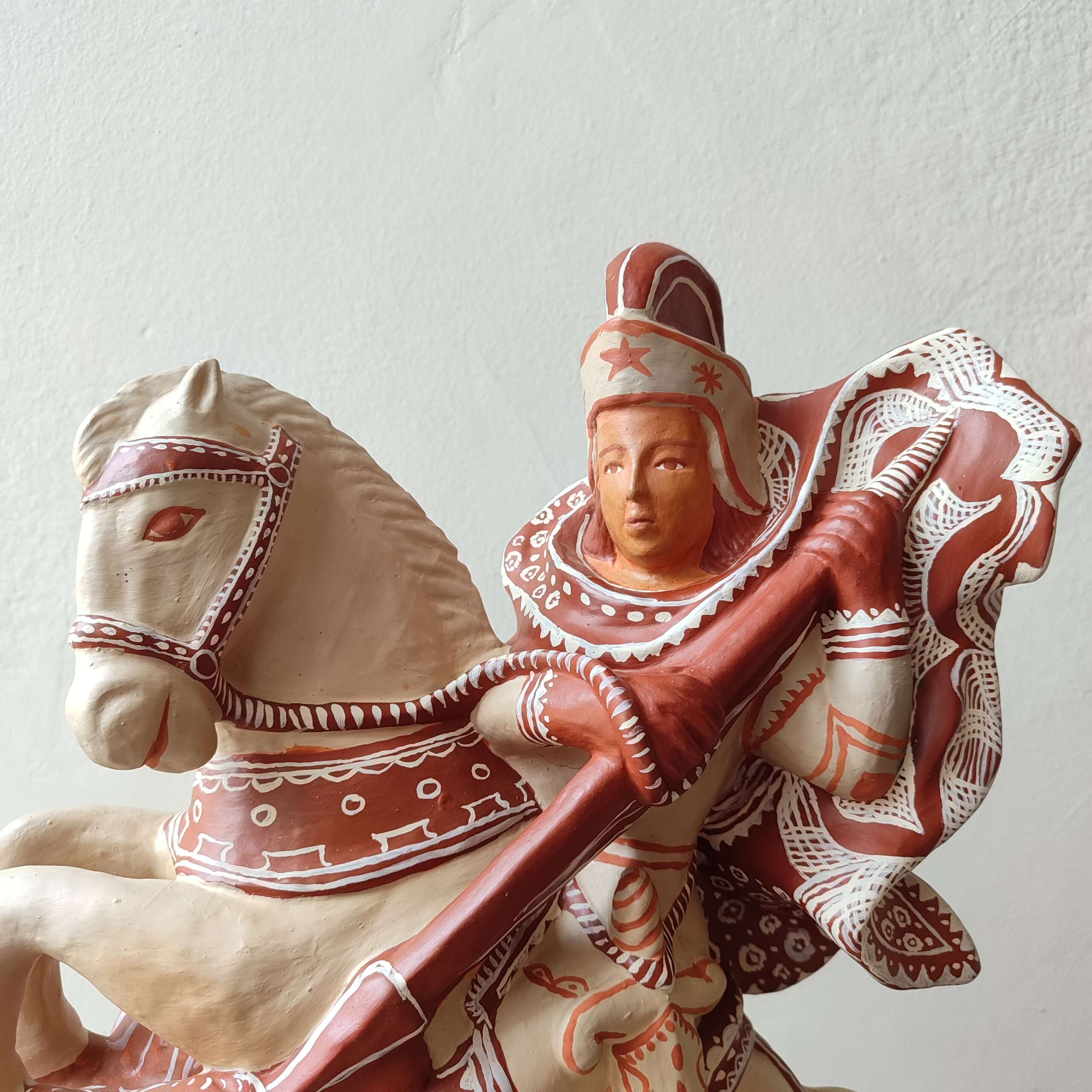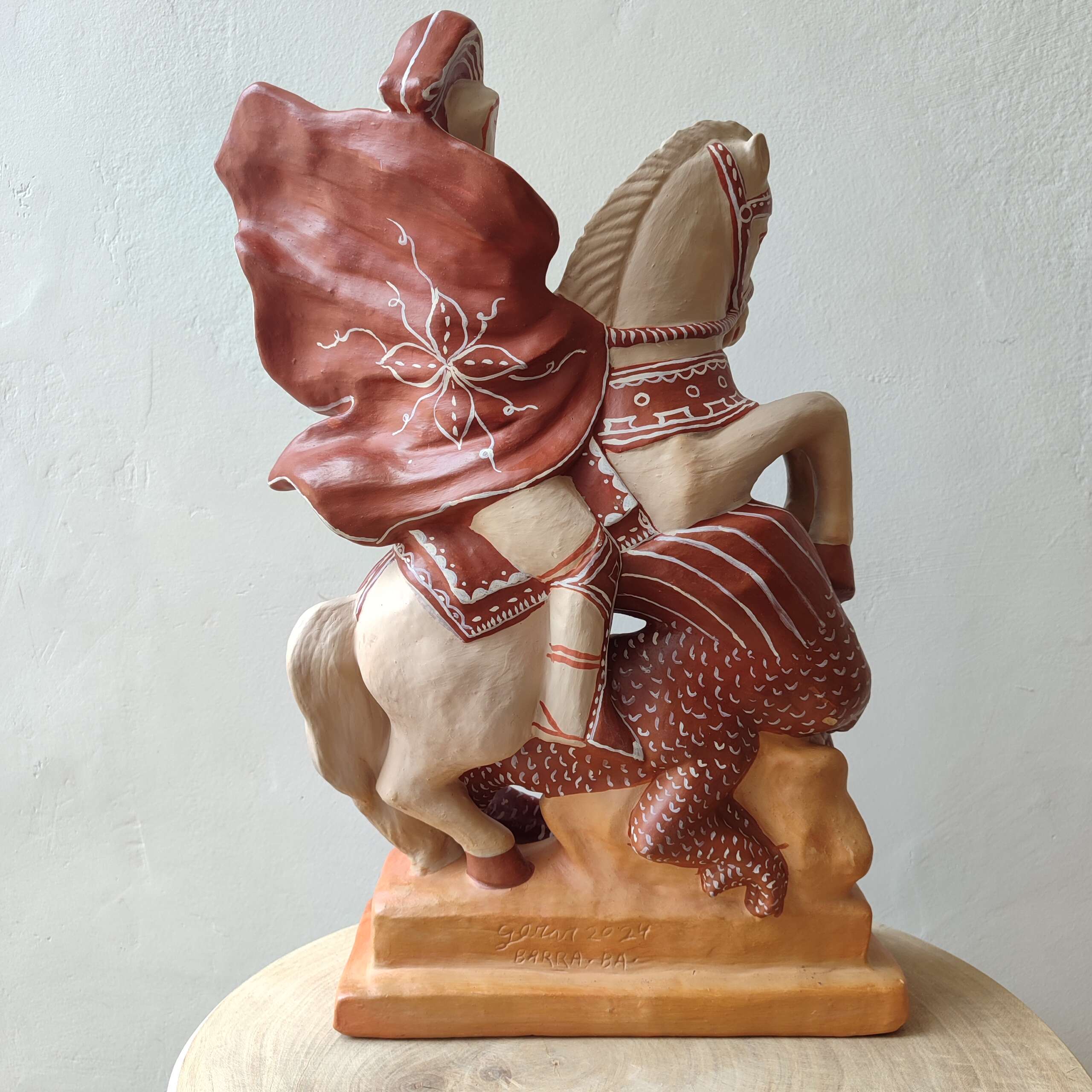 Escultura lindíssima decorativa de cerâmica, com pintura do próprio barro, duas cores de barro, o tauá mais avermelhado e a tabatinga, uma argila mais mole que dá o tom branco as esculturas. São Jorge. Confeccionada pelo Mestre Gerar – Barra – BA.