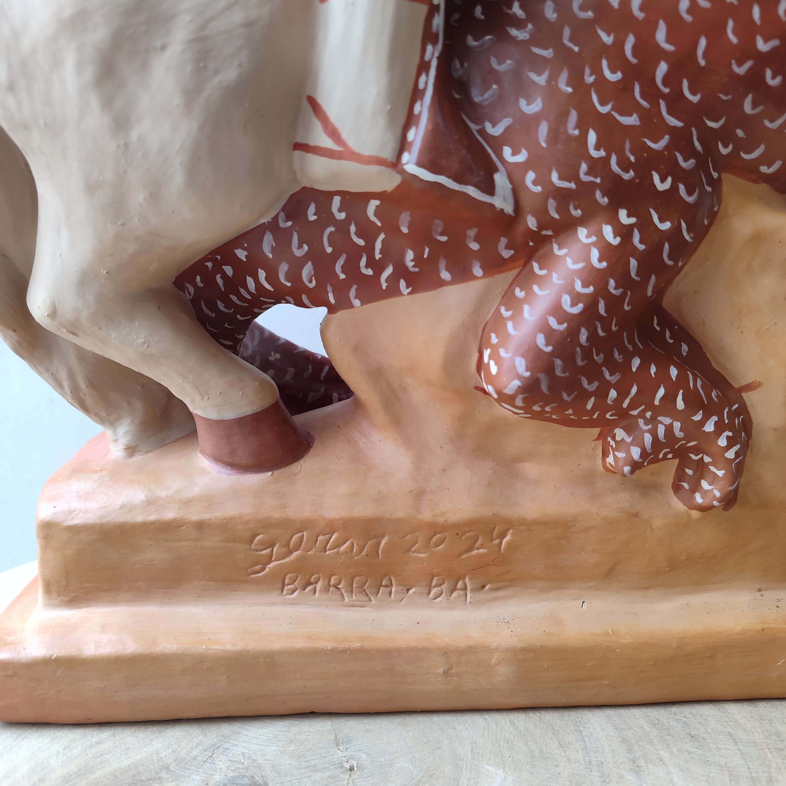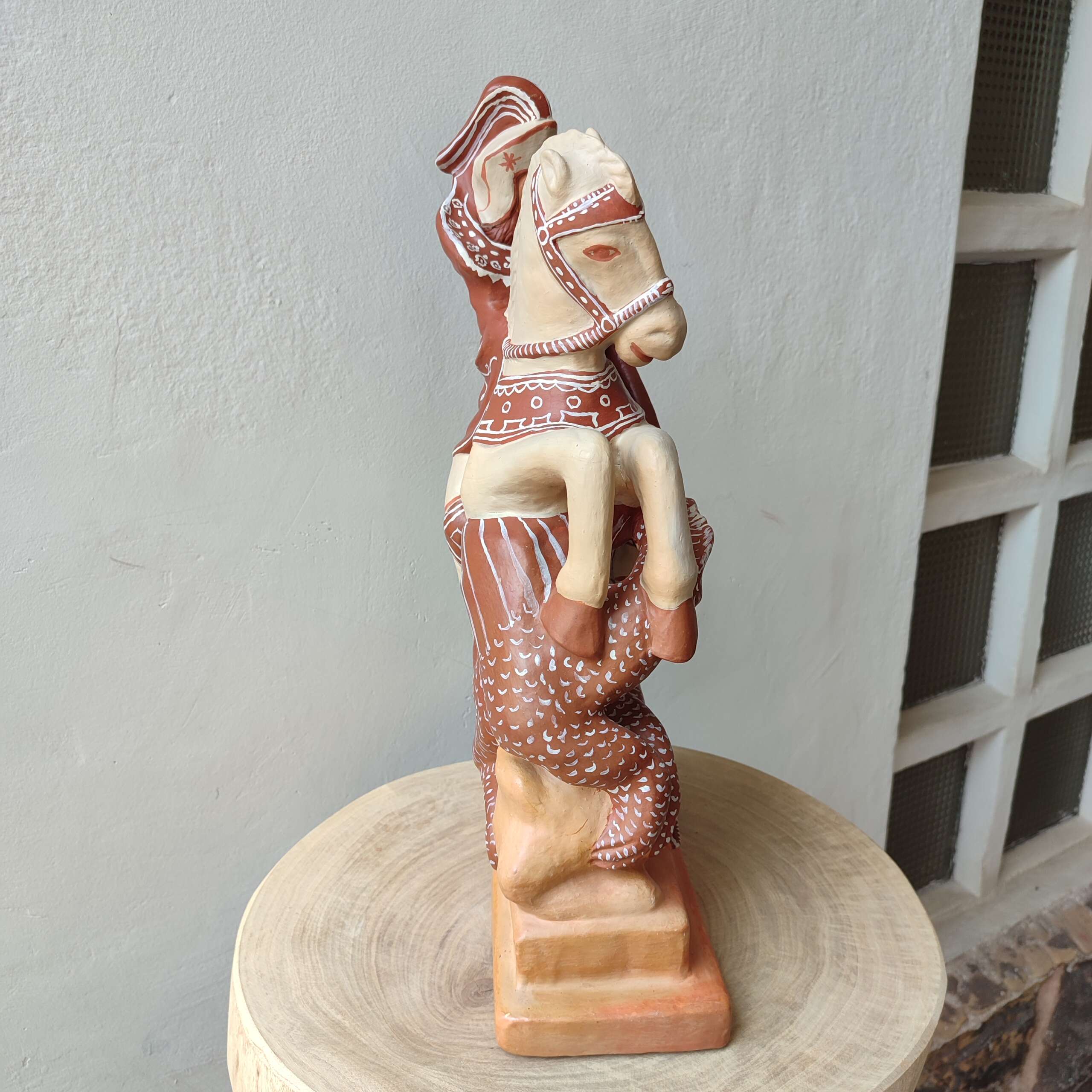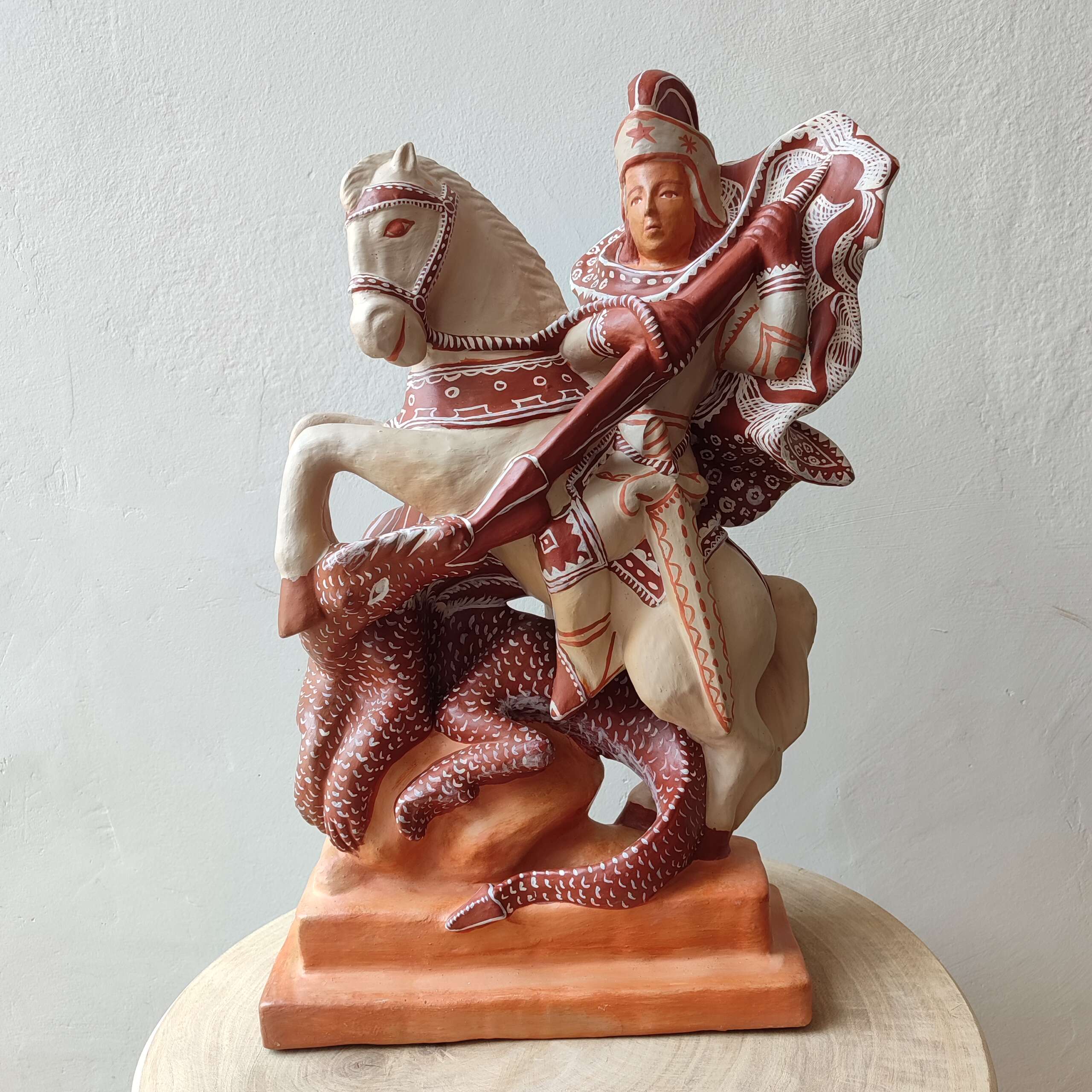 Escultura lindíssima decorativa de cerâmica, com pintura do próprio barro, duas cores de barro, o tauá mais avermelhado e a tabatinga, uma argila mais mole que dá o tom branco as esculturas. São Jorge. Confeccionada pelo Mestre Gerar – Barra – BA.