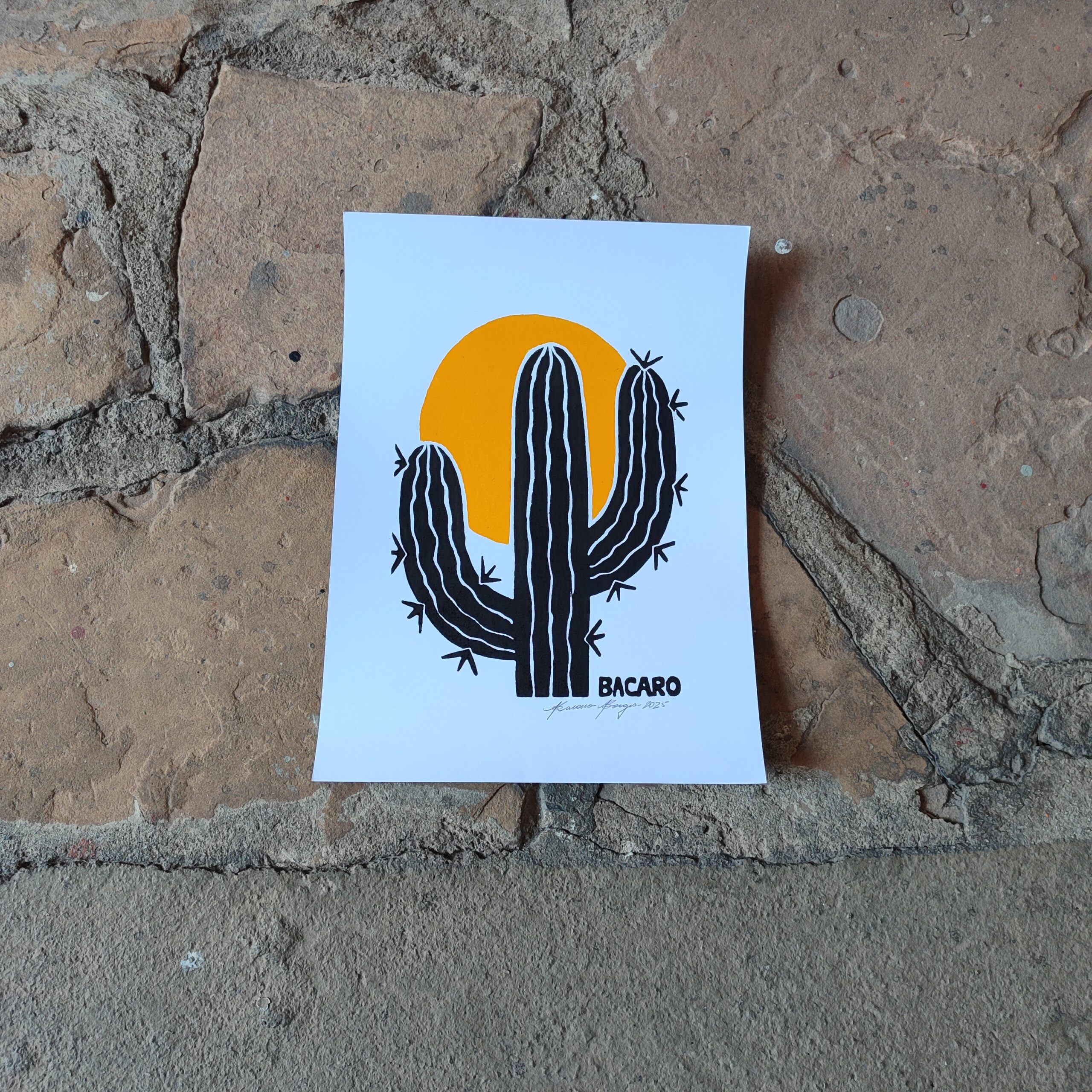 Xilogravura Bacaro Borges P – Cacto e Sol Amarelo