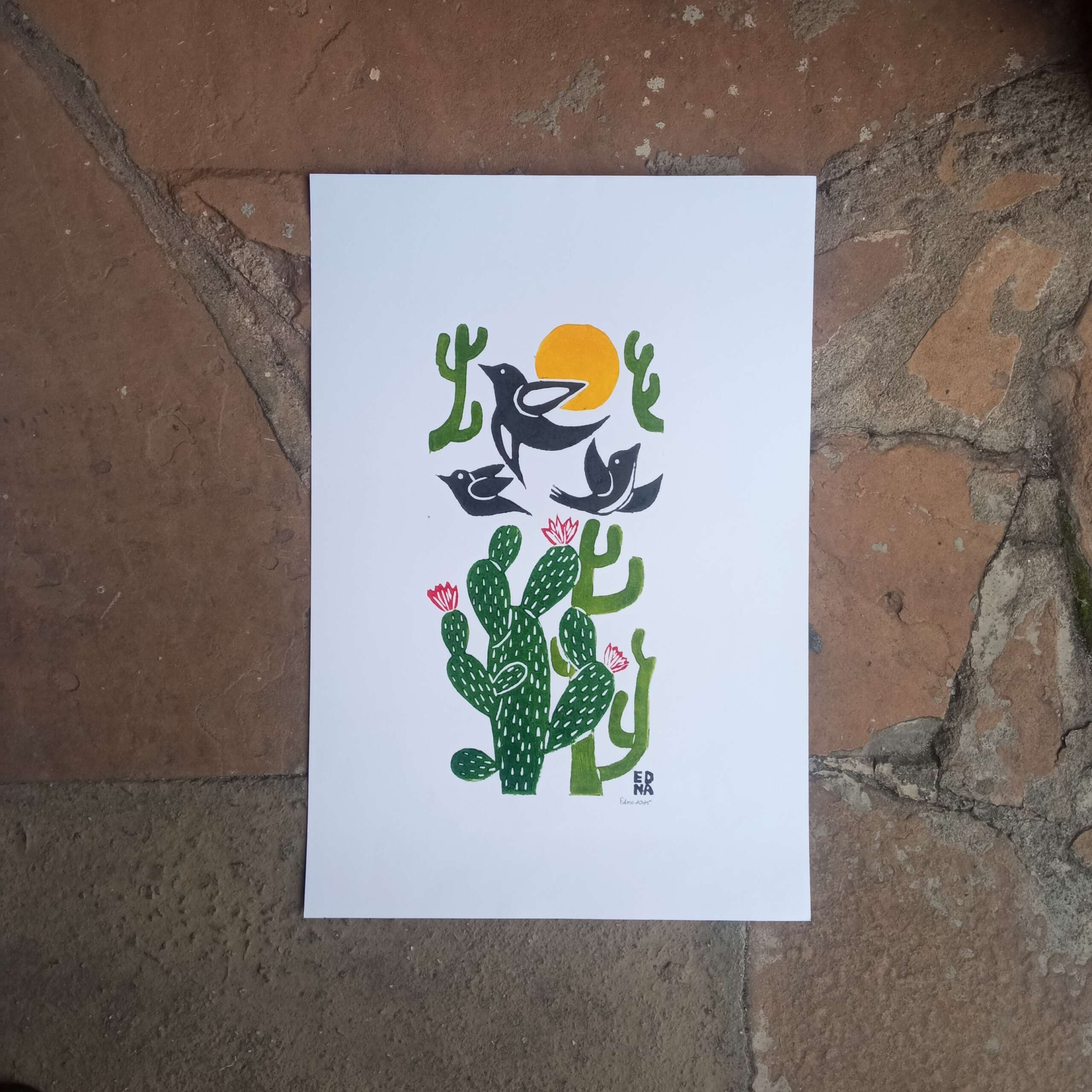 Xilogravura da artista Edna Silva (PE), nora do Mestre J Borges. Edna é uma das responsáveis pela produção e administração do Memorial J. Borges e tem sua própria produção autoral, cuidando de todo o processo de criação da xilogravura, desde o entalhe, a pintura e impressão.